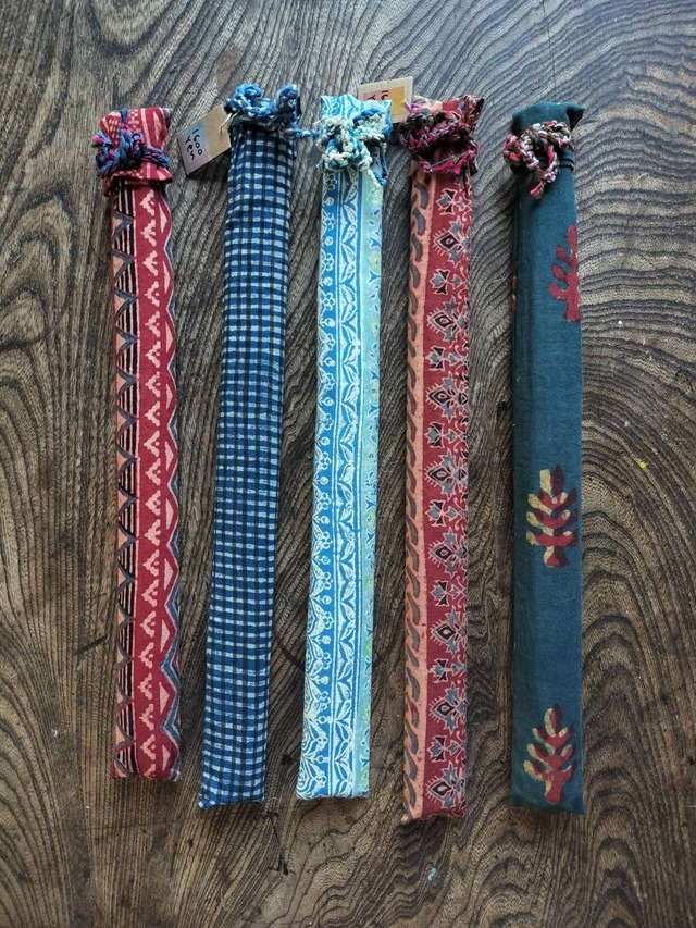 布工房一本さんの肩たたき棒。インドのブロックプリントの布が素敵です。中に入っているのは、新聞紙を固く丸めた棒たちです。とにかく手仕事の作品。現在あるのは、左から2番目のチェック柄のみ。