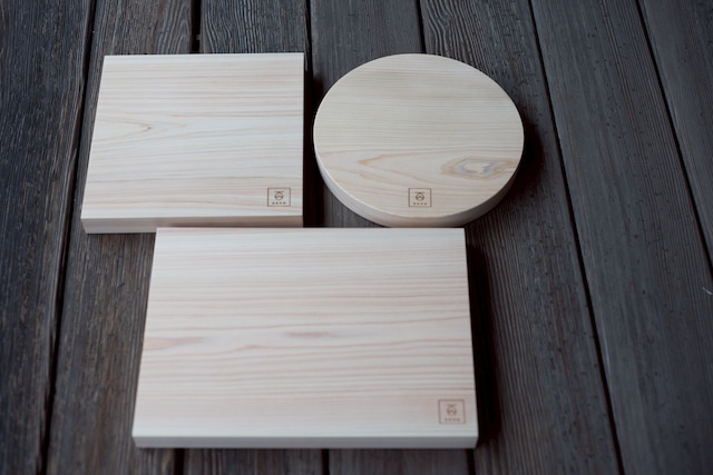 地元日向市の百年木材さんのこだわりのまな板。樹齢百年越えの国産ヒノキが材料です。また板はそれぞれ日本的な柄をイメージさせるカタチで、価格もそれぞれちがいます。巴(丸型)サイズ直径24、厚み3cm。