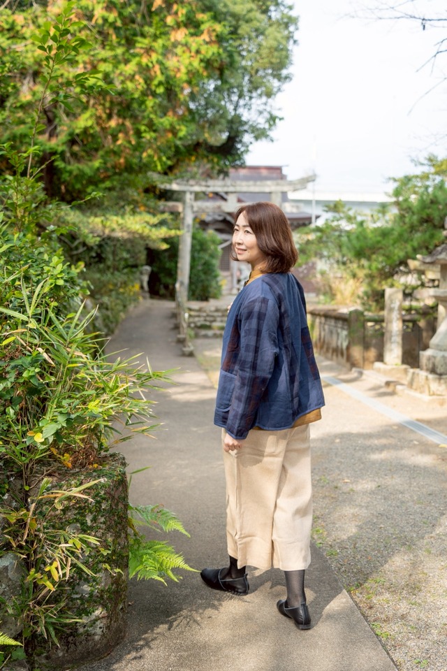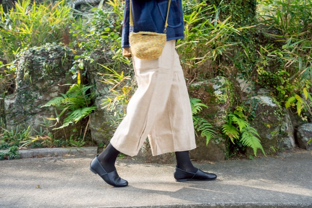 大きなポケットが前後にふたつずつ。手織りの厚地の生地と、ポケット、コクーンシルエットがポイントの短めパンツ。モデル身長160cm。着丈85cm。ウエスト64-77cm。綿100%。