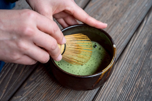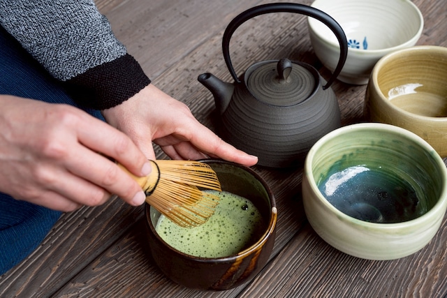 このはな窯作品。実際にお抹茶をたてている碗はすでにお店のカフェで使用しているものです。販売品は薄緑色と茶色、あざみの絵付けのものの3点です。小鉢としてもお使いいただけます。