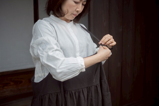日々ノ着作品。フリーサイズの綿麻100%。肩紐の前の方で紐の長さを調節できます。(丈は自由に変えられます。)ポケット2個ついてます。エプロンとしてだけでなく、ワンピースとして着用していただけます。