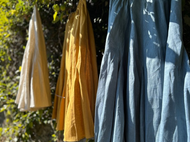 SUEMI 作品。リネン素材のフレアが贅沢なスカート。ウエスト総ゴム。着丈85cm。夏には、Tシャツやカットソー1枚と合わせれば、もうシンプルにおしゃれにまとまるリネンをふんだんに使ったスカートです。丈の長さなど調整いたします。