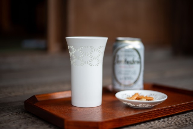 光を通して文様が浮かび上がります。ビールにぴったりのサイズ感。サイズ直径7.6✖️高さ12cm。容量260ml。