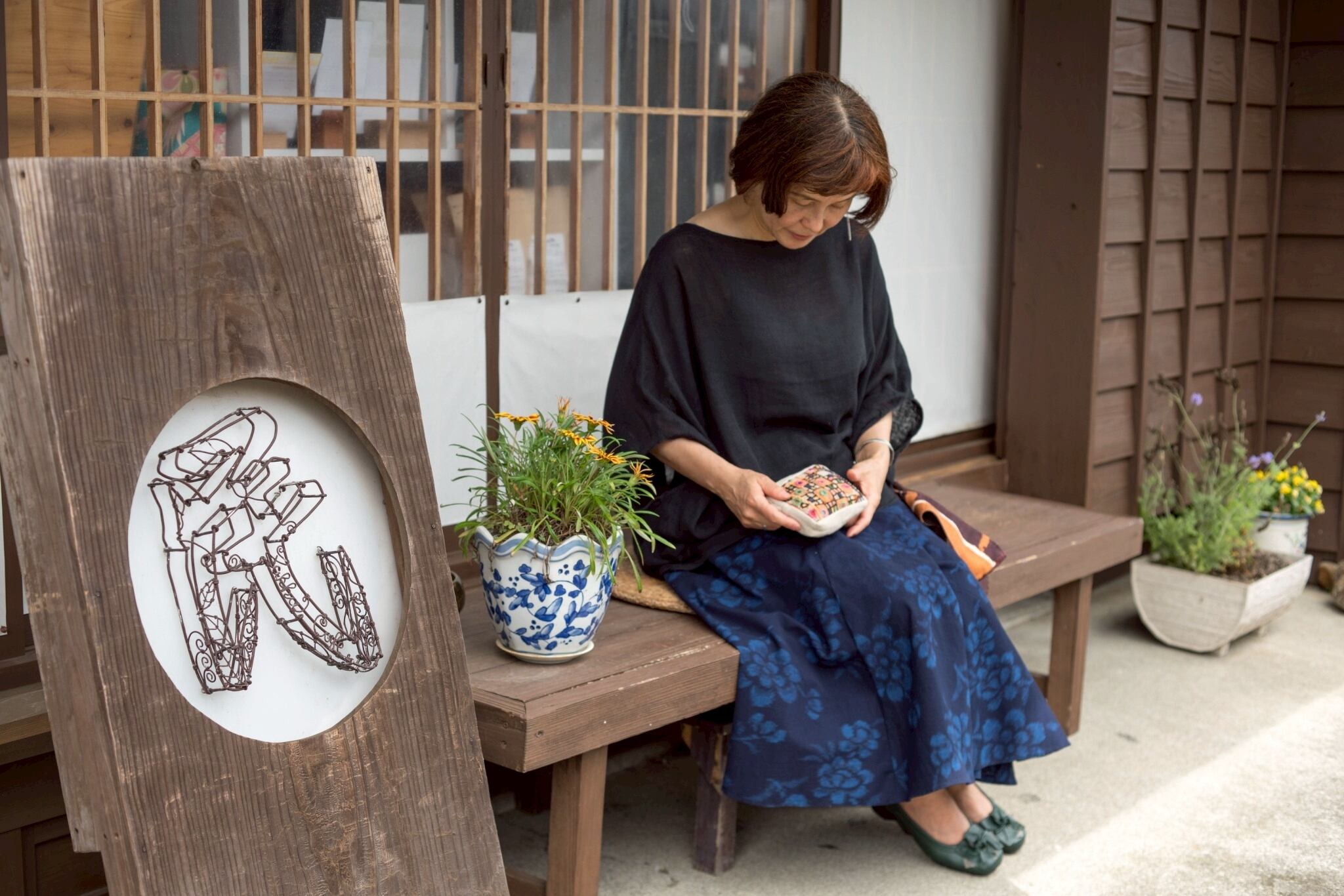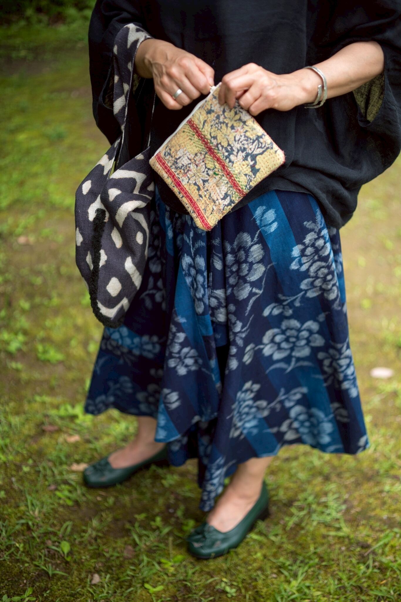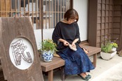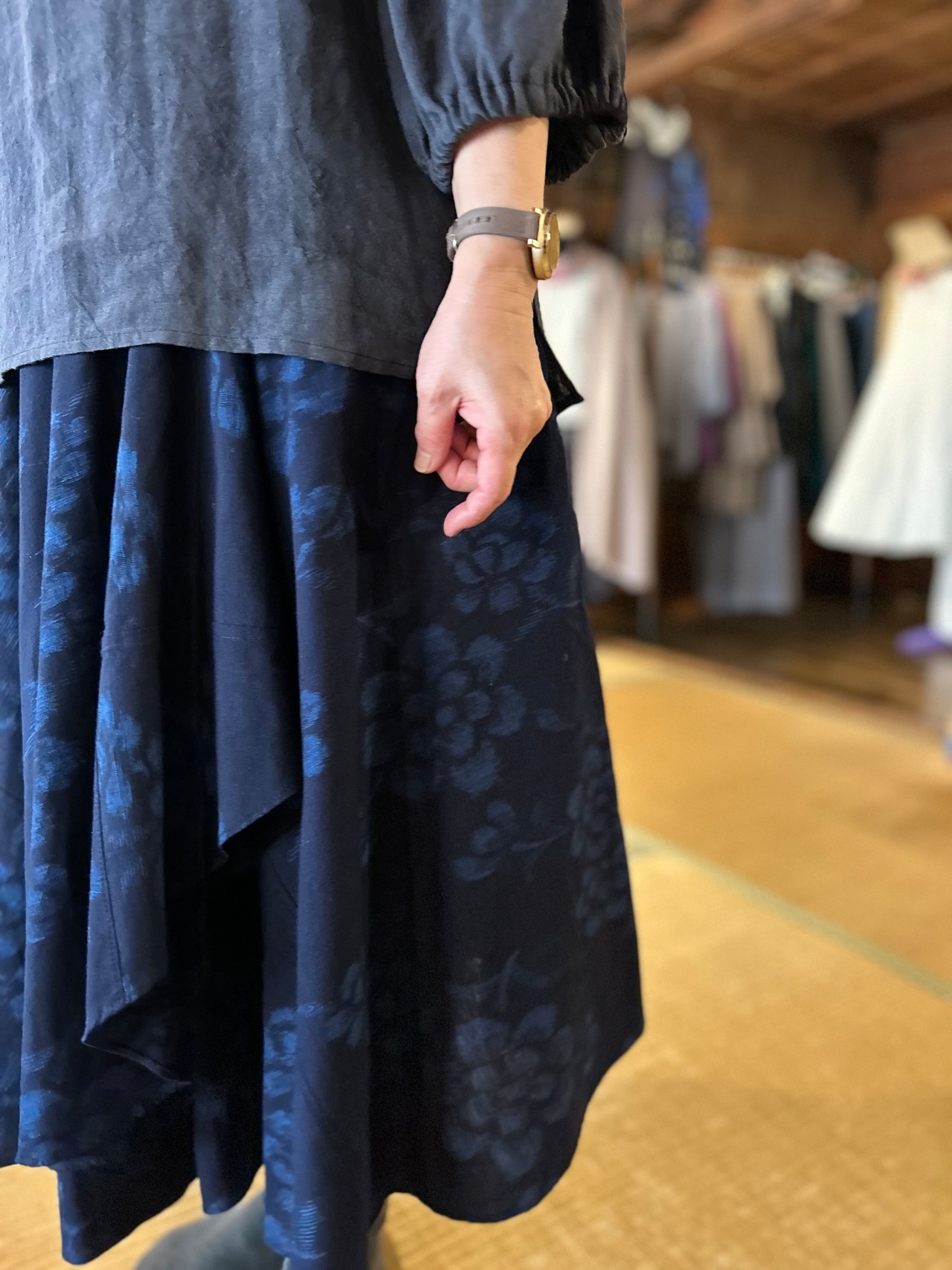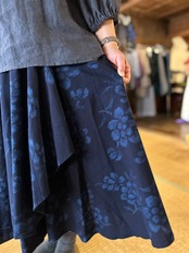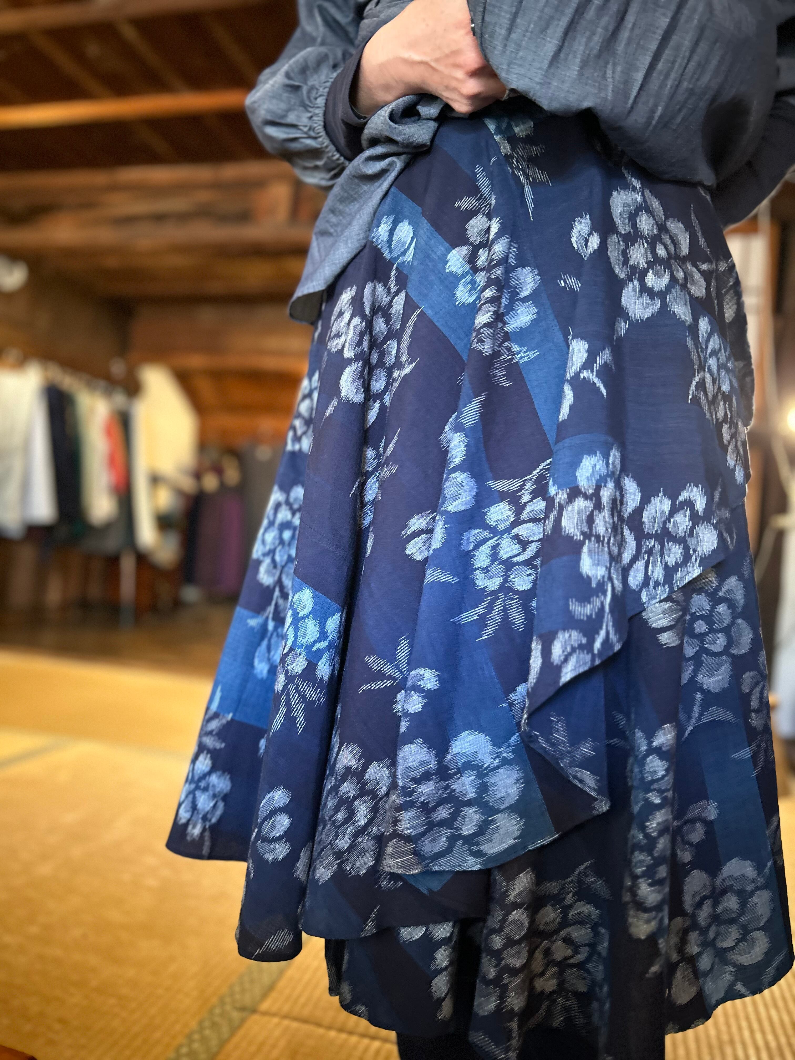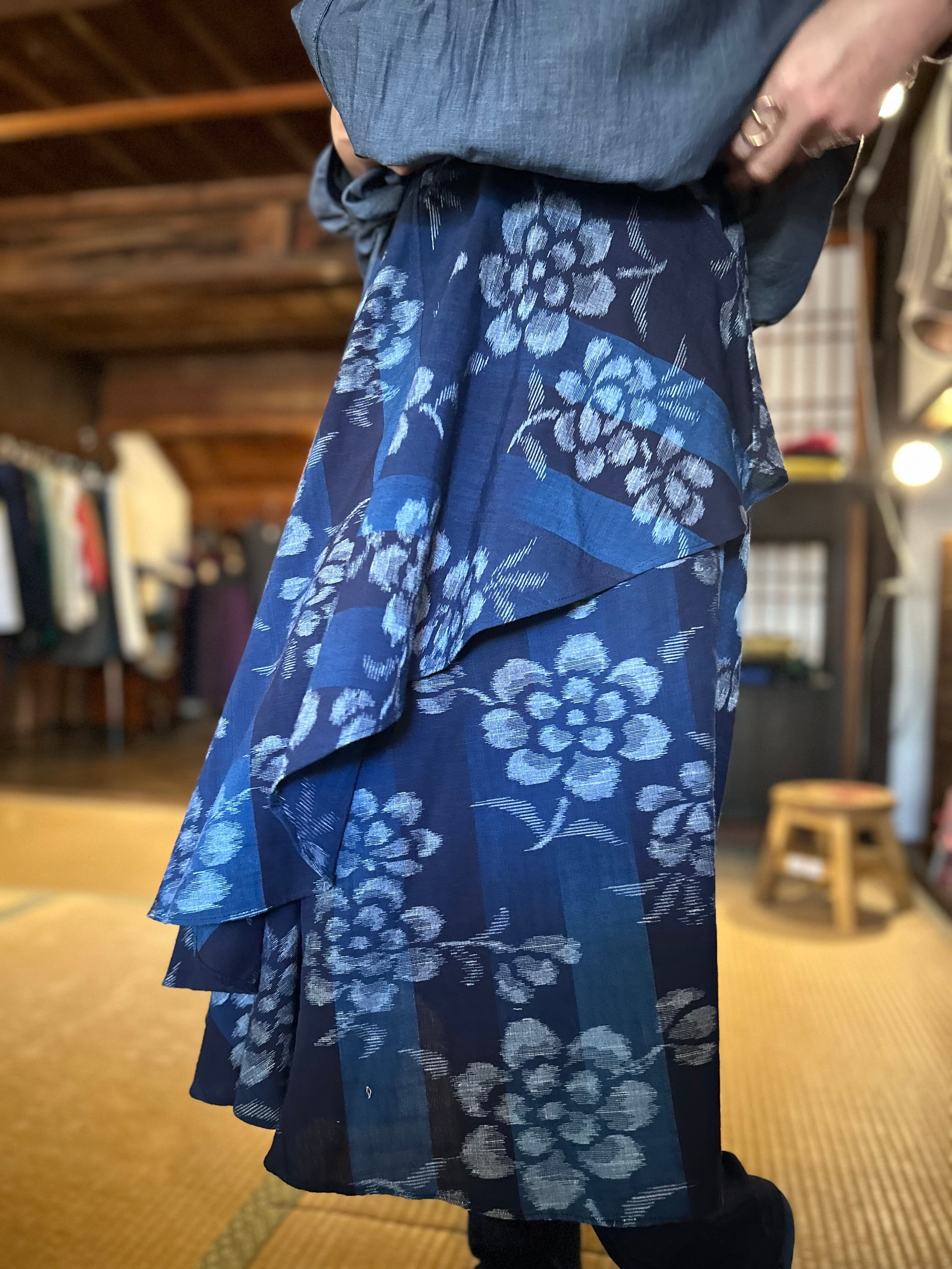 SUEMI作品。久留米絣100%の巻きスカート。腰回りはフックとボタン付きです。フックとボタンの位置である程度のサイズ調節が可能です。丈75cm。背が低い方、細身の方におすすめです。