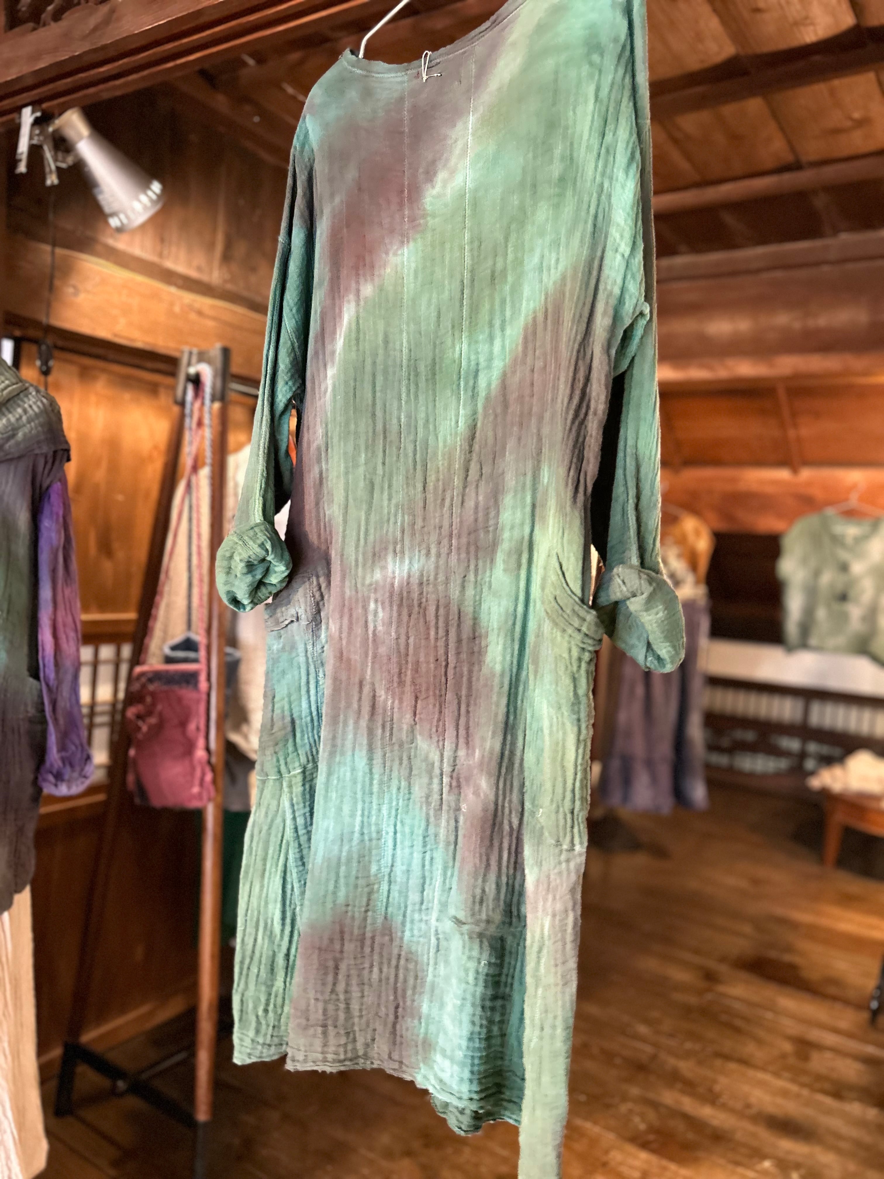 阿萬リヨ子作品。ガーゼワンピース。素材:医療用ガーゼ(綿)100%。着丈90cm。ゆったりサイズ。ガーゼを三枚重ねにしてから、服に仕立てています。冬にはセーターを中に着て、一年中楽しめます。色物のお洗濯は、漂白剤の入っていない洗剤をお使いくださいませ。