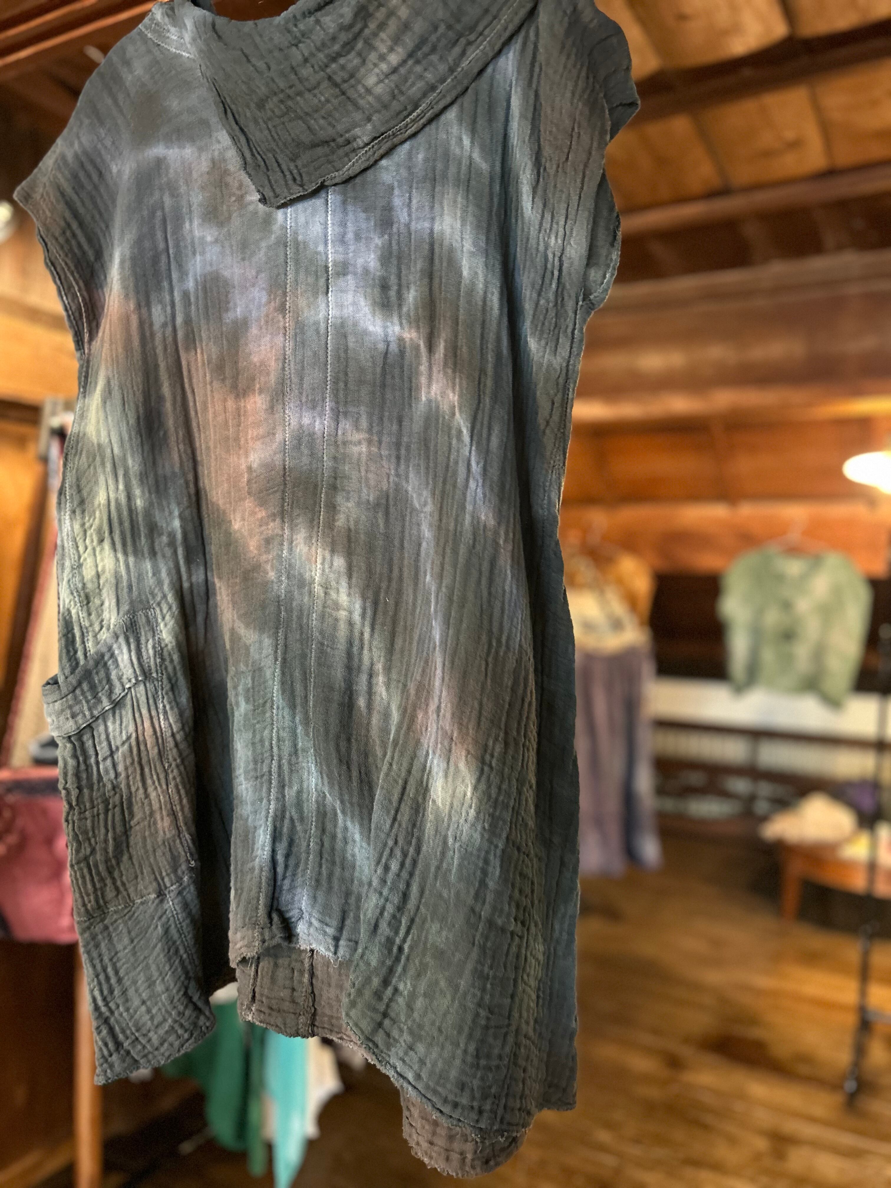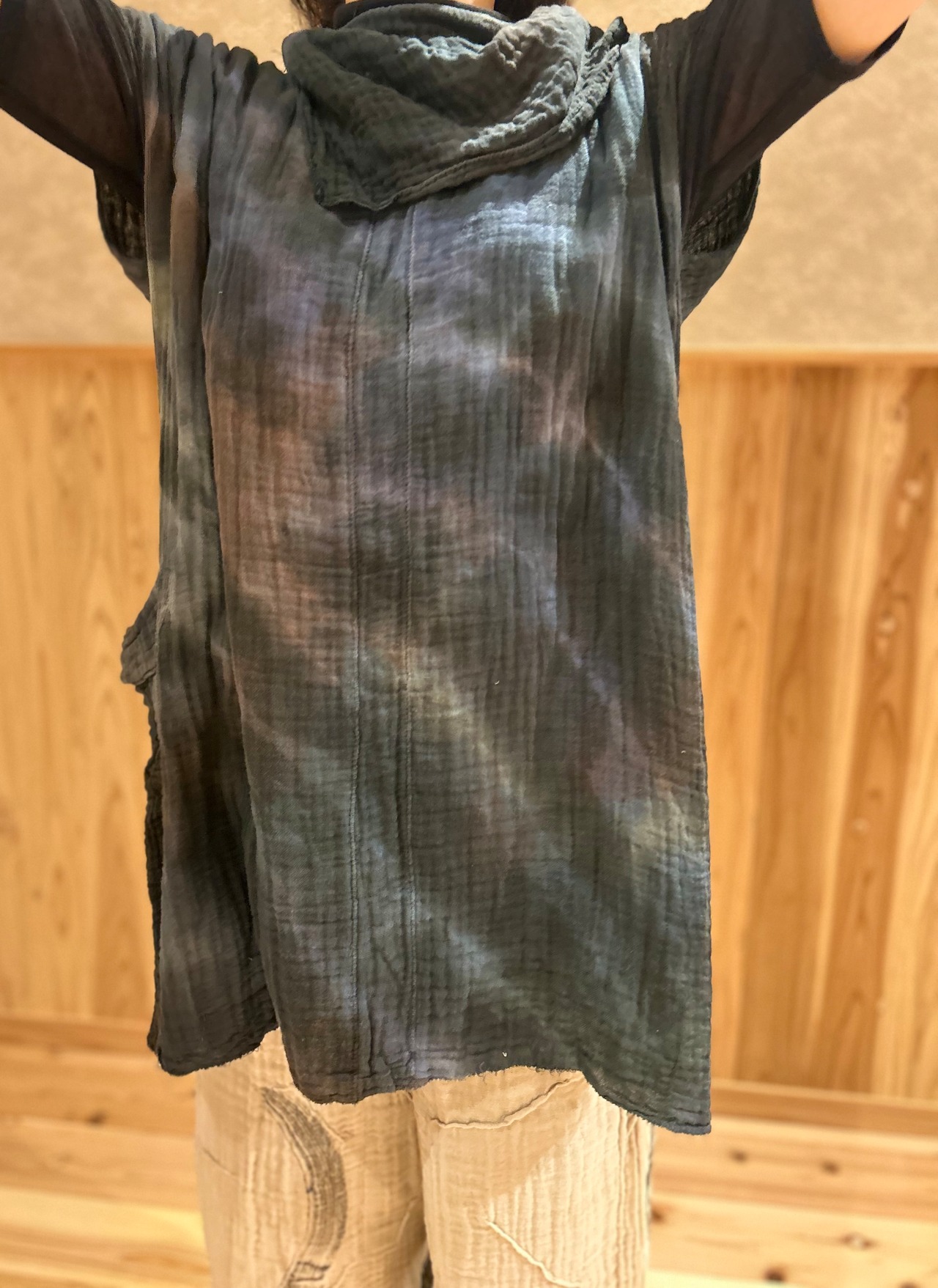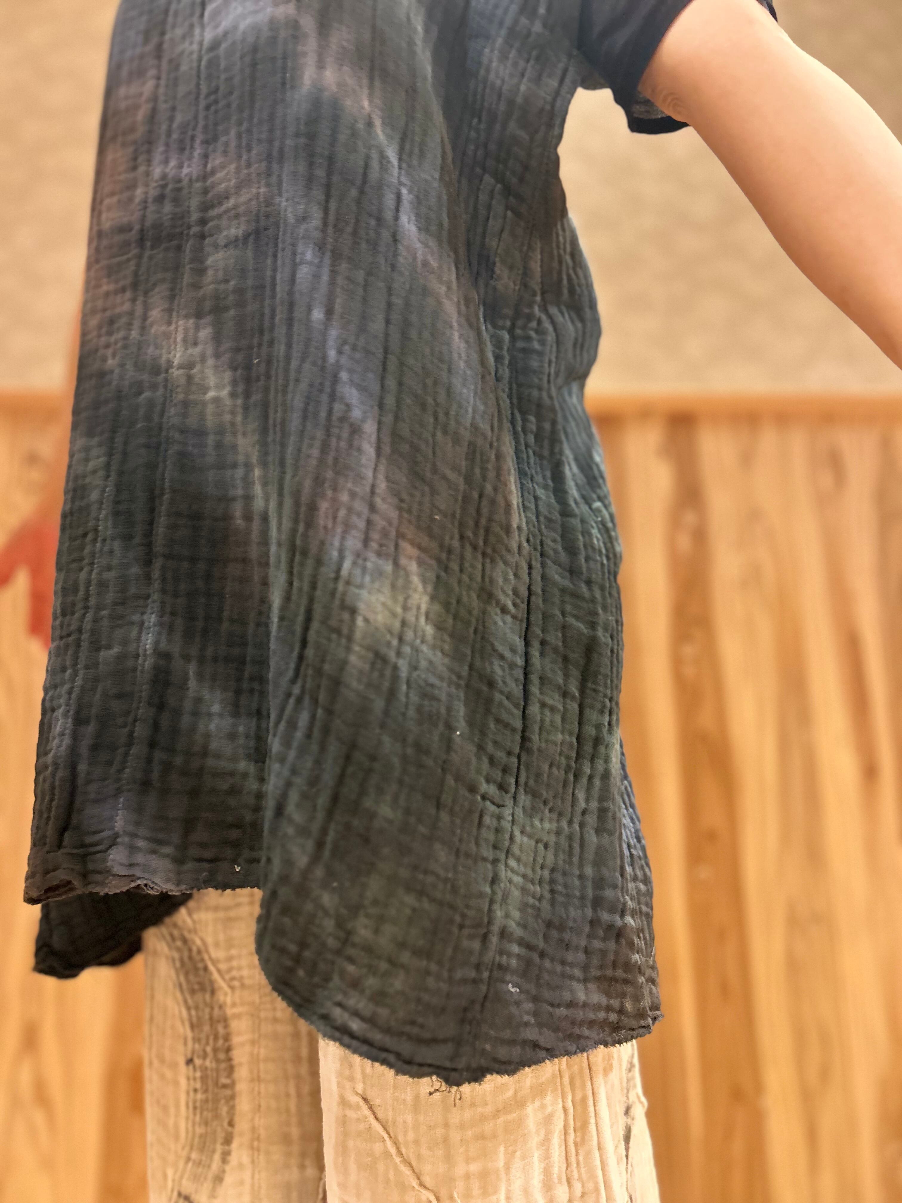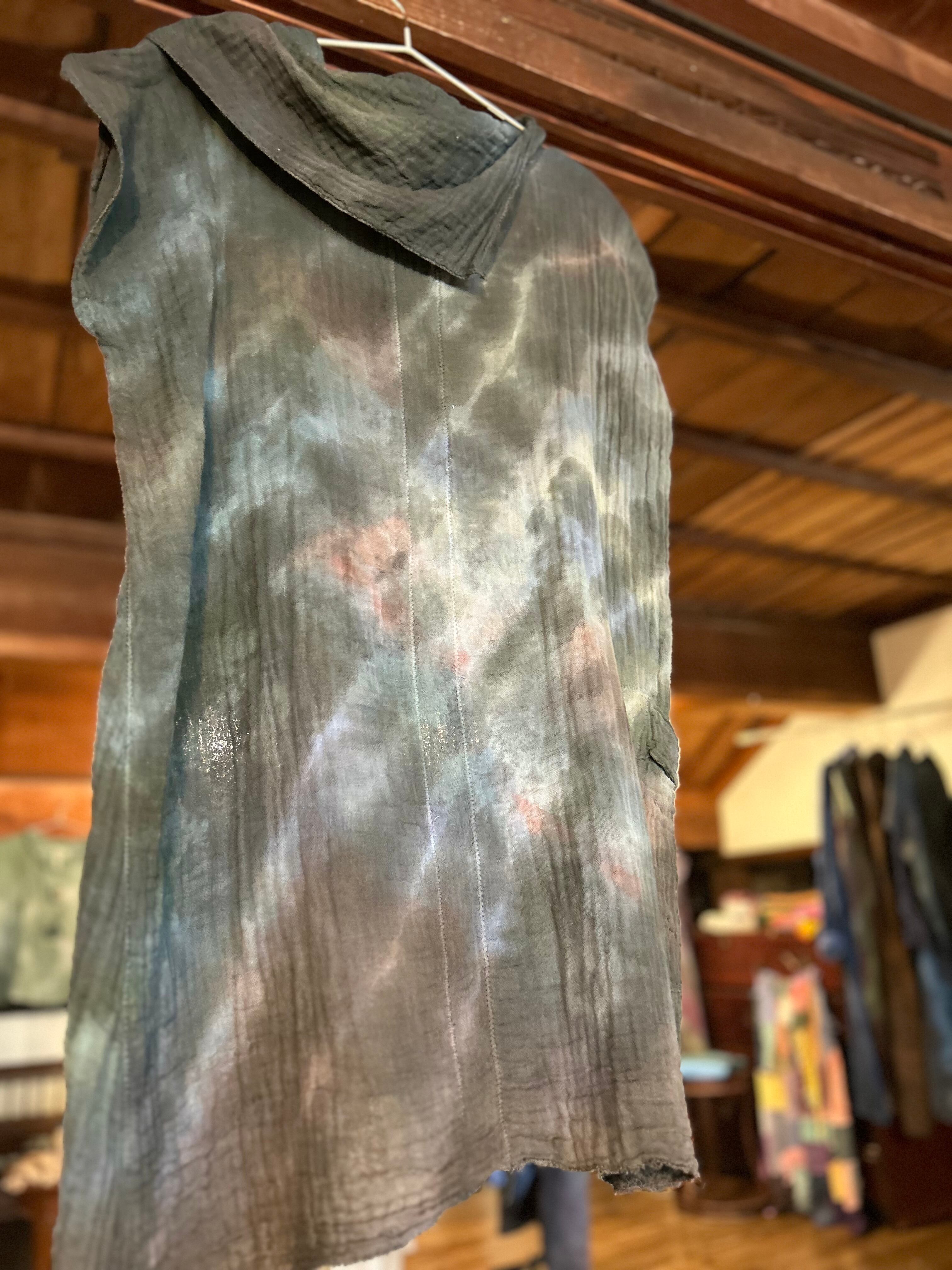阿萬リヨ子作品。ガーゼチュニック。素材:医療用ガーゼ(綿)100%。着丈70cm。ガーゼを三枚重ねにしてから、服に仕立てています。冬にはセーターを中に着て、一年中楽しめます。色物のお洗濯は、漂白剤の入っていない洗剤をお使いくださいませ。今回、特別価格(50〜70%off)となっております。