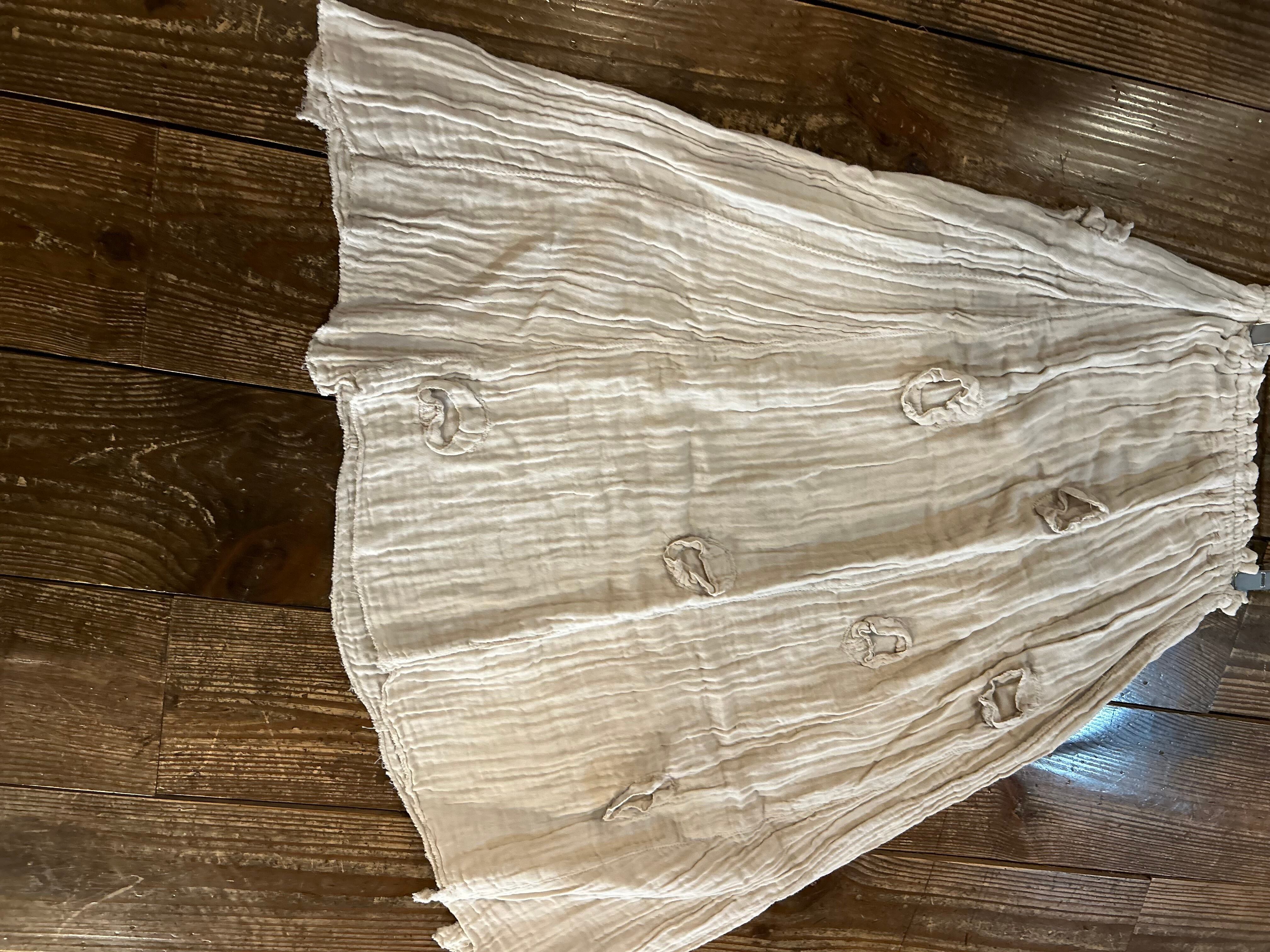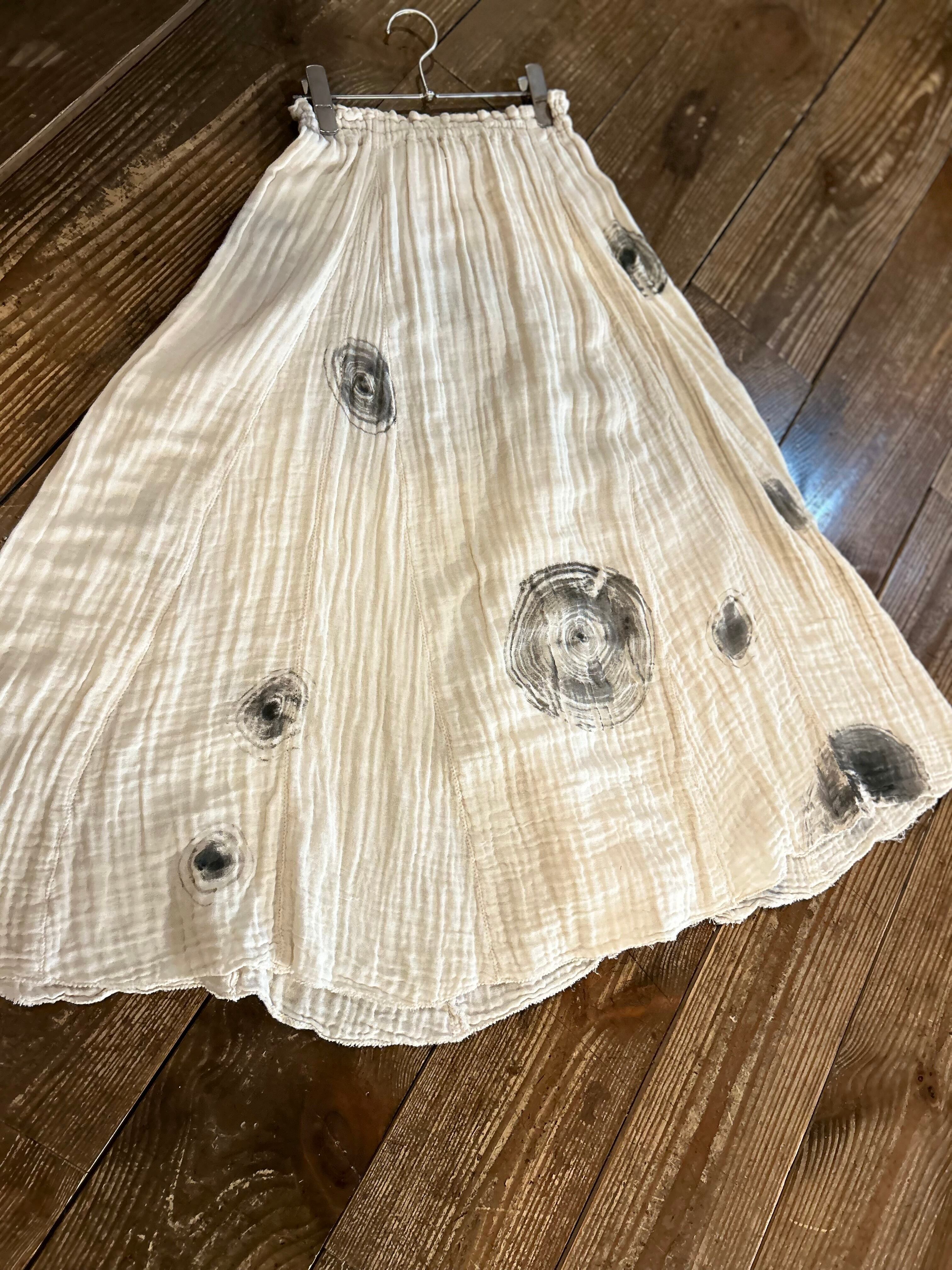 阿萬リヨ子作品。ガーゼスカート。ウエスト総ゴム。自然染め。素材:医療用ガーゼ(綿)100%。着丈70cm。ガーゼを三枚重ねにしてから、服に仕立てています。色物のお洗濯は、漂白剤の入っていない洗剤をお使いくださいませ。