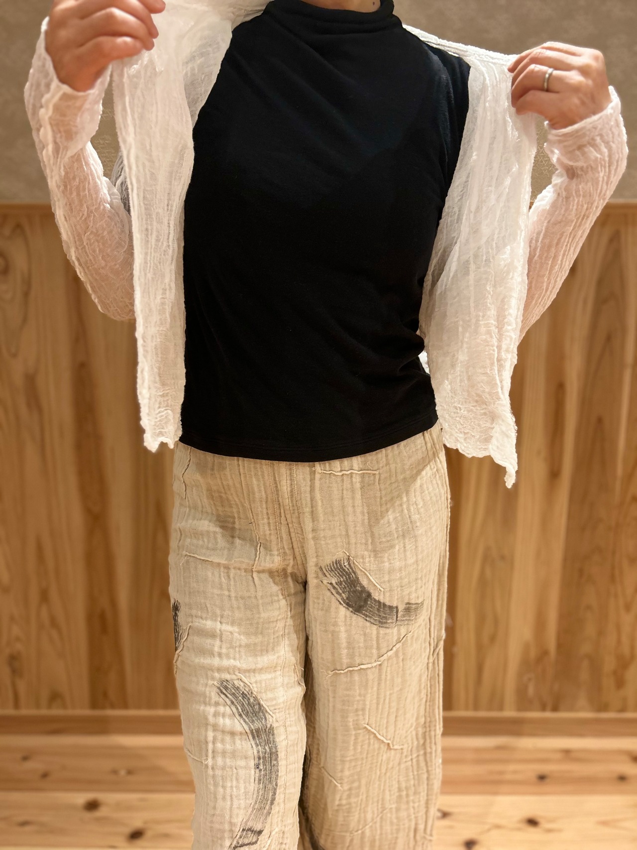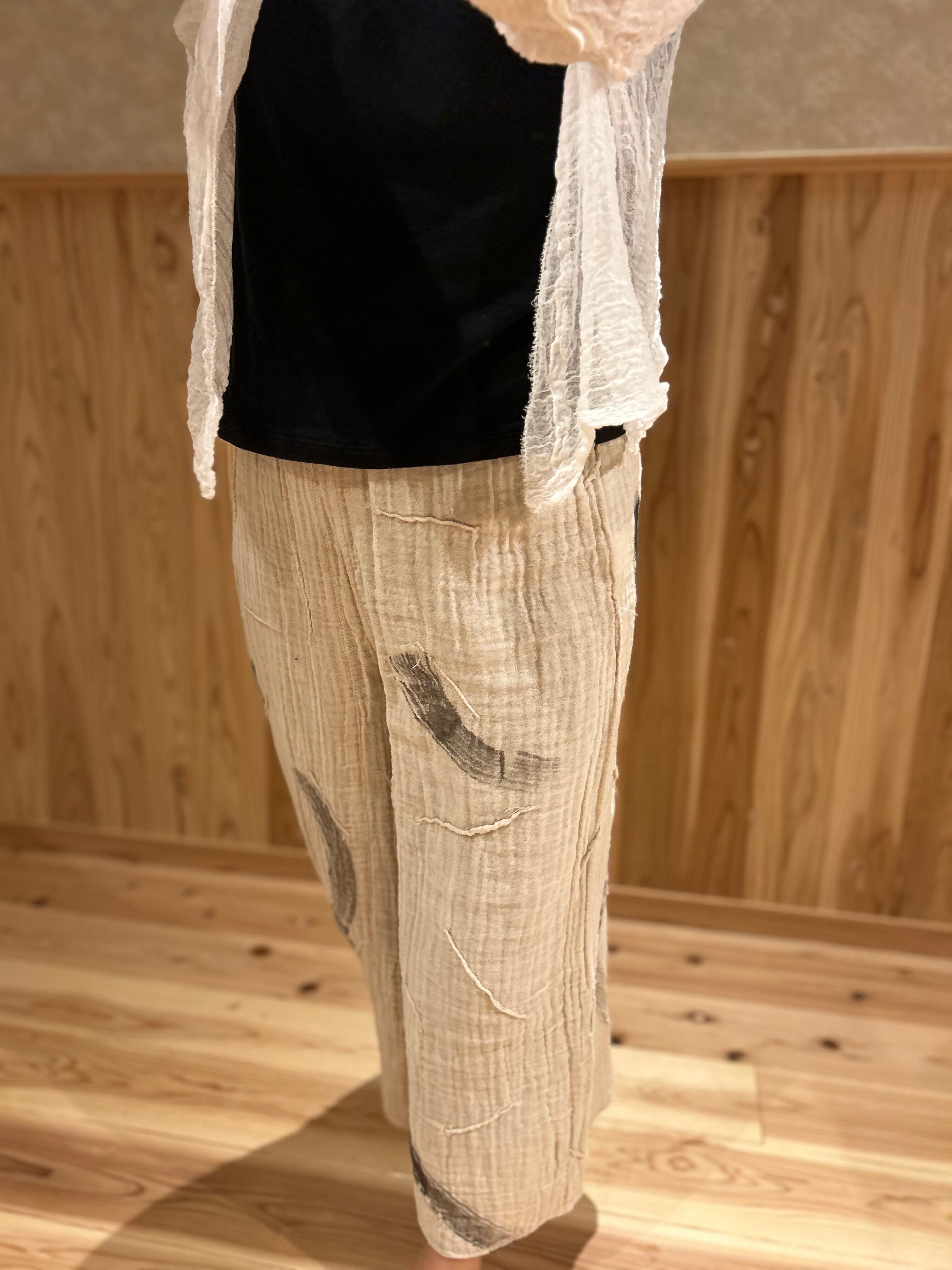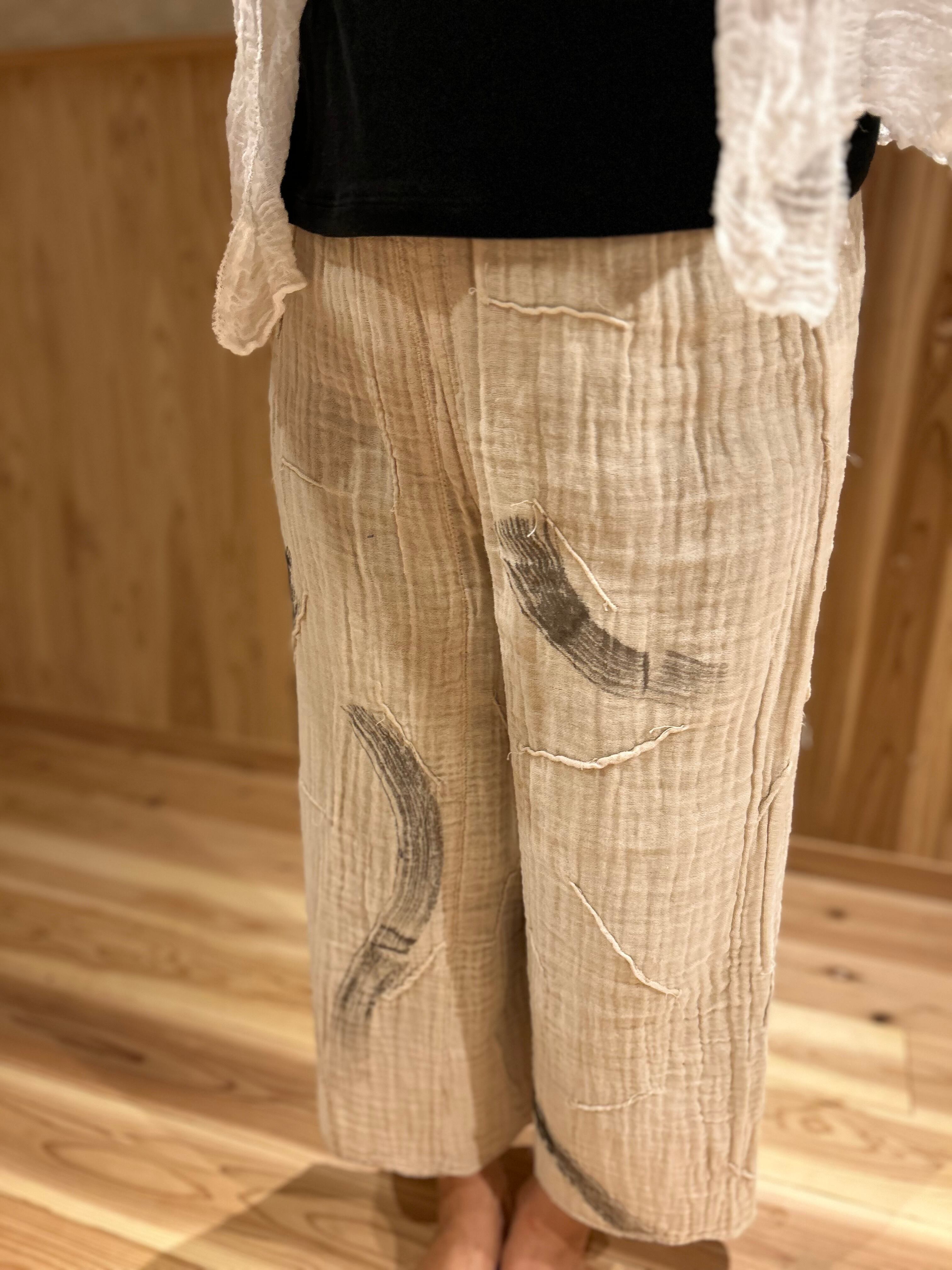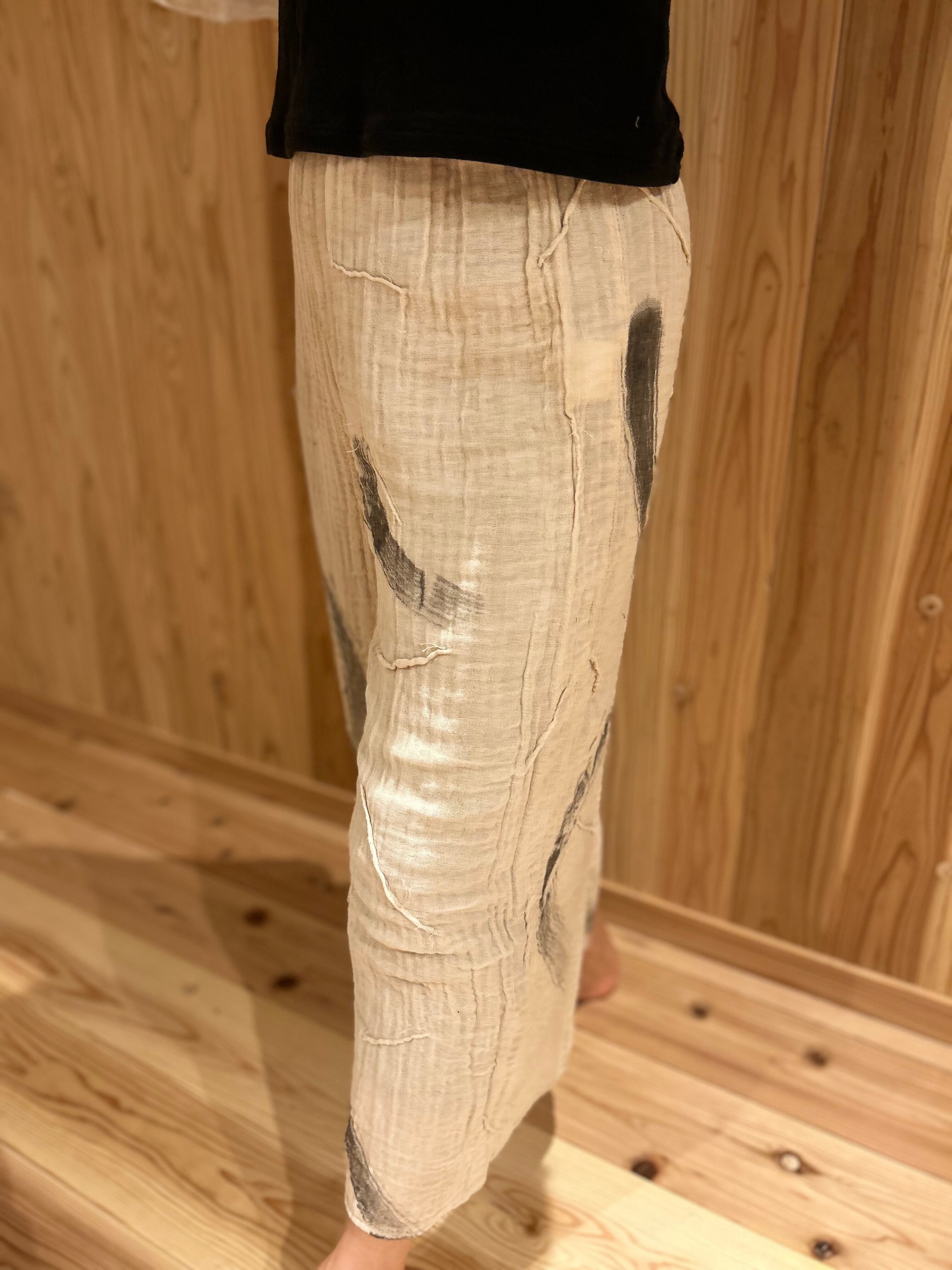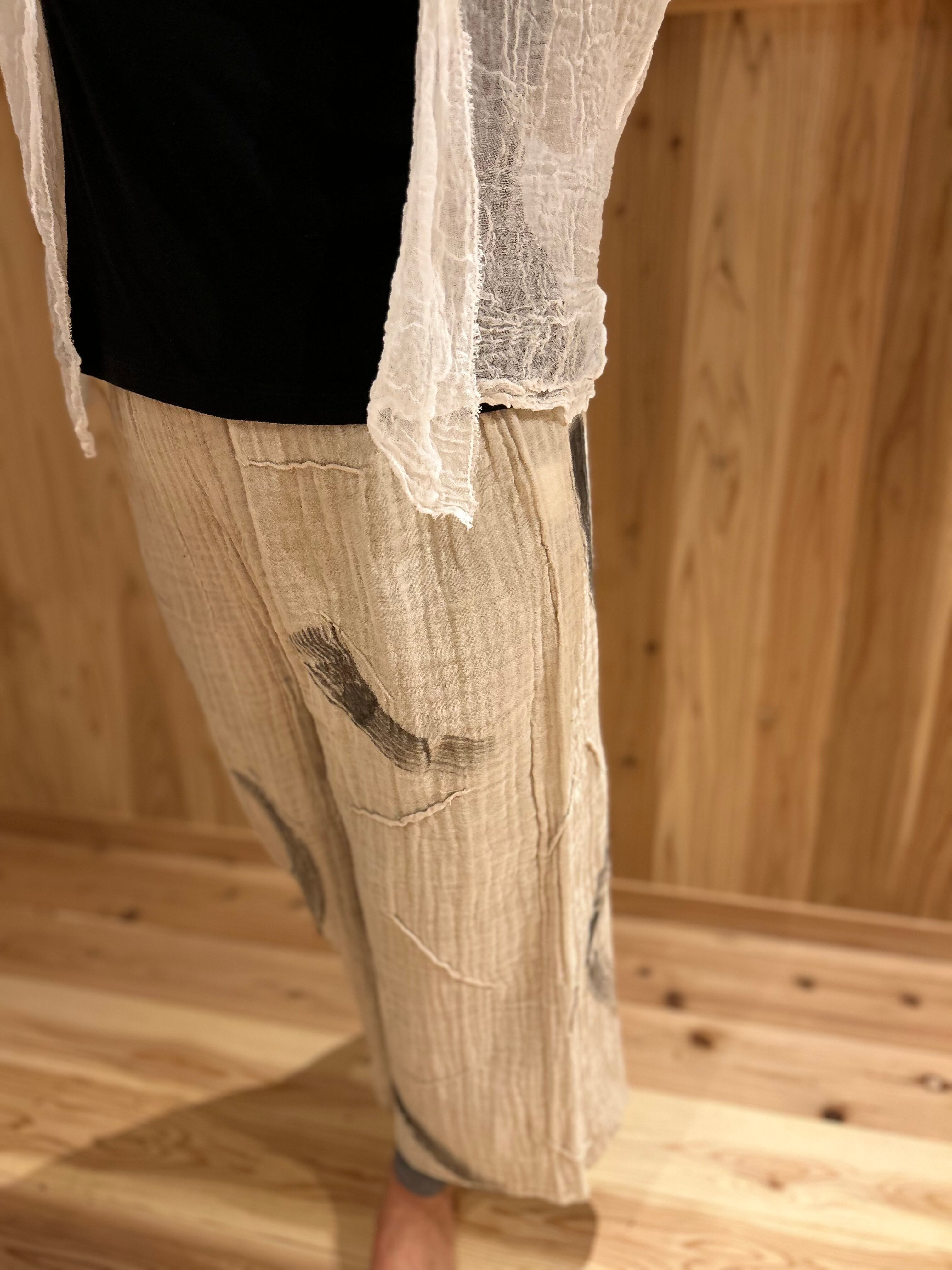 阿萬リヨ子作品。ガーゼパンツ。ウエスト総ゴム。素材:医療用ガーゼ(綿)100%。着丈80cm。ガーゼを三枚重ねにしてから、服に仕立てています。冬にはセーターを中に着て、一年中楽しめます。色物のお洗濯は、漂白剤の入っていない洗剤をお使いくださいませ。