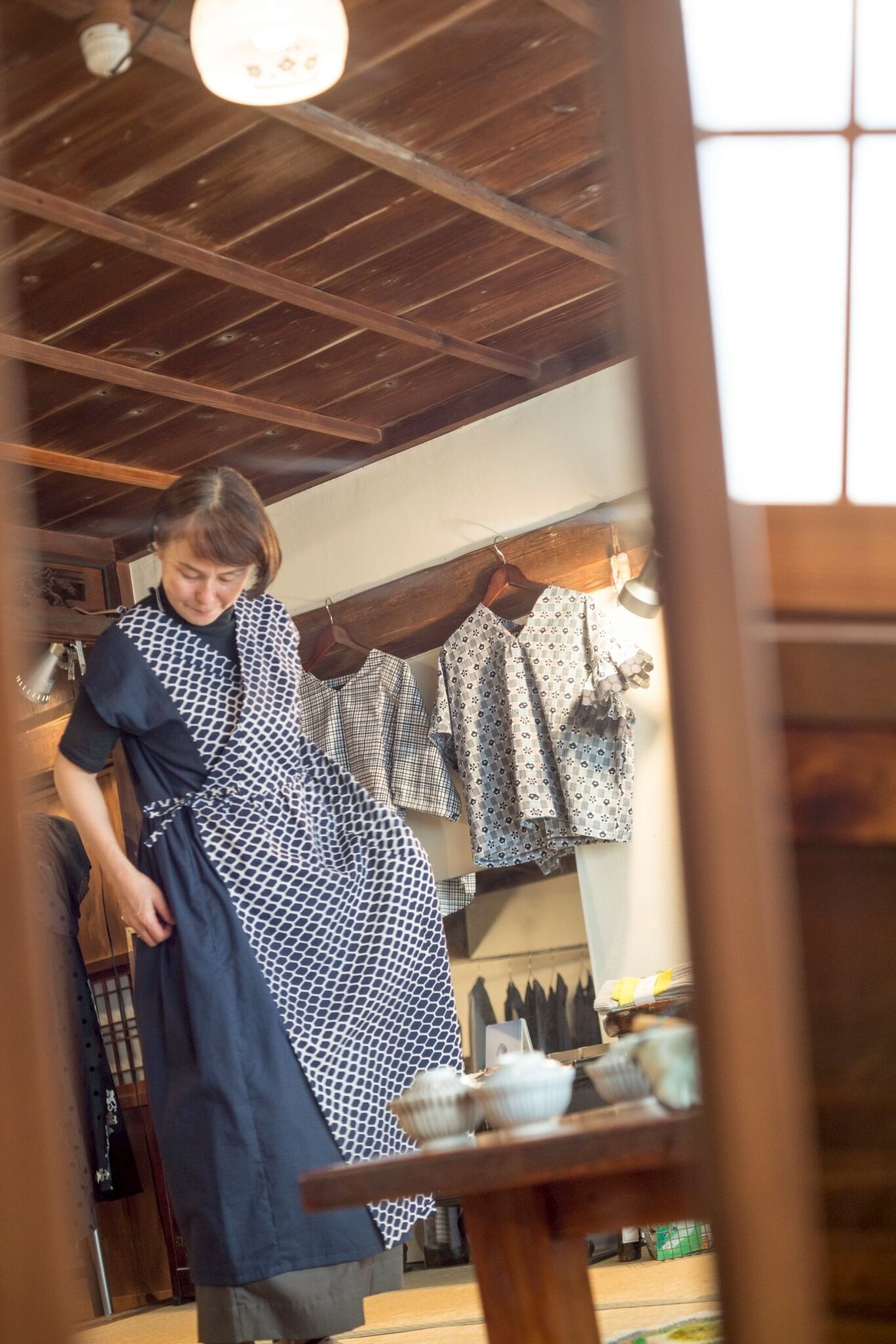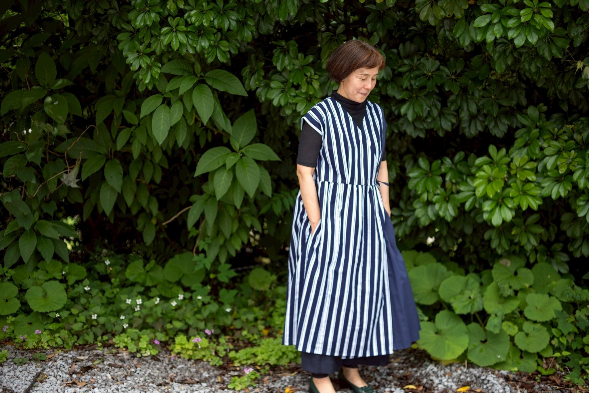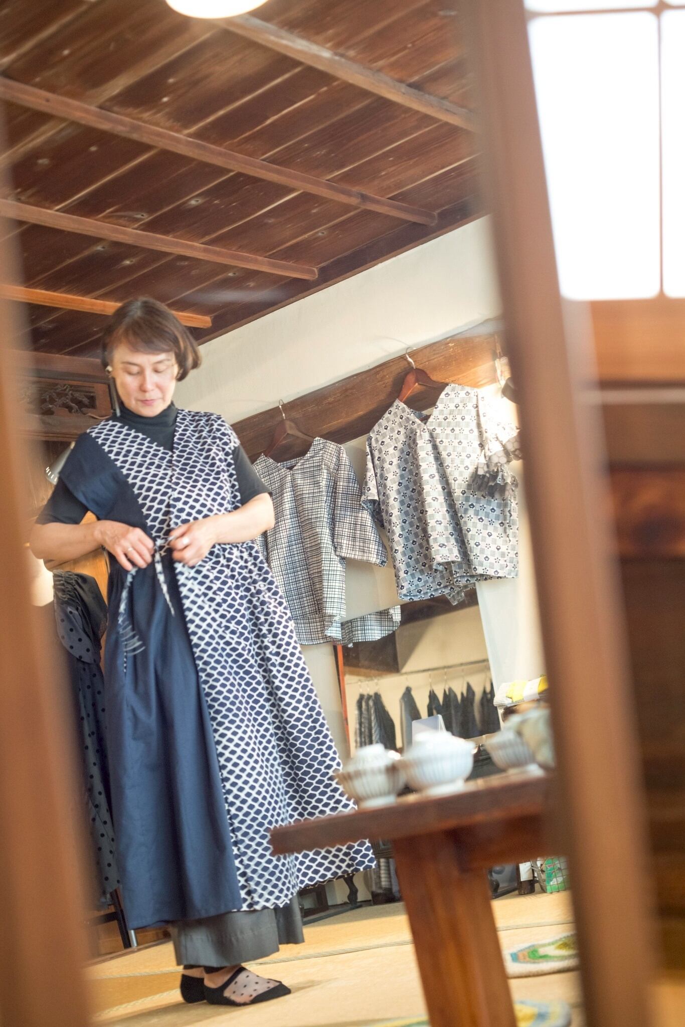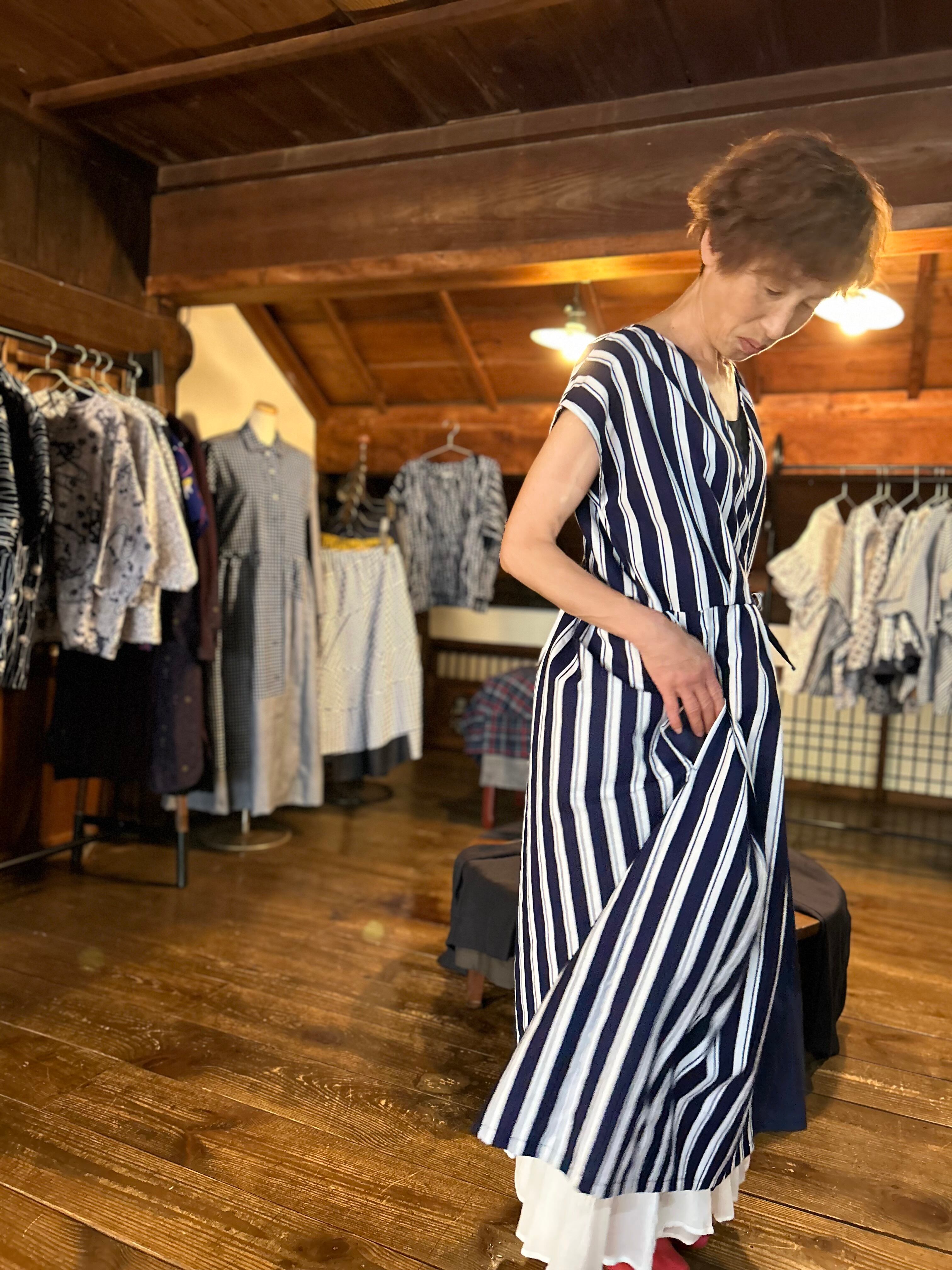 ushiromae作品。毎年人気のカシュクールワンピース。ushiromaeさんの作品はビンテージの浴衣生地を使った作品で、綿100%。(無地の生地との組み合わせのものも、もちろん綿を使っています。)前を開けて着たり、3wayで楽しめるカシュクールワンピース。インナー次第で冬以外は着用できます。フリーサイズ。着丈110cm。紐4本。