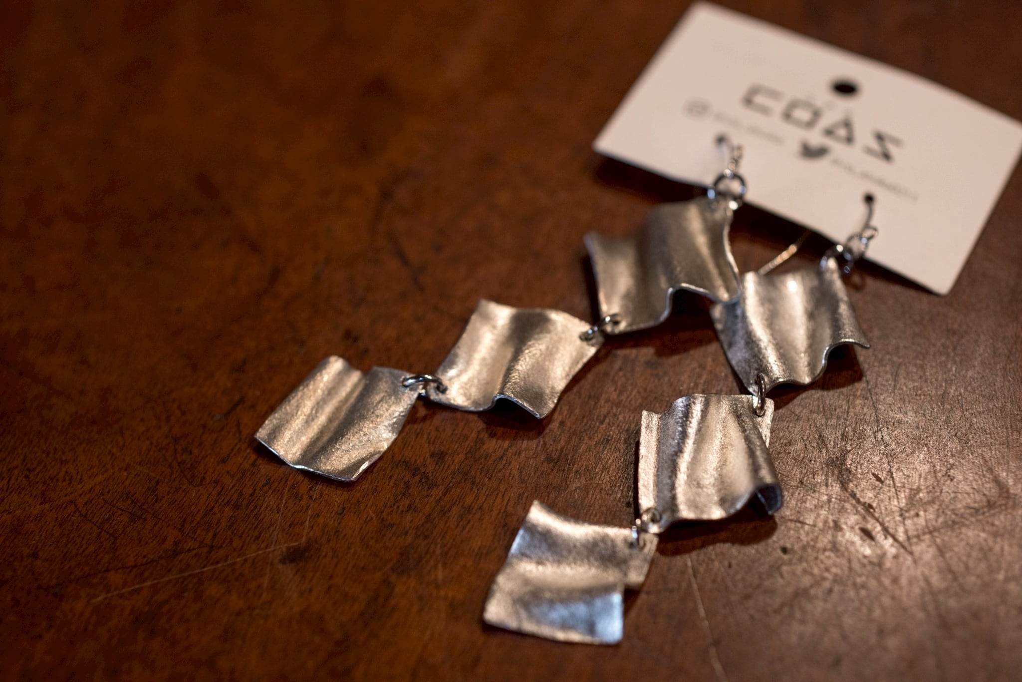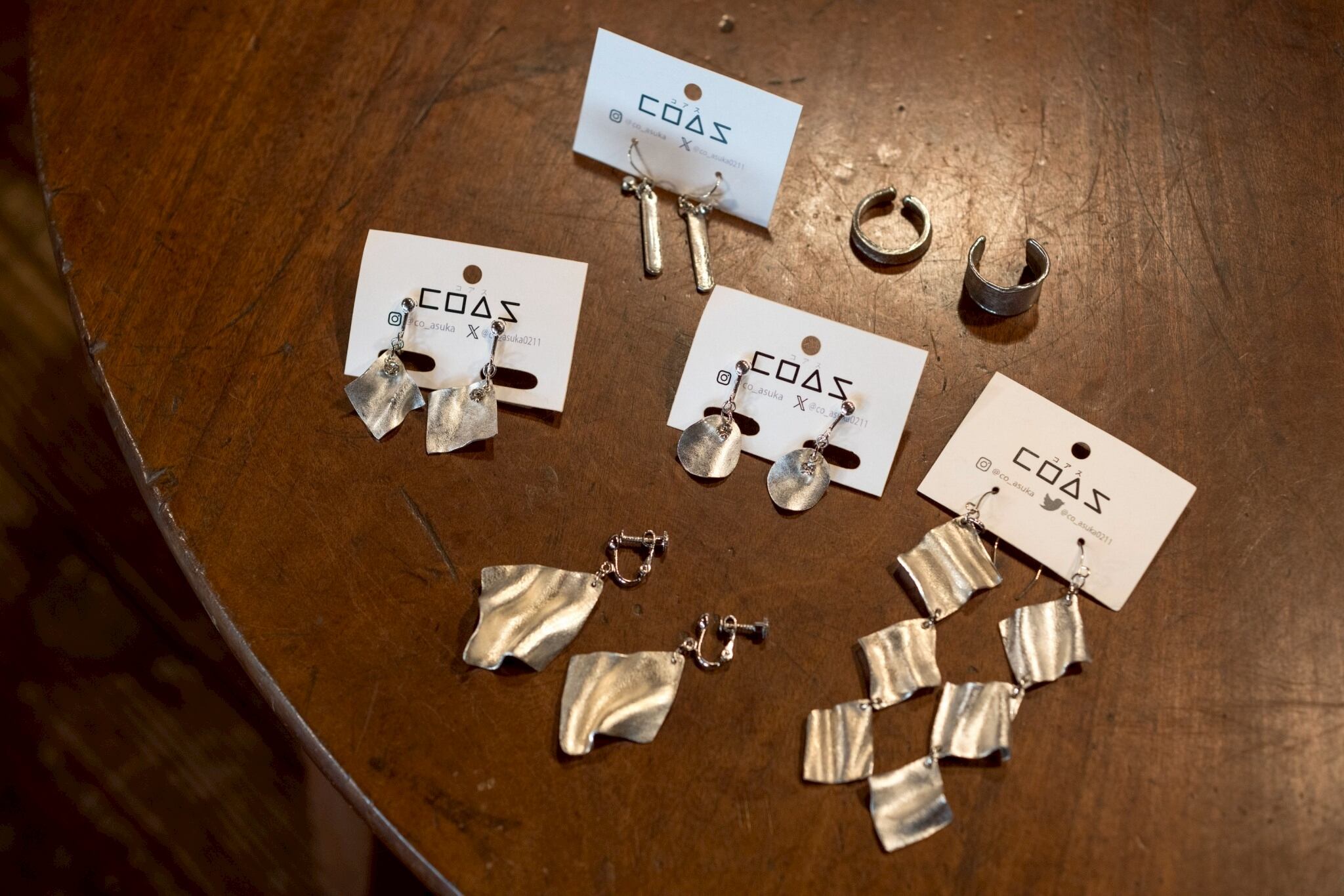 自在に曲げられる錫素材。優しい肌触りと光沢が特徴。こちらのピアス、イヤリングは少し長めの7cm-8cm。COAS作品。