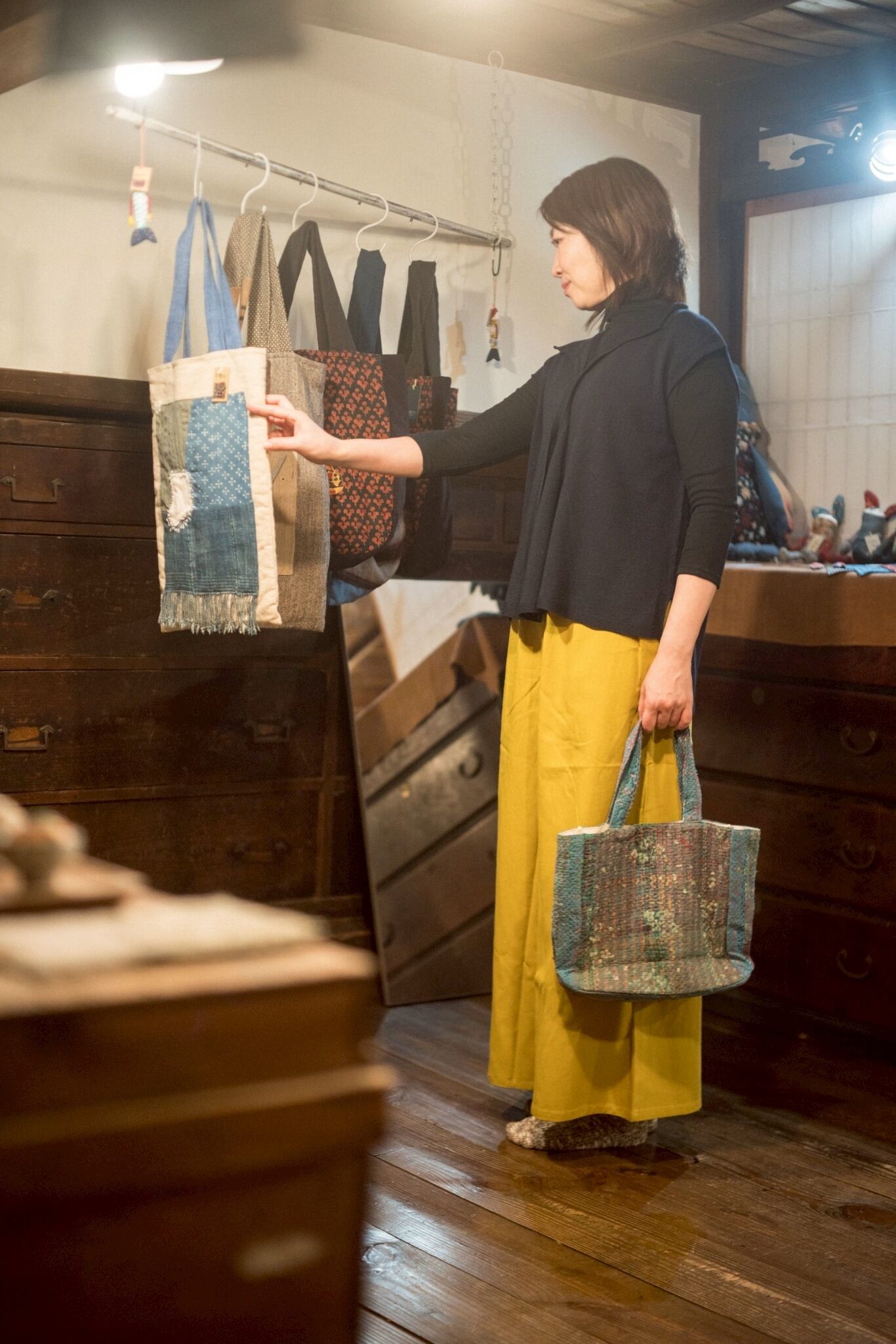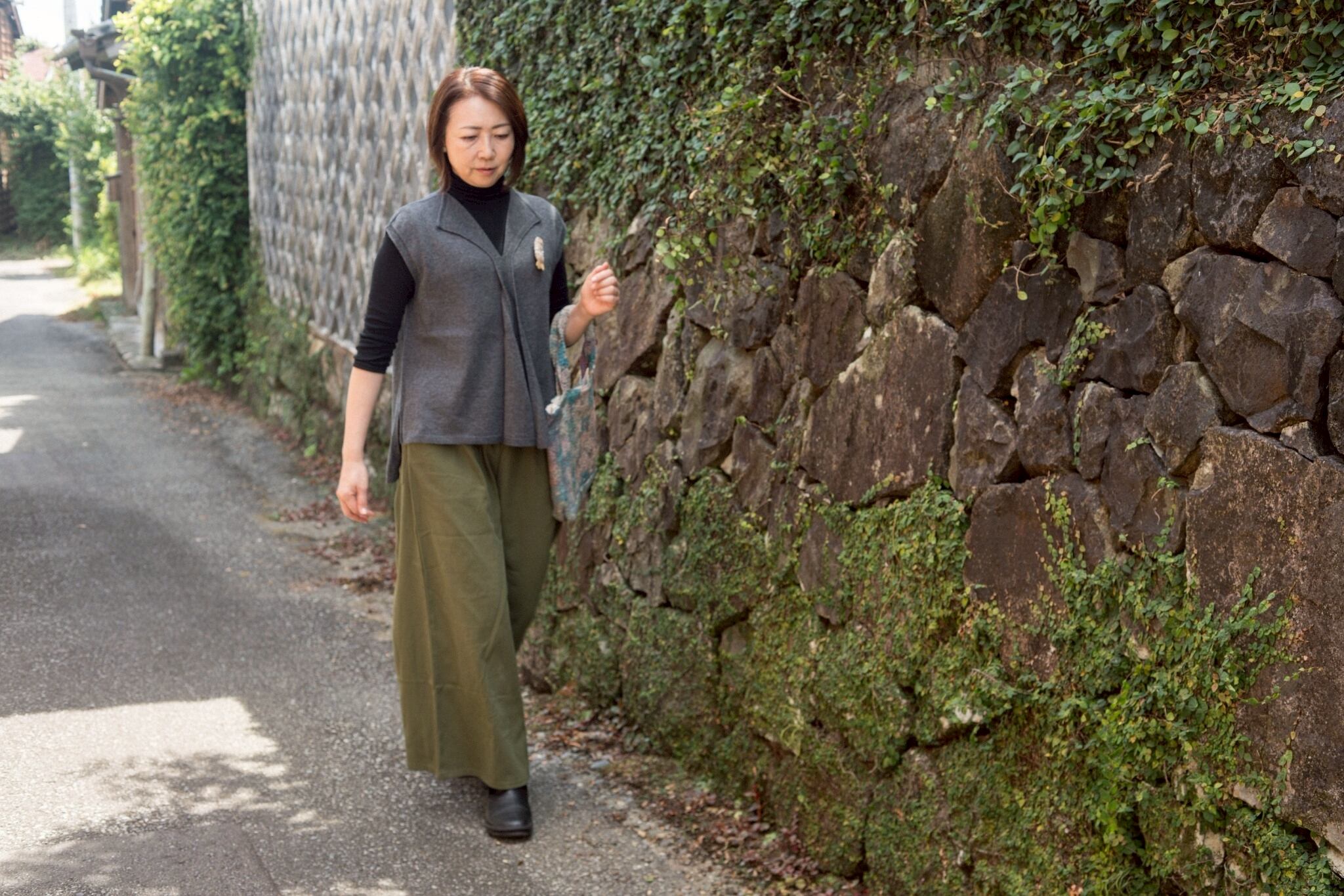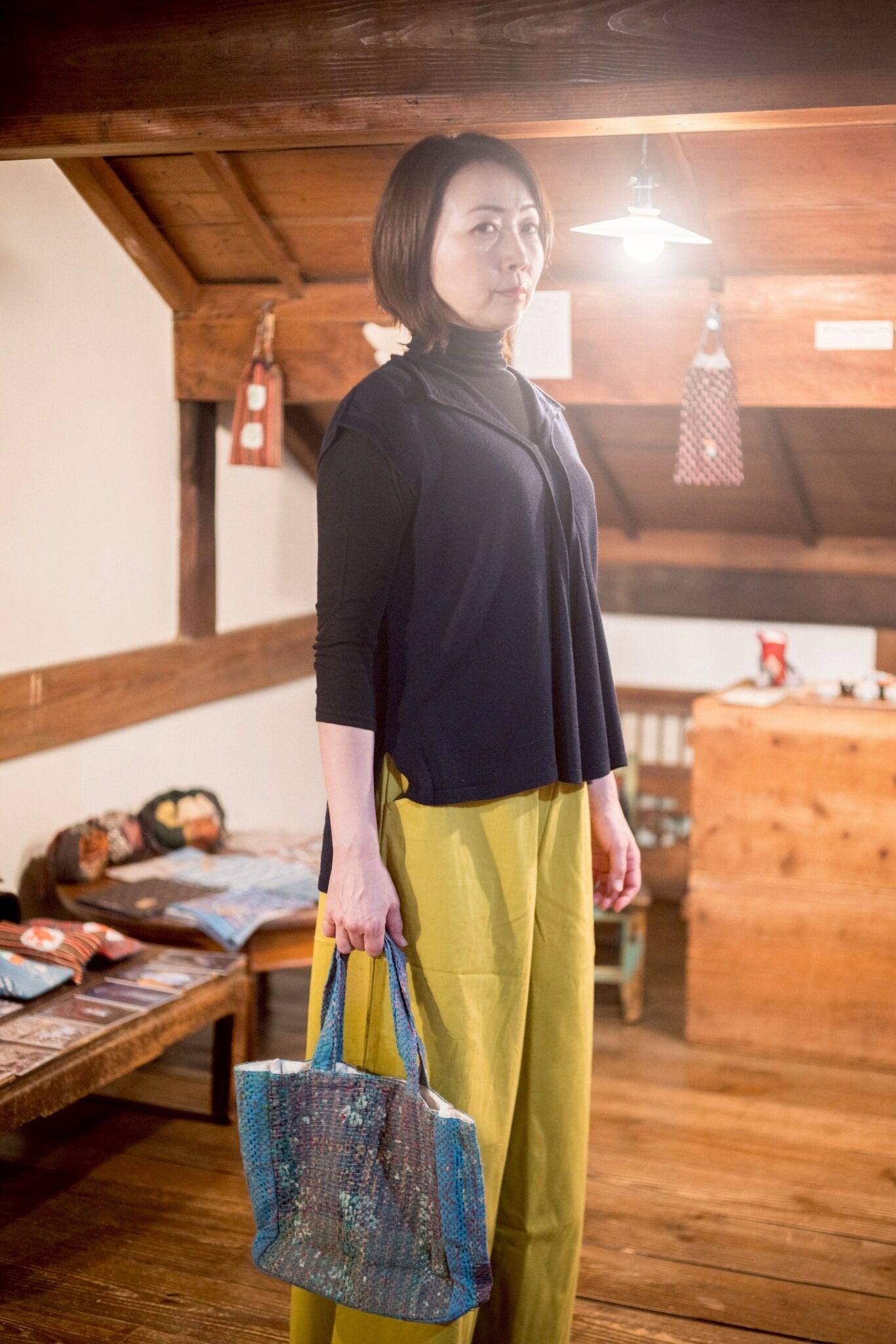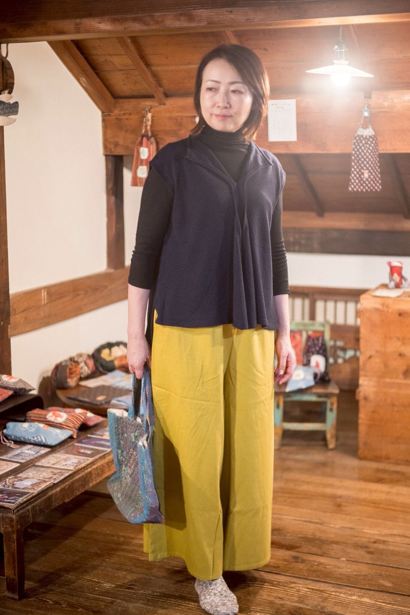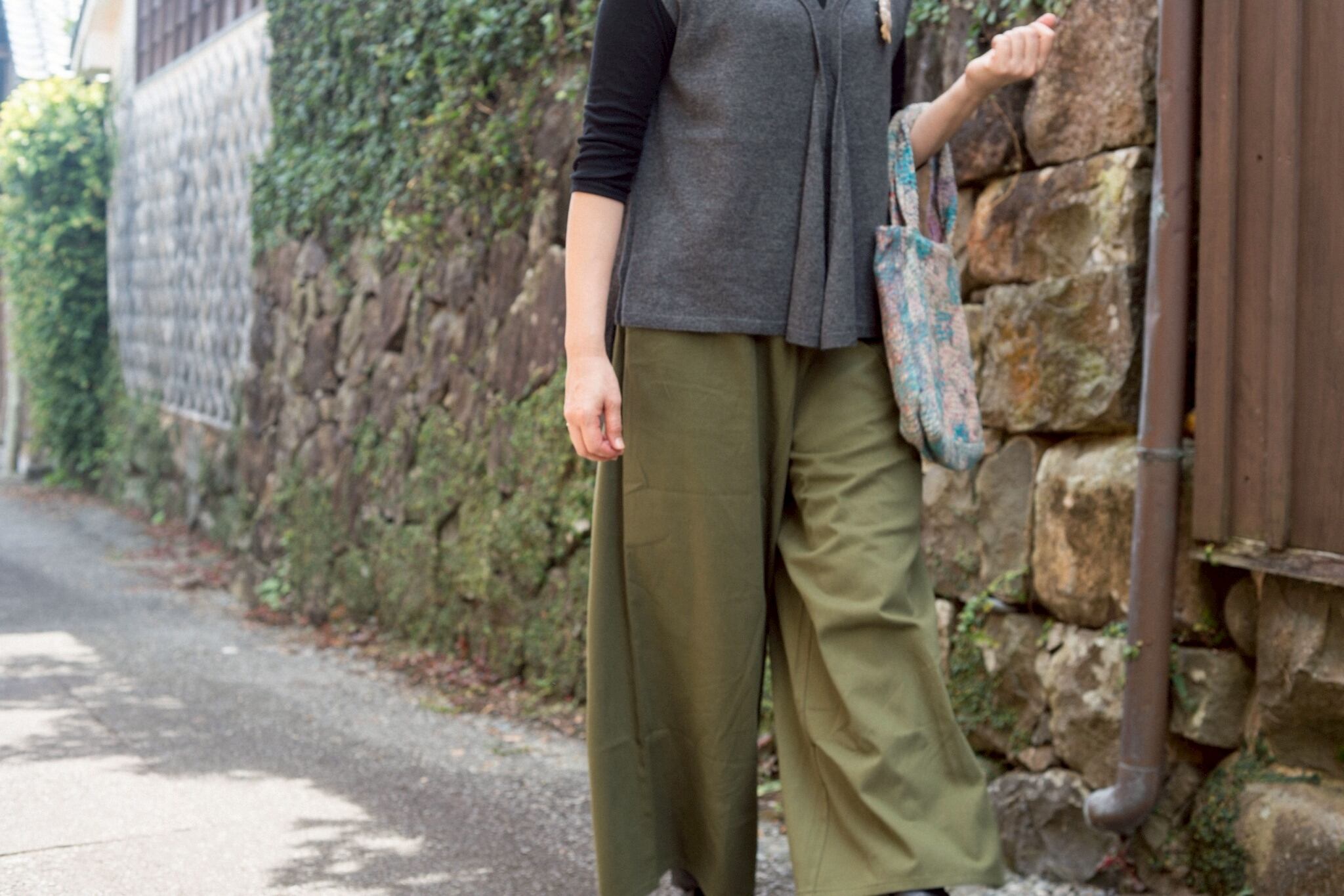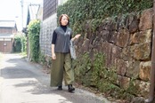 フリーサイズ。ウエスト68-104cm。股下60cm。脇、後ろポケット。綿100%。