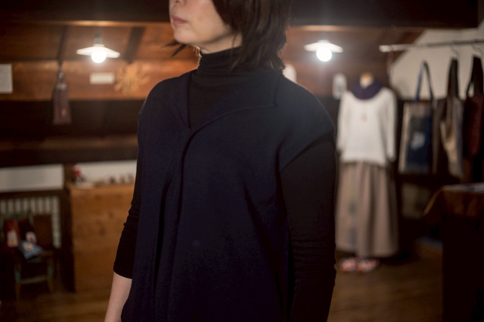 サイズバスト100cm。着丈前57-後ろ65cm。レーヨン35%、毛30%、ナイロン20%、アンゴラ15%。シンプルに見えるベストですが、自然な立体感があるデザイン性のあるベスト。