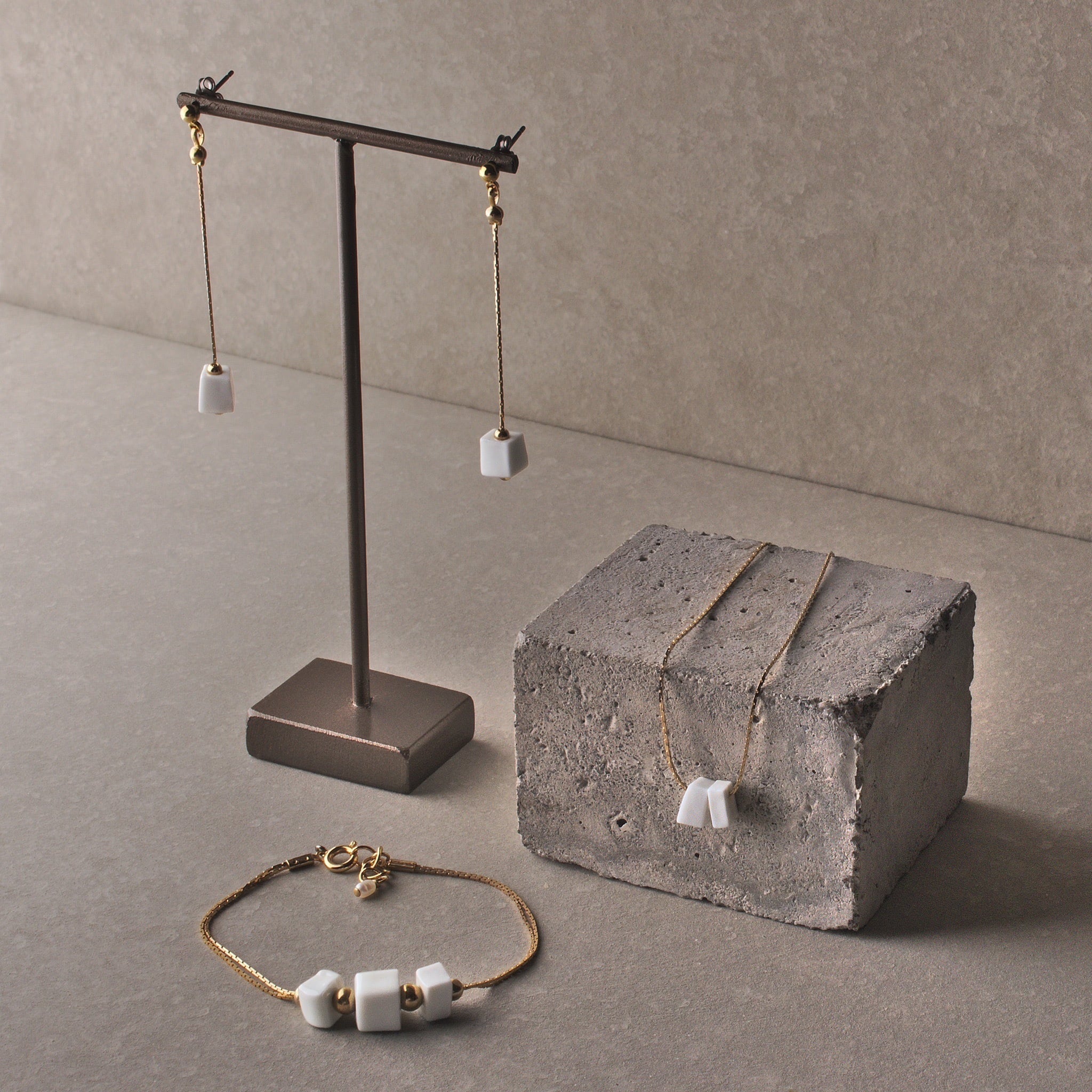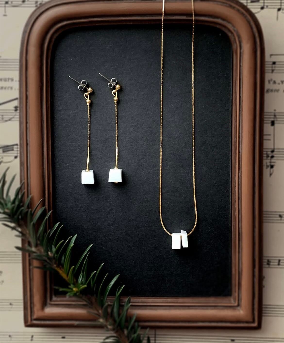 2つの小さな磁器のパーツが付いたアクセサリー。長さ約40cm。調節➕6cm。3枚目写真はパーツの大きさと数が違いますが、付けた雰囲気の参考にしていただきたいです。(クラウドファンディングの返礼品のおすすめ品として、カタログのNO4.に掲載されている商品です。)