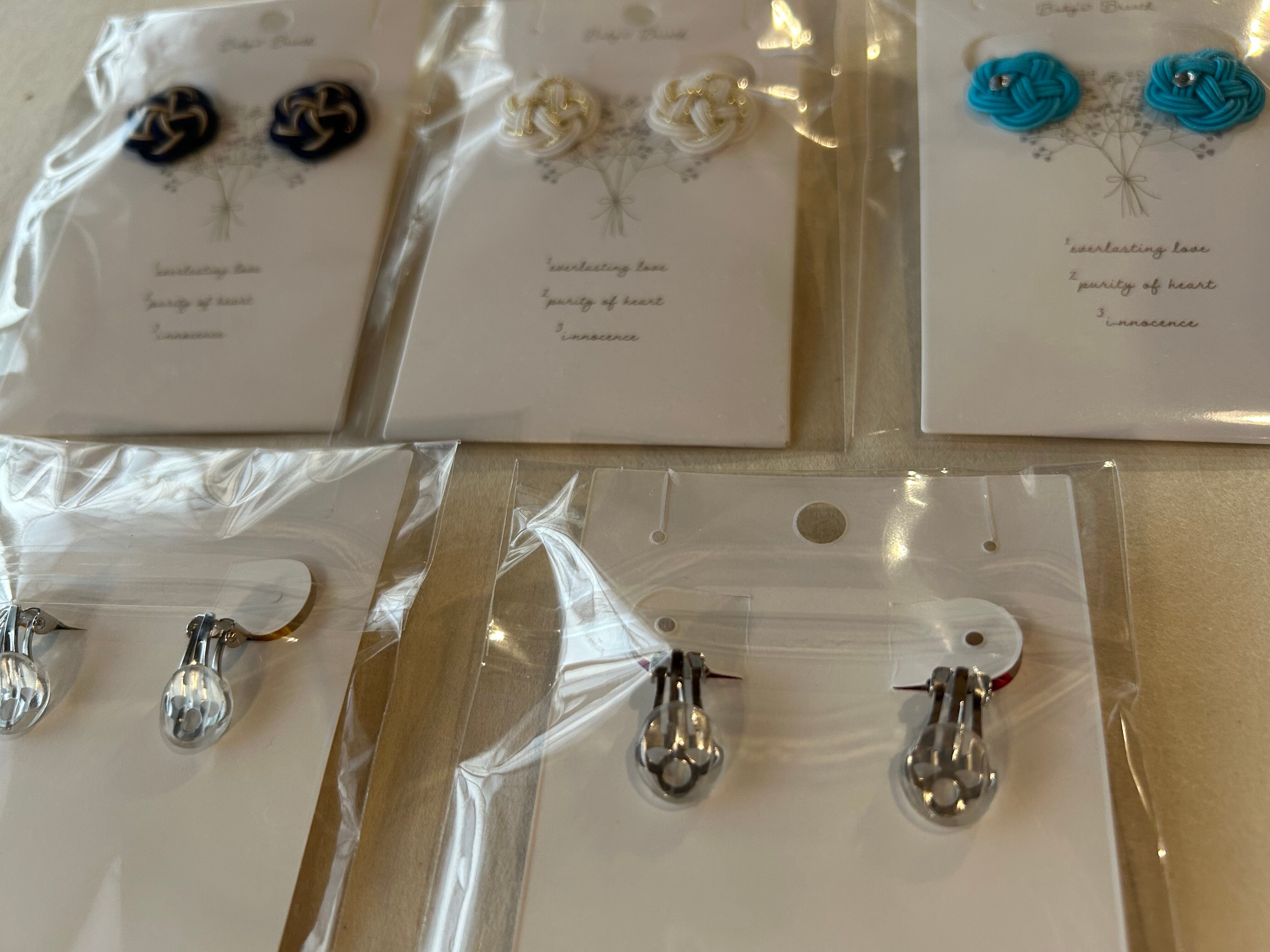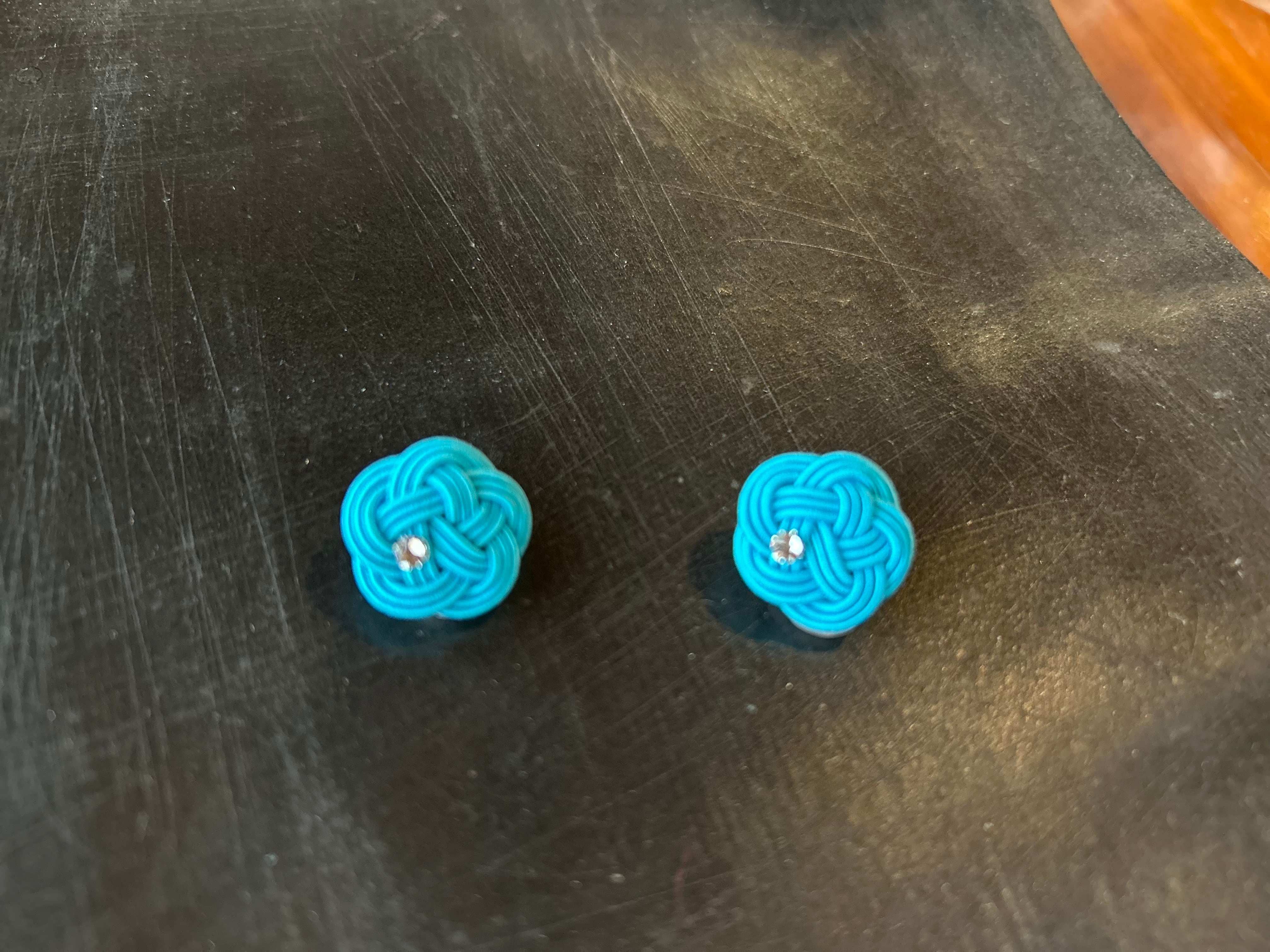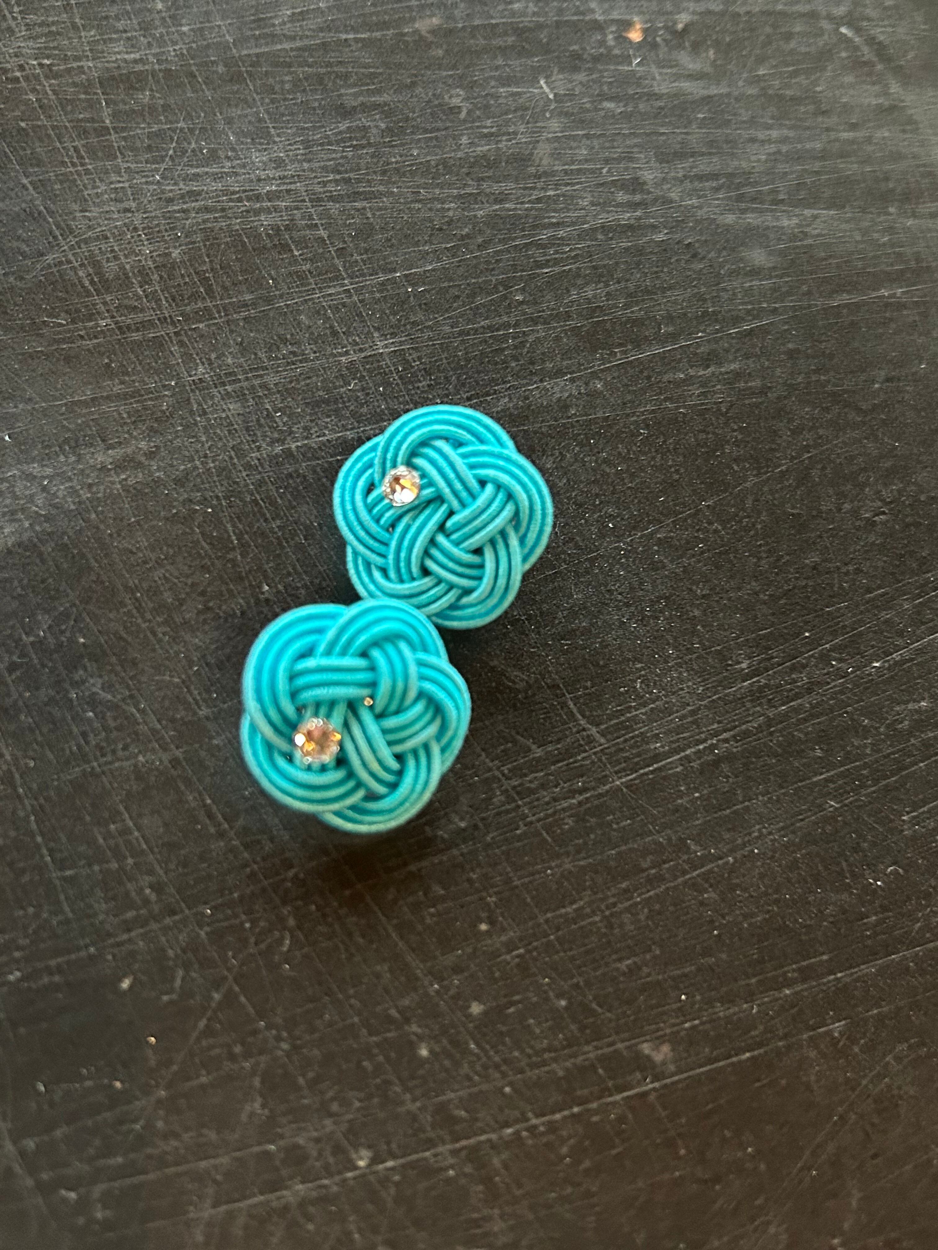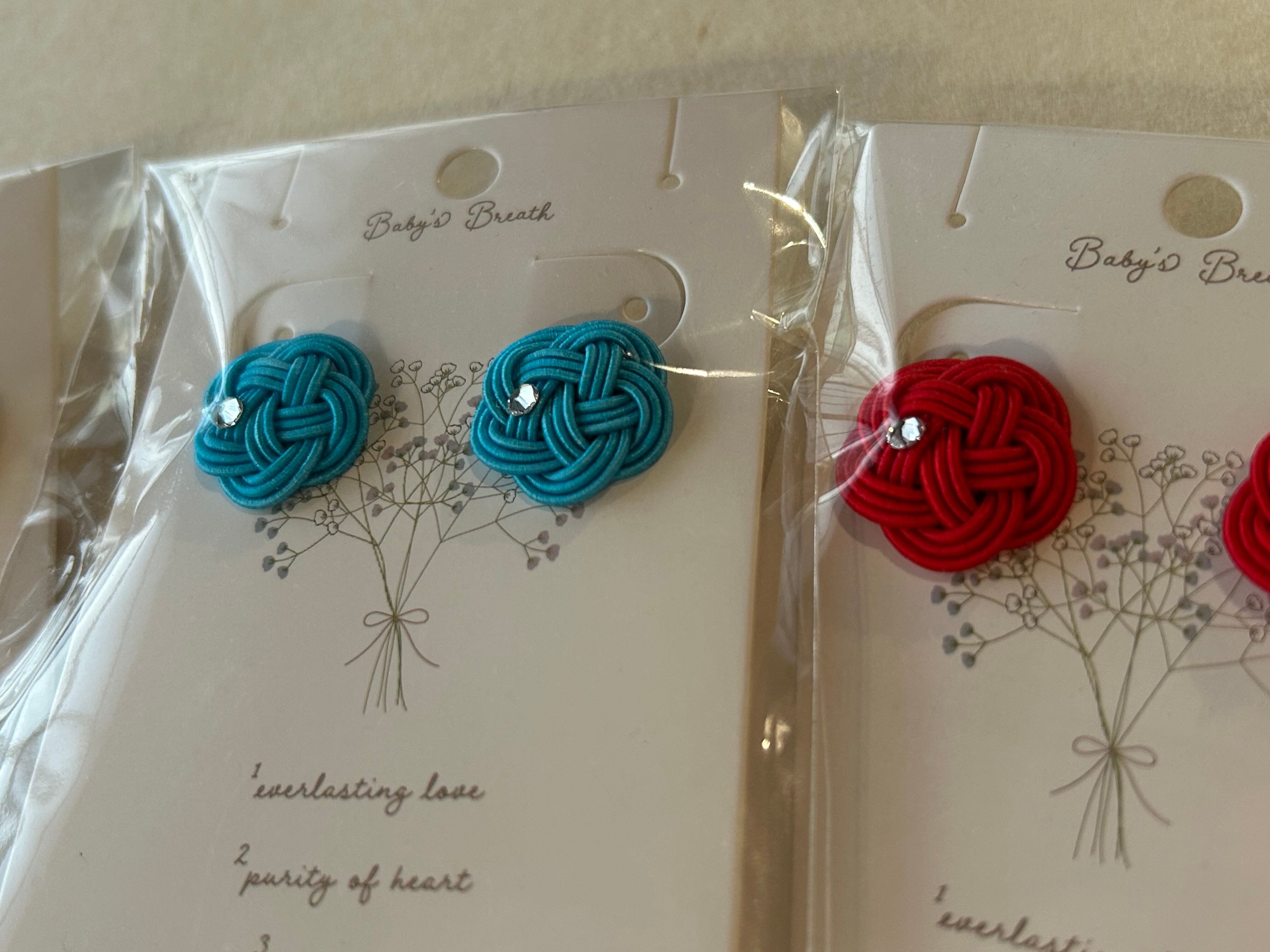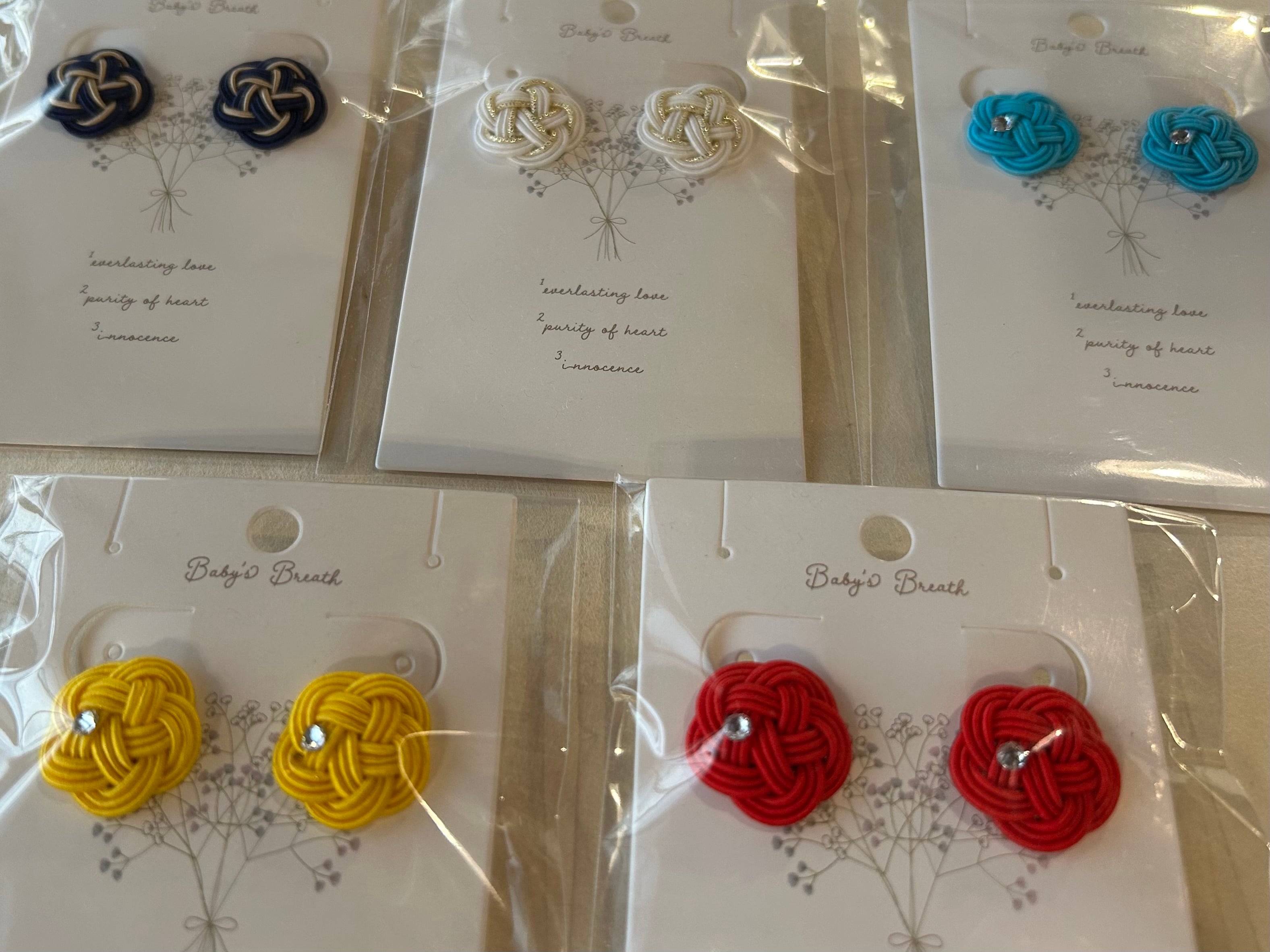 apetrentaさんの水引イヤリング。梅結び。ビーズありと2色の水引使いがあります。こちらはイヤリングのみです。(クラウドファンディングの返礼品のおすすめ品として、カタログのNO.19に掲載されている商品です。)
