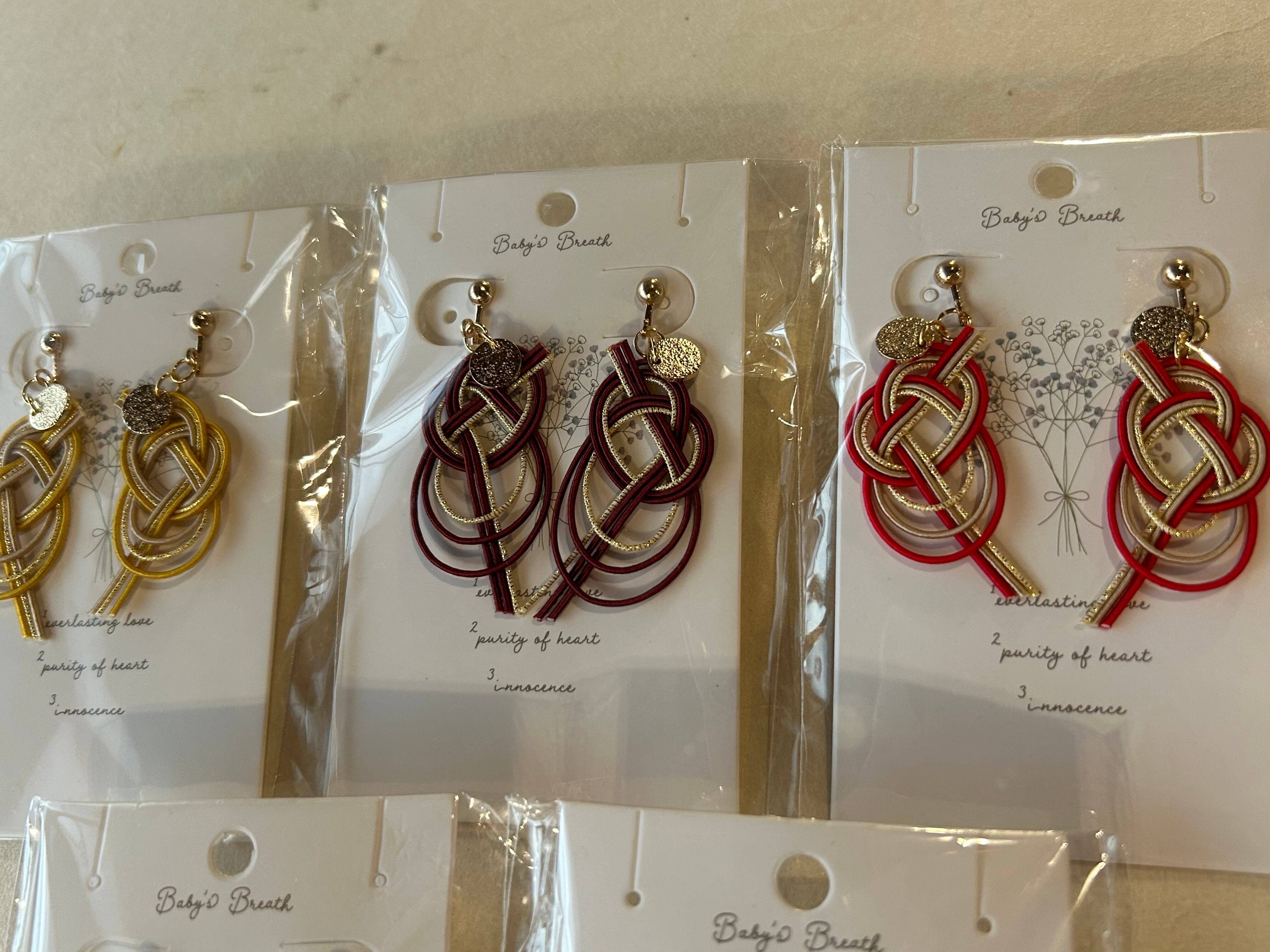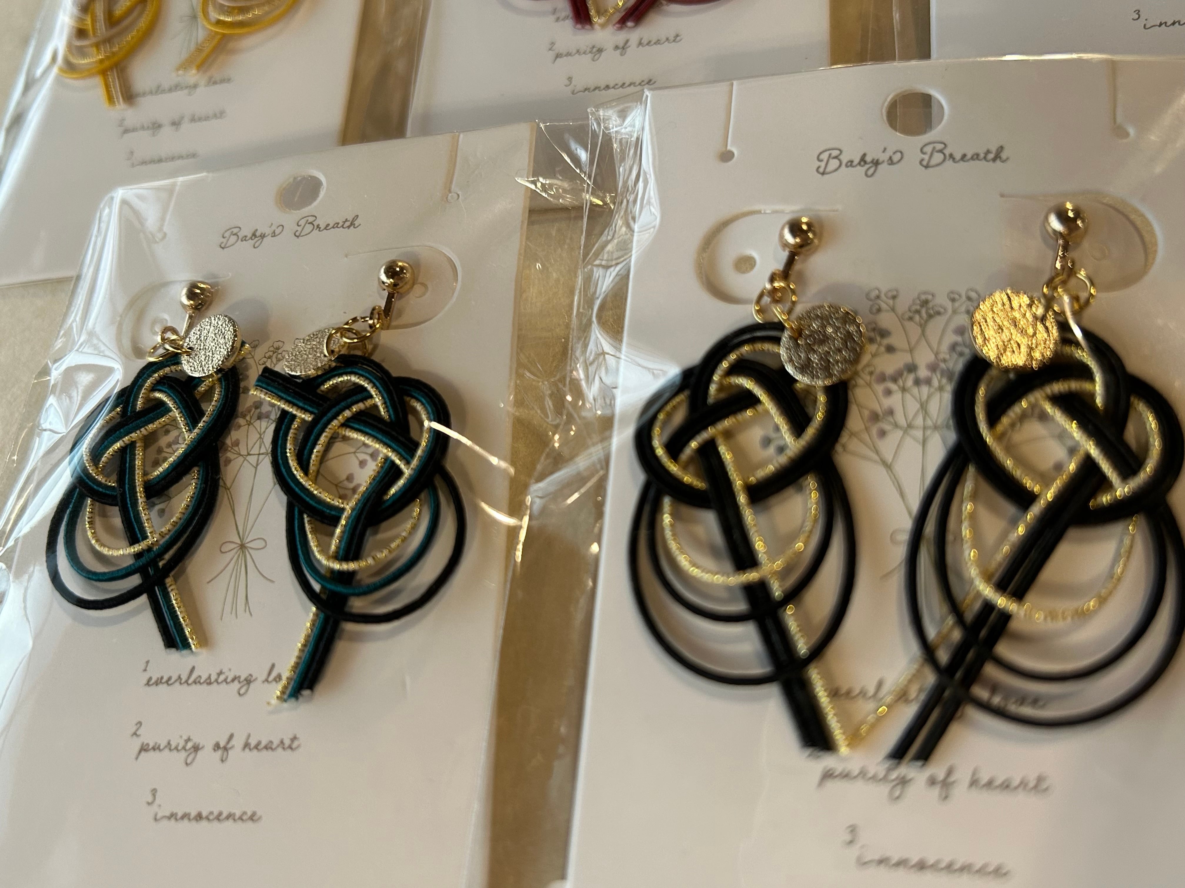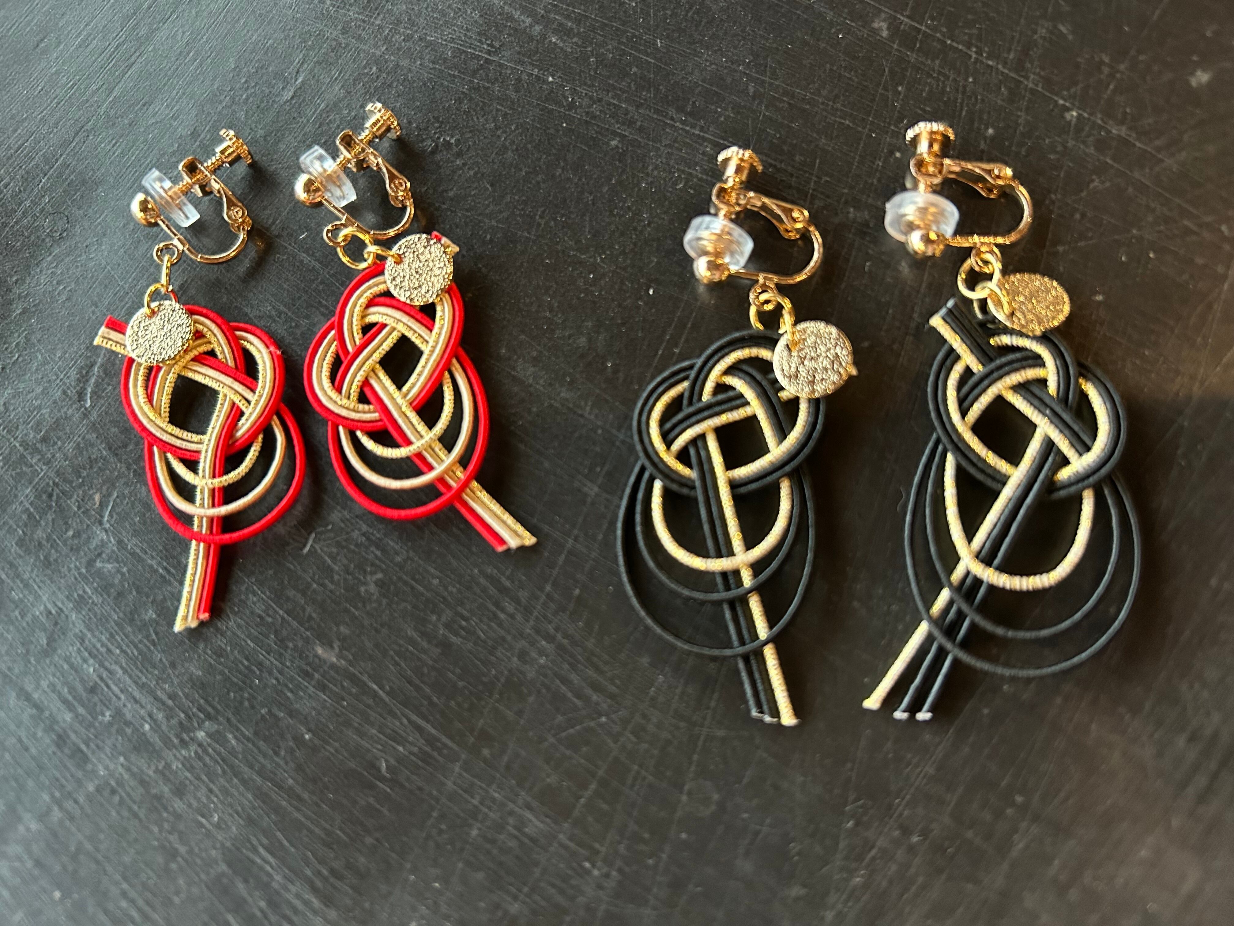 apetrenta作品。水引のイヤリング。長さ5センチ、幅2センチ。イヤリングはピアスにも変えられます。パーツの変更をご希望の場合は、少しお時間いただきます。(クラウドファンディングの返礼品のおすすめ品として、カタログのNO.17に掲載されている商品です。)