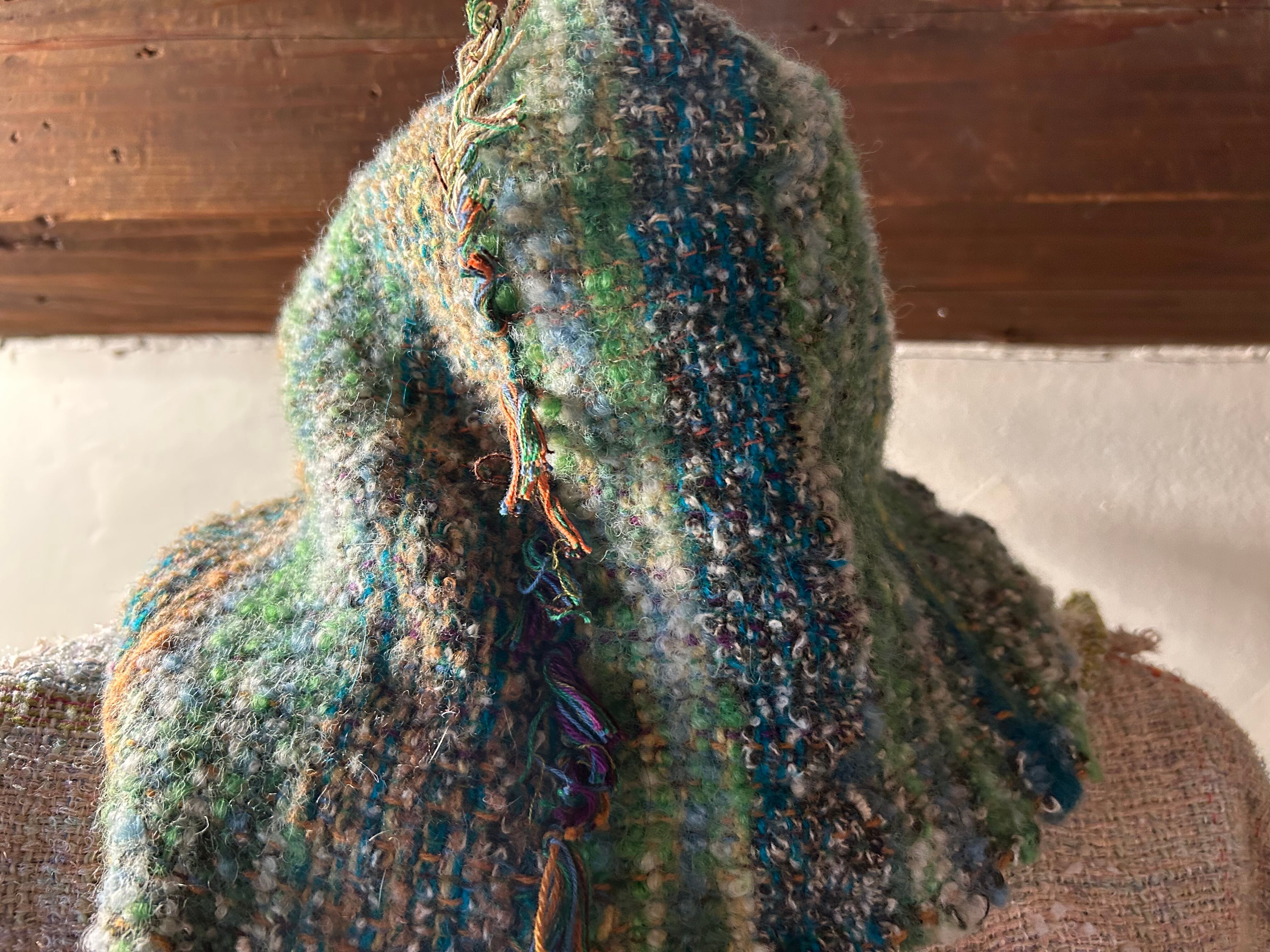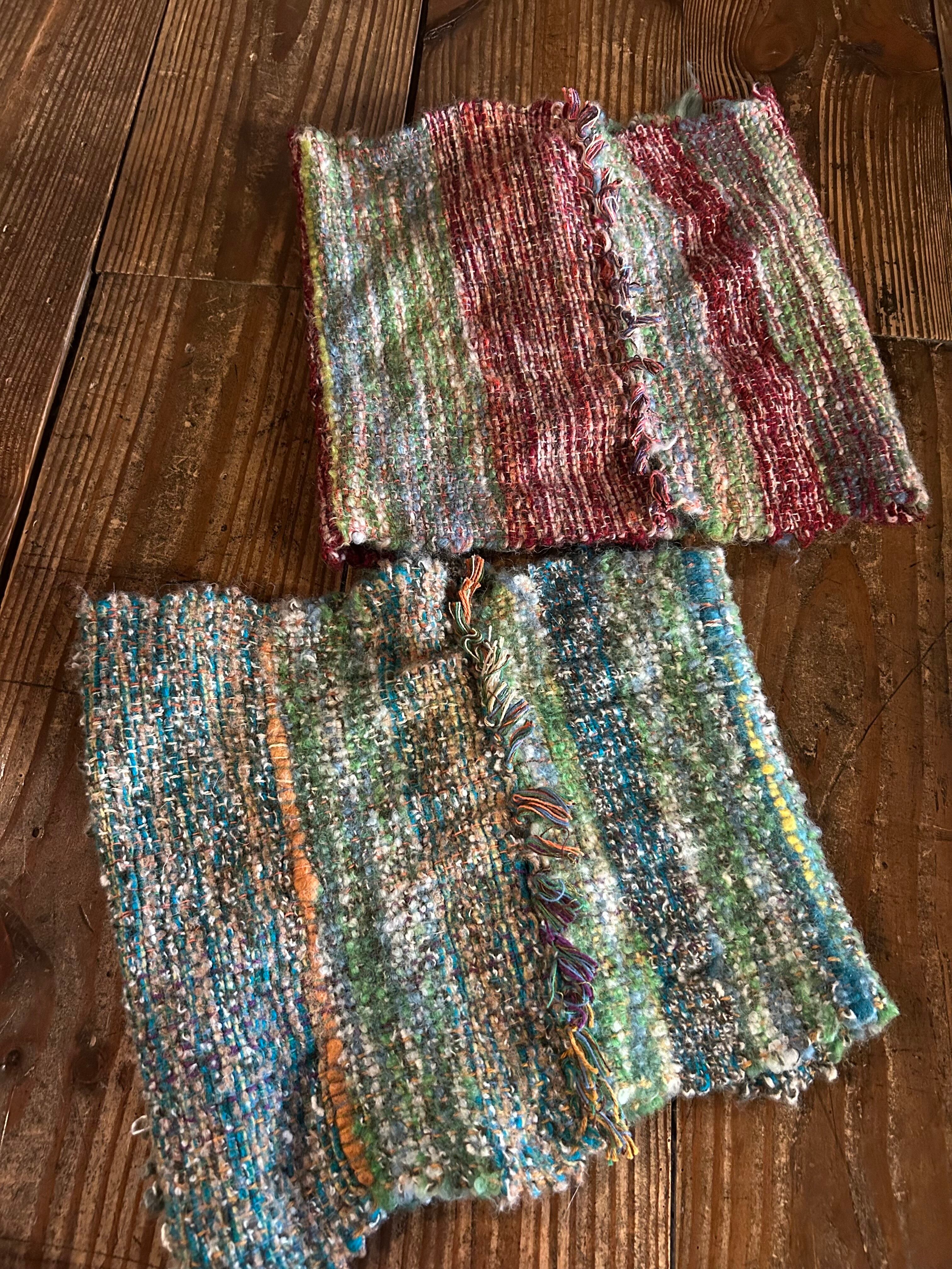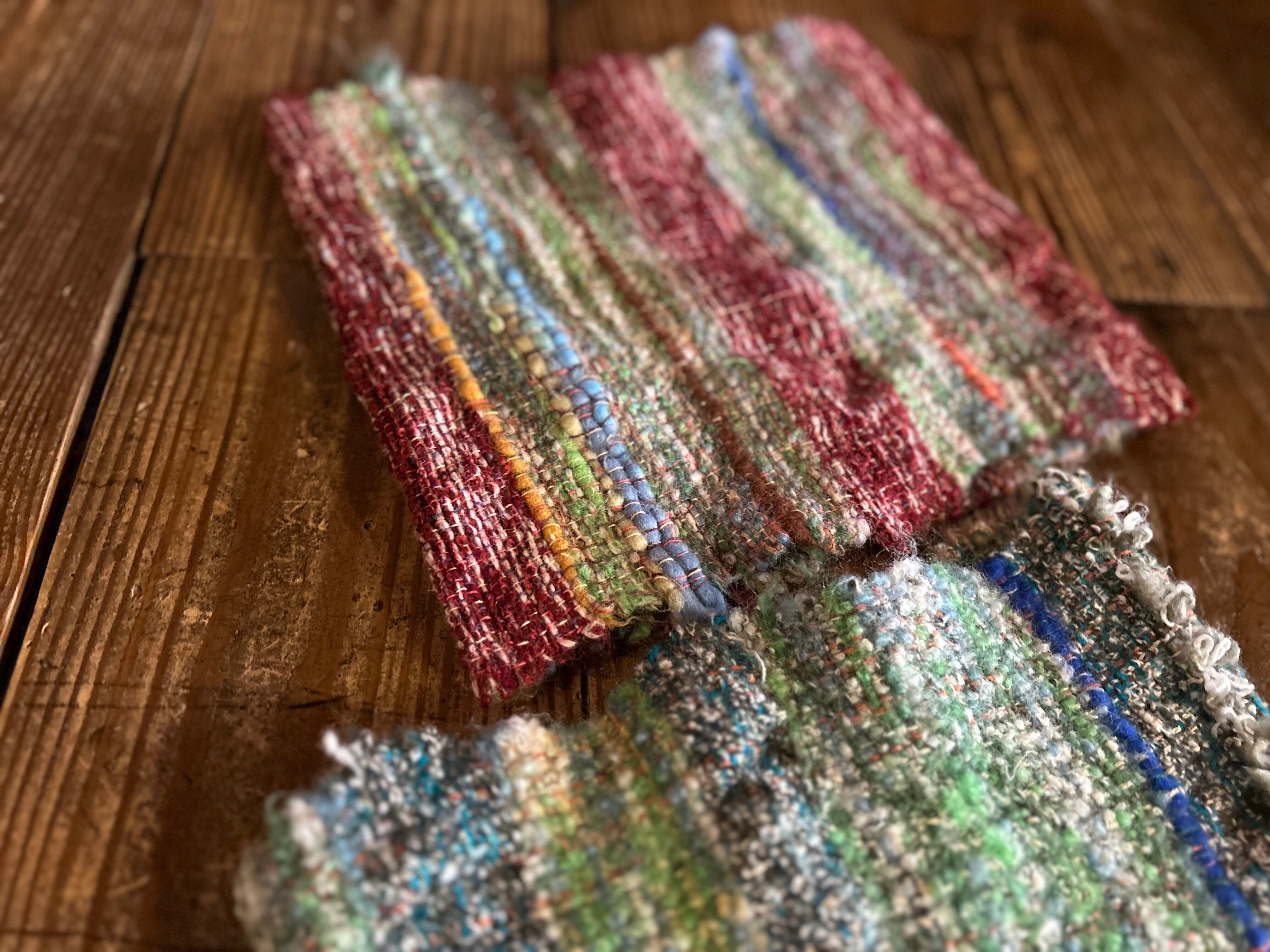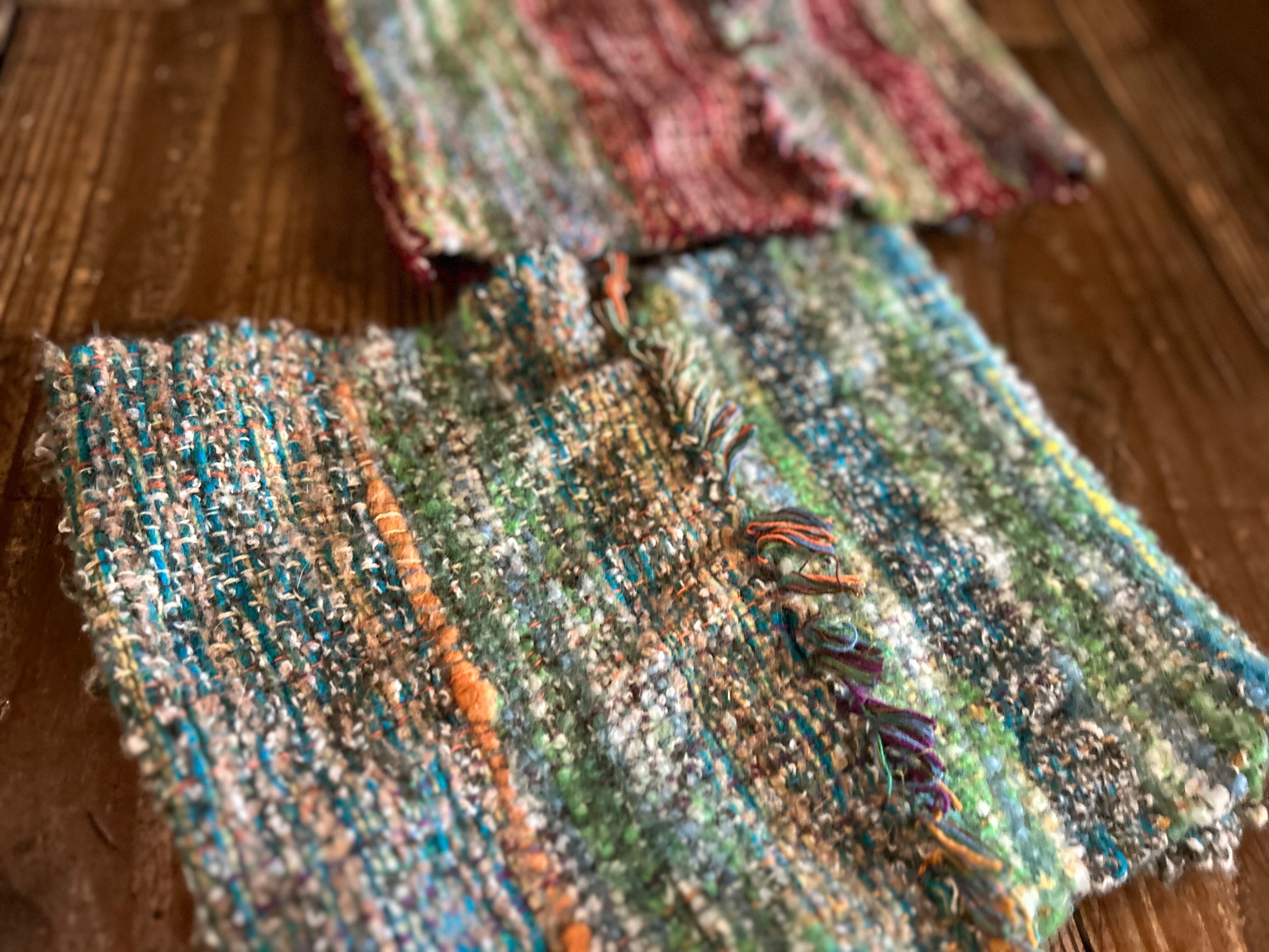 おひさまとくも作品。さをり織りのウォーマー。綿とウールの系で織られたあったかいネックウォーマー。全て一点もののため、こちらの作品が売れた場合はお作りが可能ですが、同じ色柄にはなりません。(クラウドファンディングの返礼品のおすすめ品として、カタログのNO.12に掲載されている商品です。)