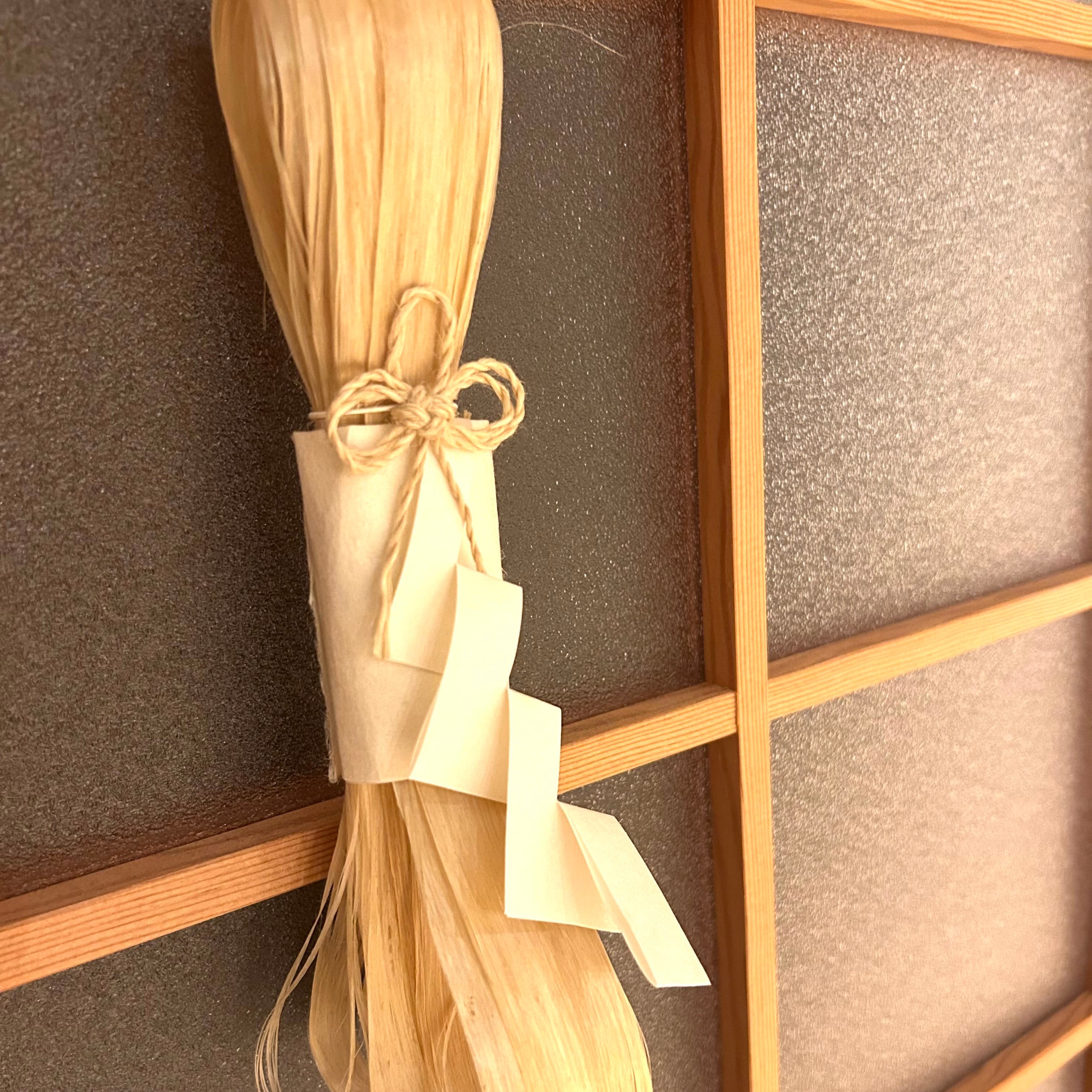 精麻の壁飾り。玄関やお部屋に飾ってお使いください。精麻は生産農家さんも限られてる貴重なものです。古来より日本では神事などに使われてきました。こちらは一枚の精麻を束ねたものですので、しばらく飾った後は、ご自分で結んで紐を作ったりもできます。(クラウドファンディングの返礼品のおすすめ品として、カタログのNO.20に掲載されている商品です。)