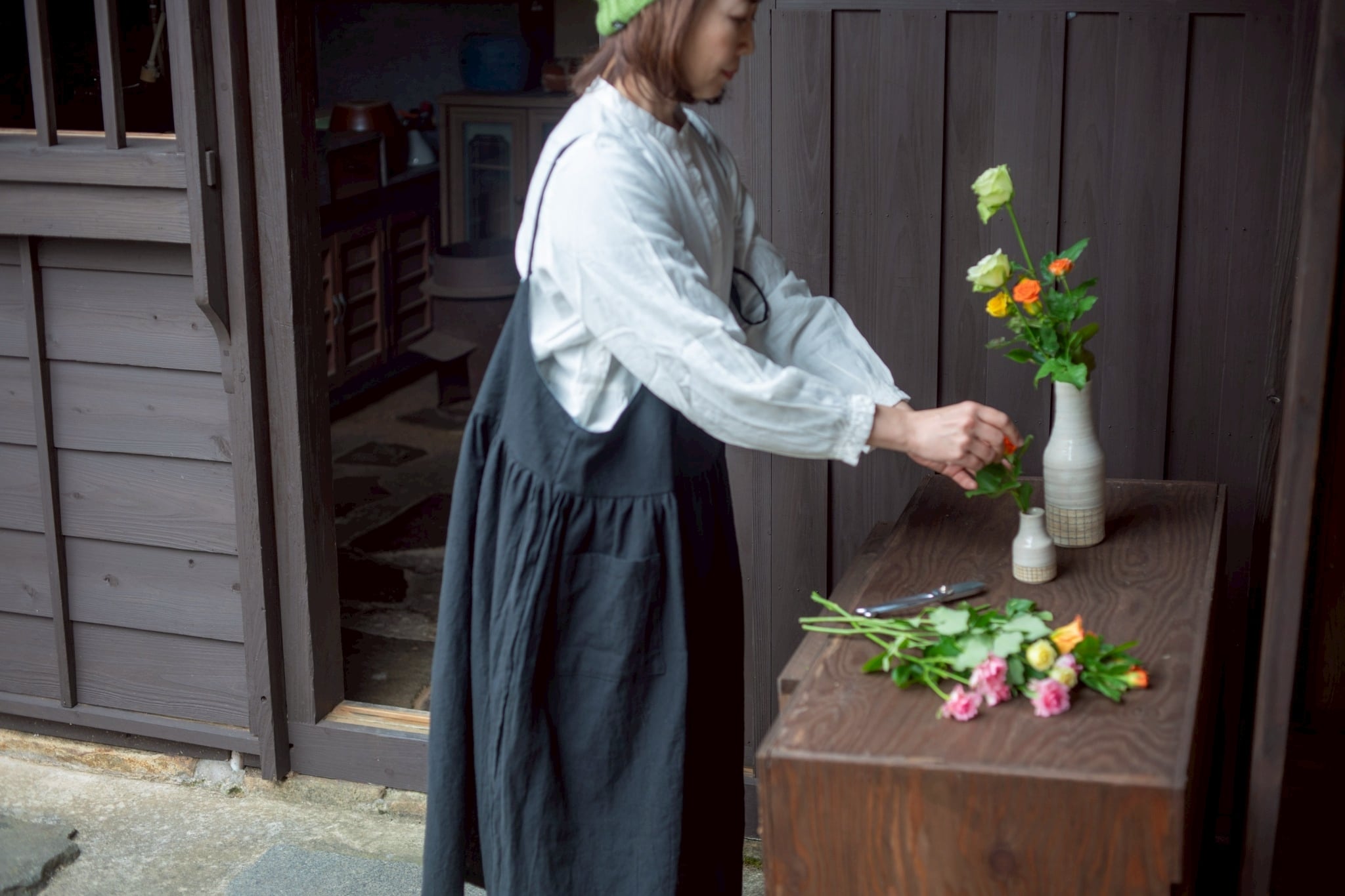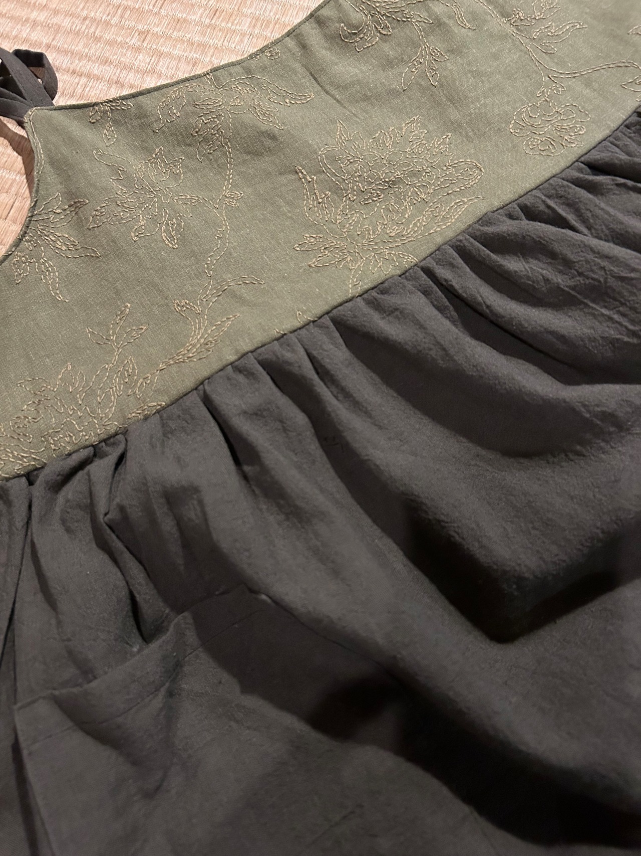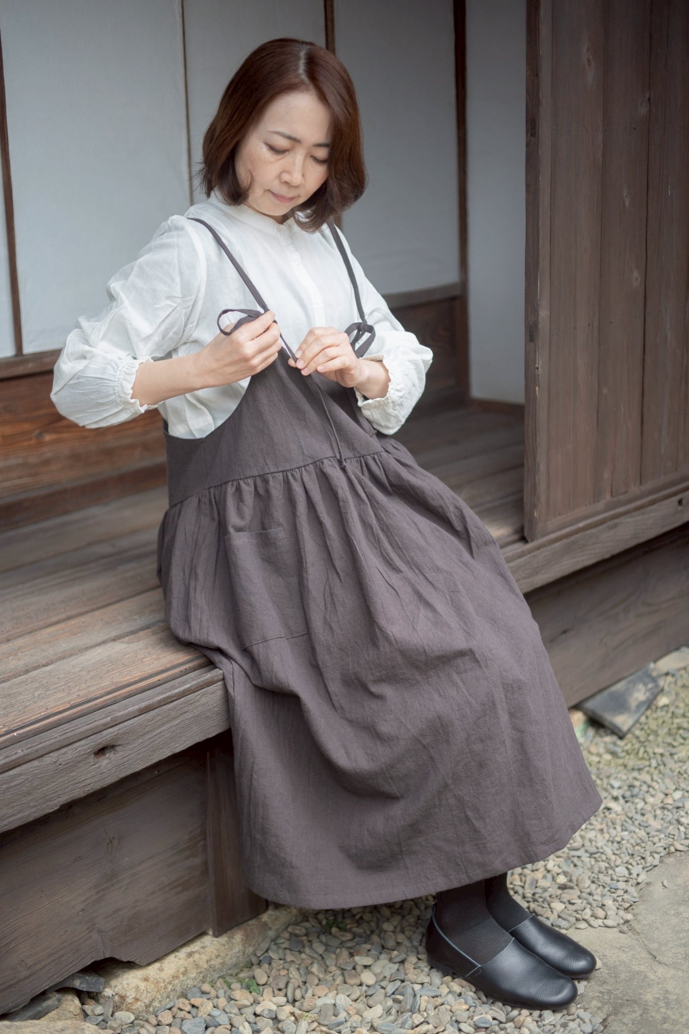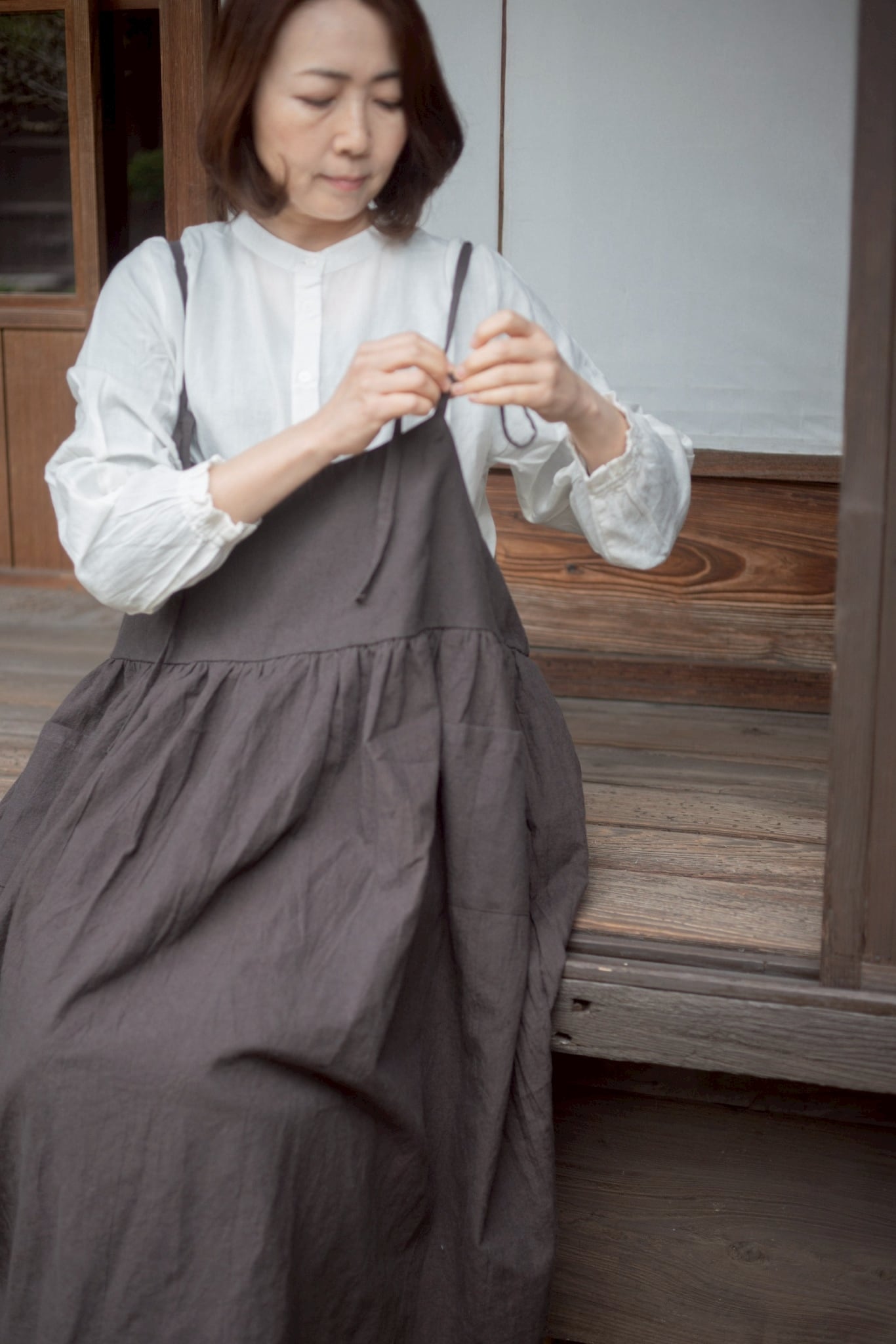 日々ノ着作品。フリーサイズの綿麻100%。肩紐の前の方で紐の長さを調節できます。(丈は自由に変えられます。)ポケット2個ついてます。エプロンとしてだけでなく、ワンピースとして着用していただけます。