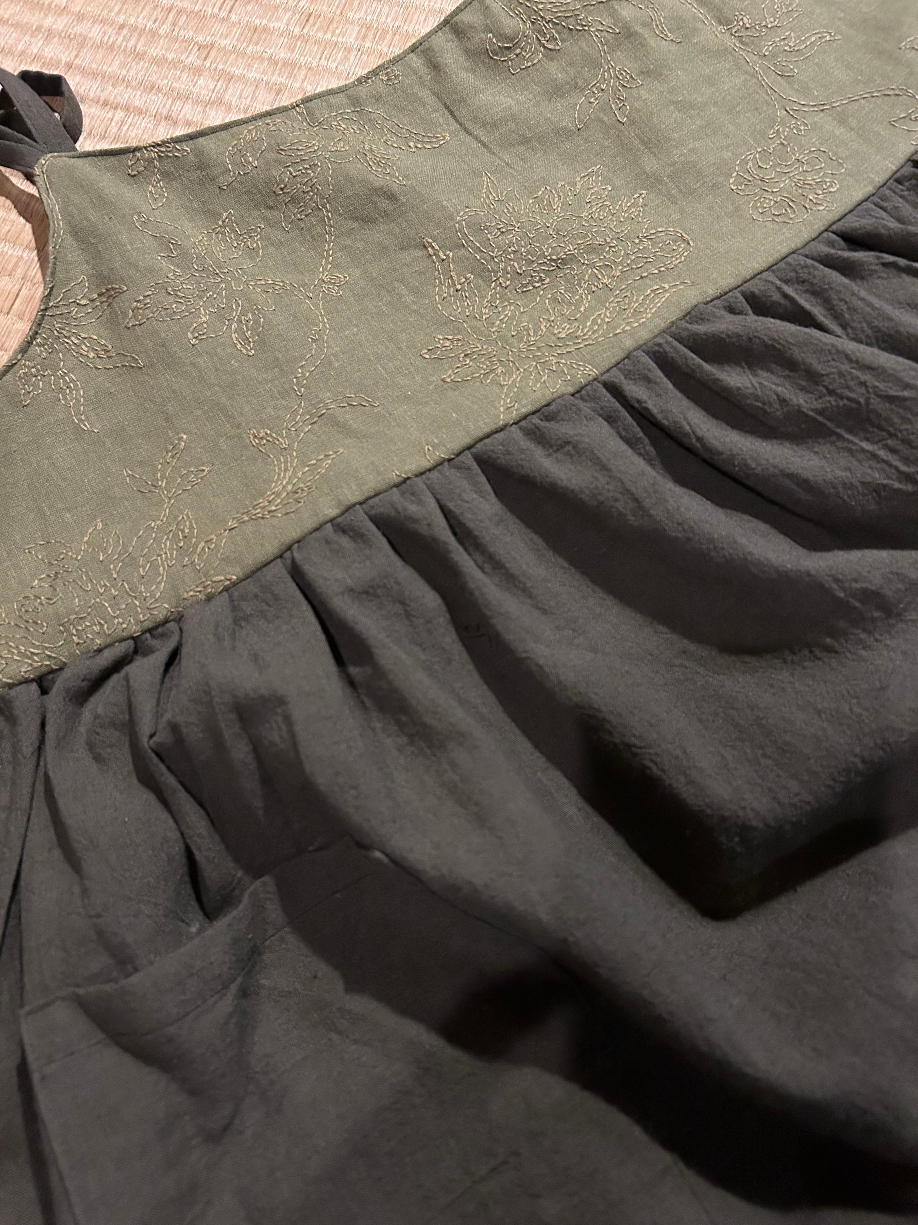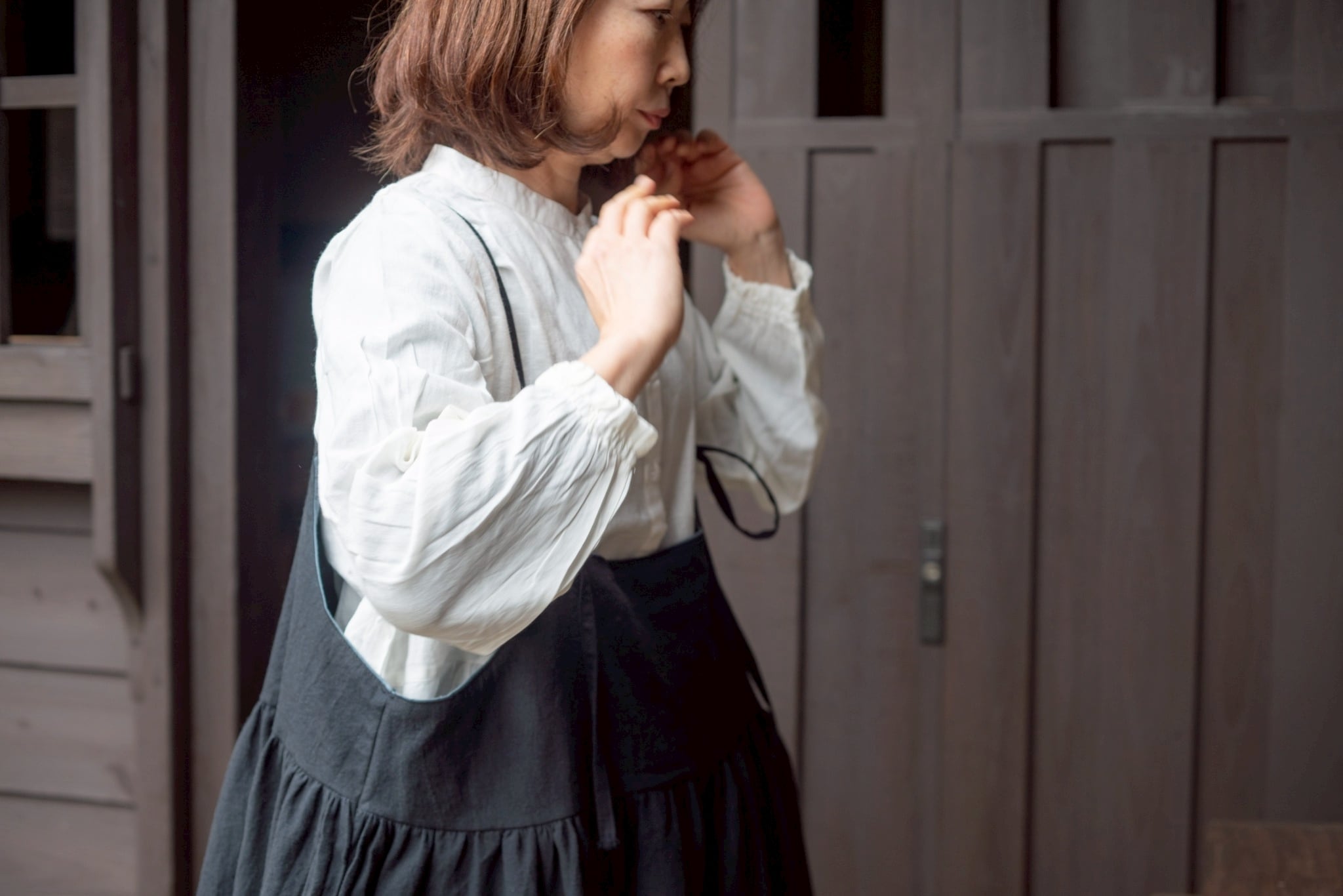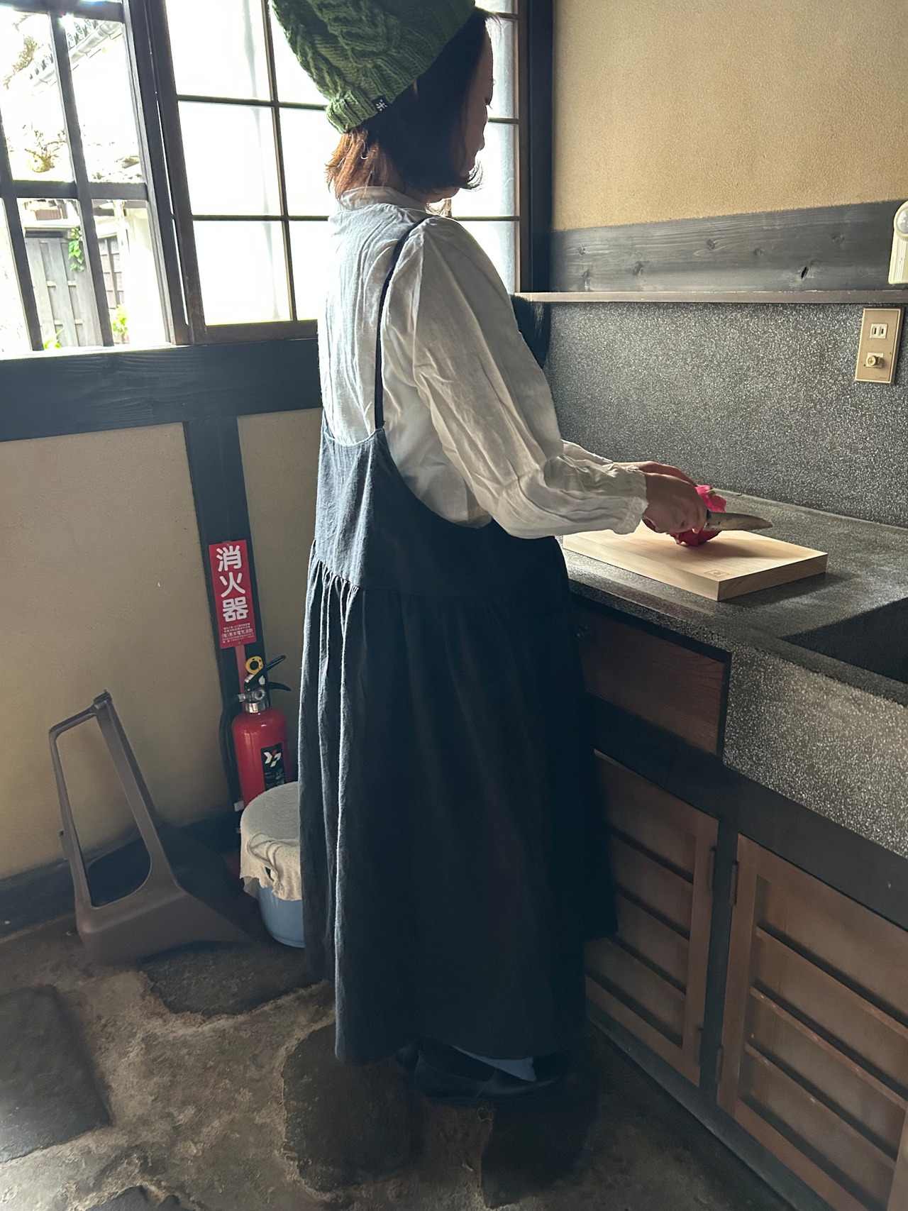 日々ノ着作品。フリーサイズの綿麻100%。肩紐の前の方で紐の長さを調節できます。(丈は自由に変えられます。)ポケット2個ついてます。エプロンとしてだけでなく、ワンピースとして着用していただけます。