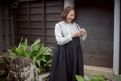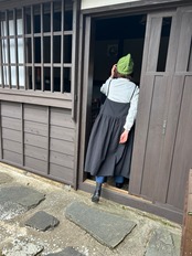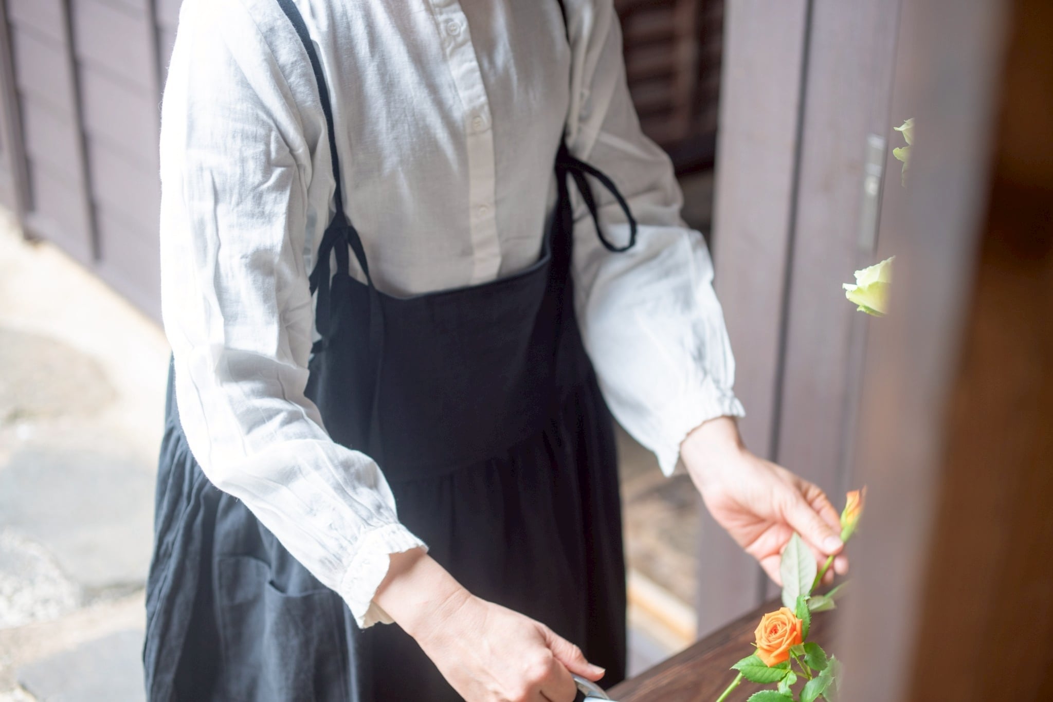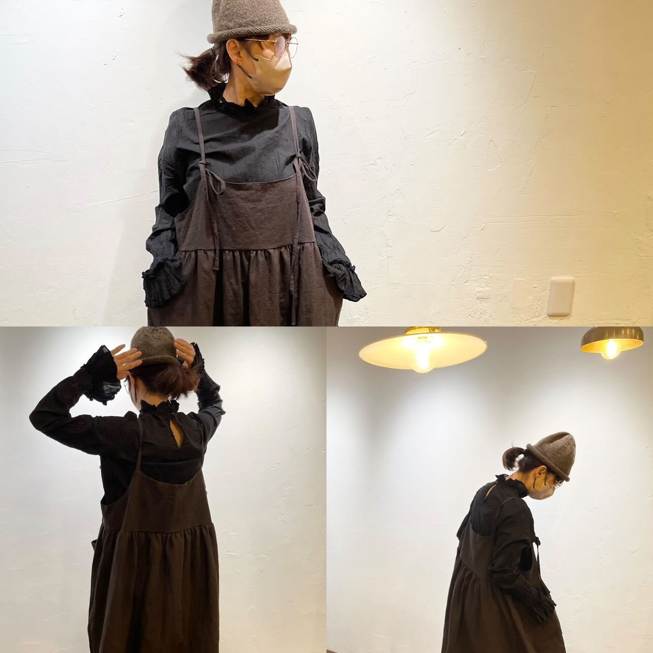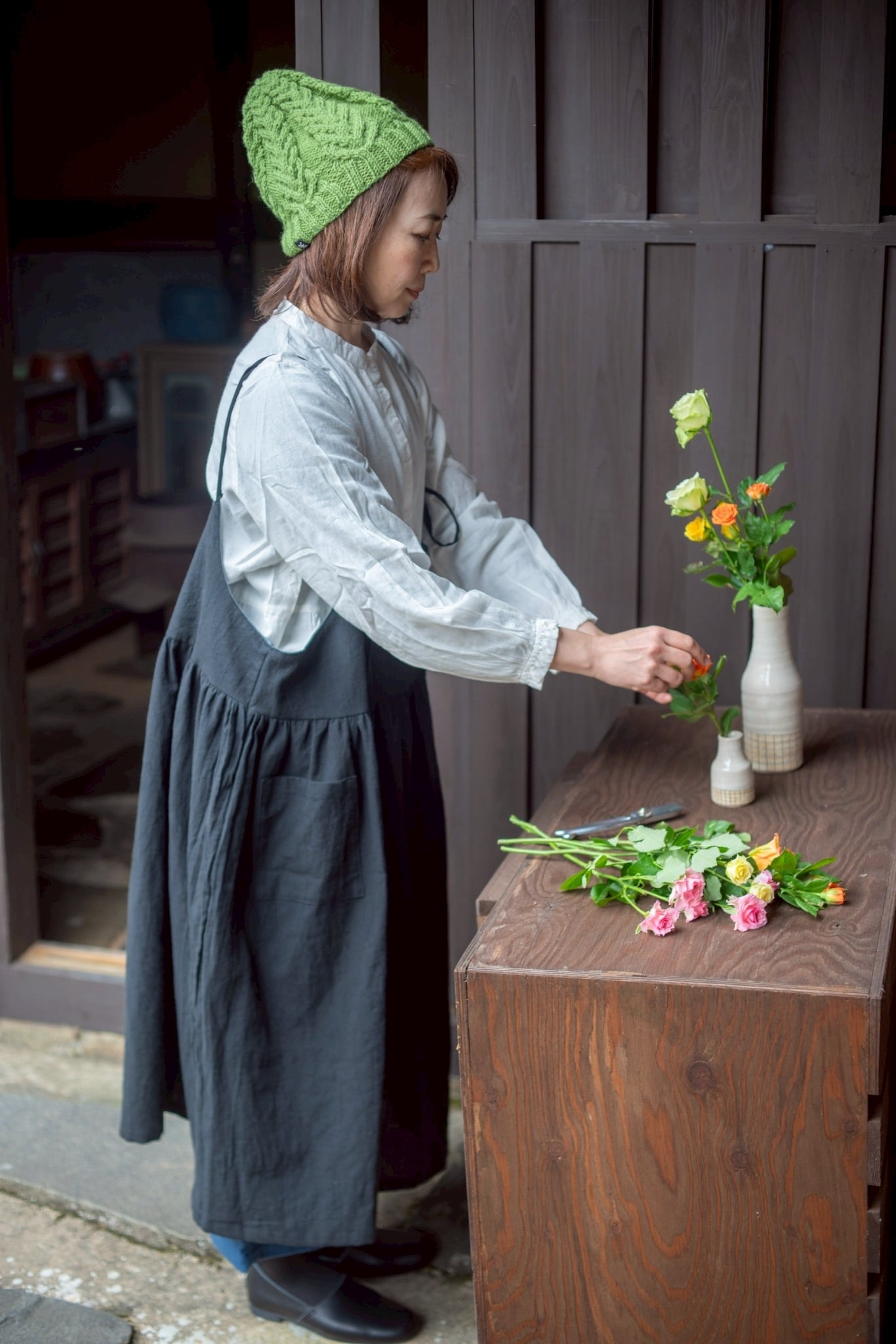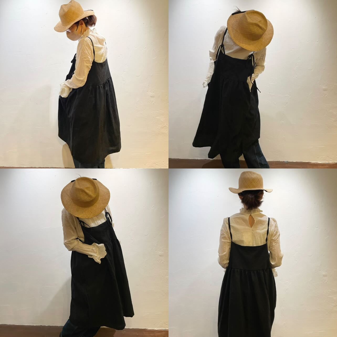 日々ノ着作品。フリーサイズの綿麻100%。肩紐の前の方で紐の長さを調節できます。(丈は自由に変えられます。)ポケット2個ついてます。エプロンとしてだけでなく、ワンピースとして着用していただけます。