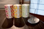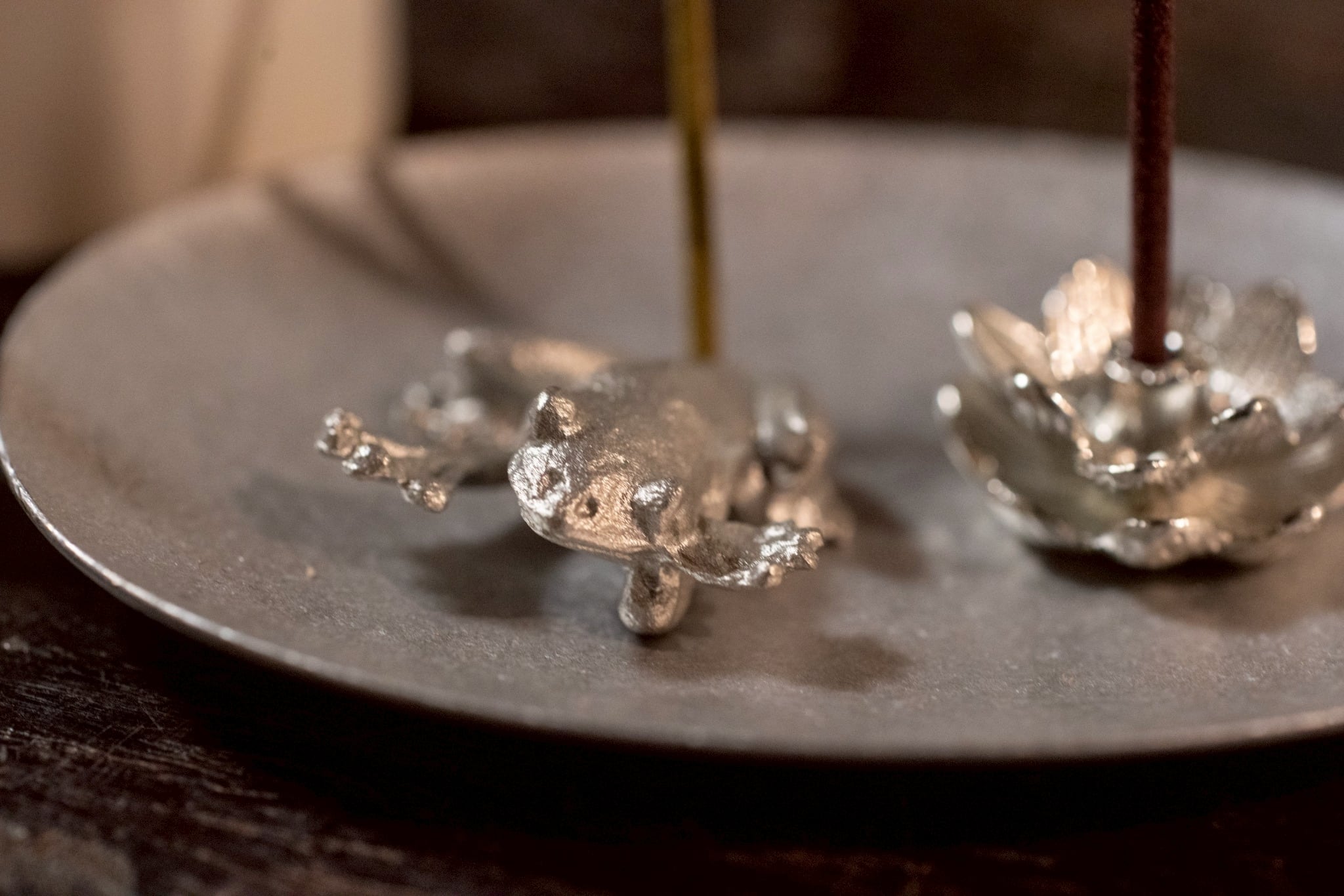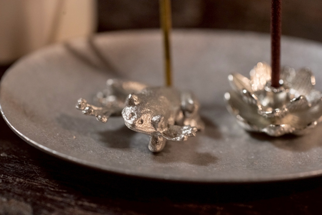 ギフトとしてもおすすめの錫のお香立て。パッケージがわっぱ。パッケージのサイズは6✖️4✖️3cm。種類は4種類あります。蓮、蛙、兎、五弁桜。