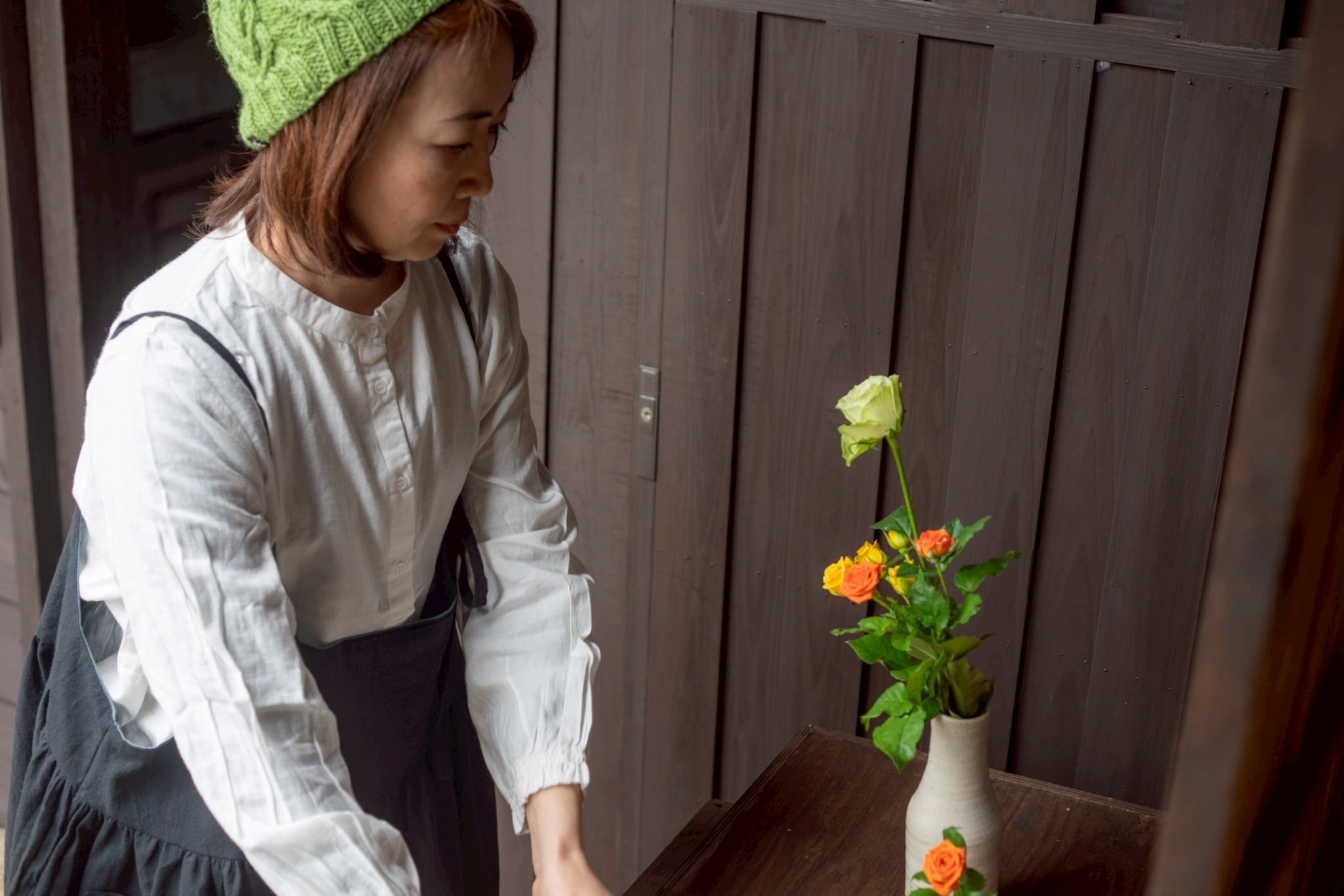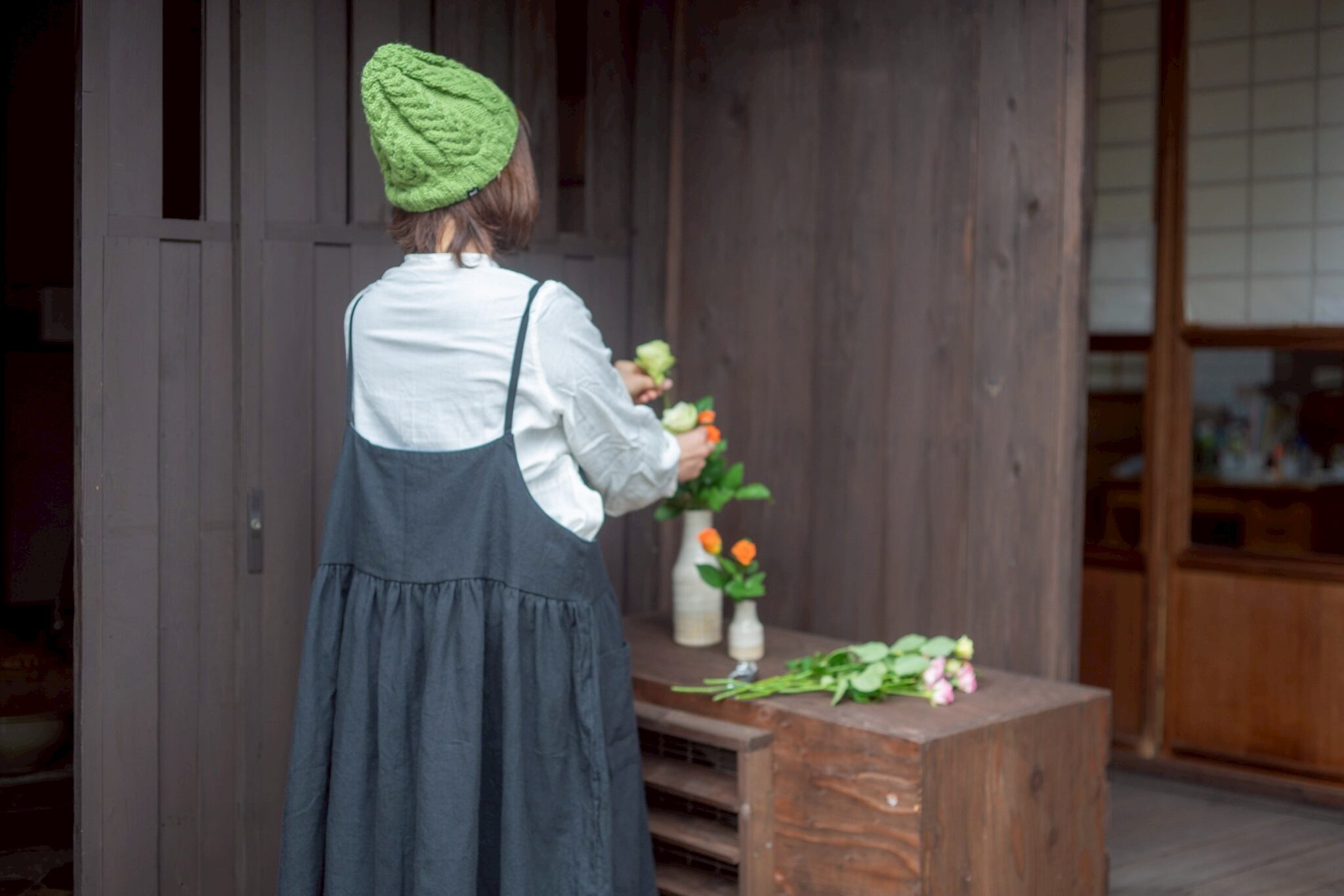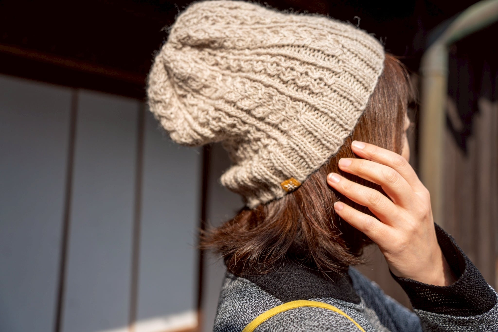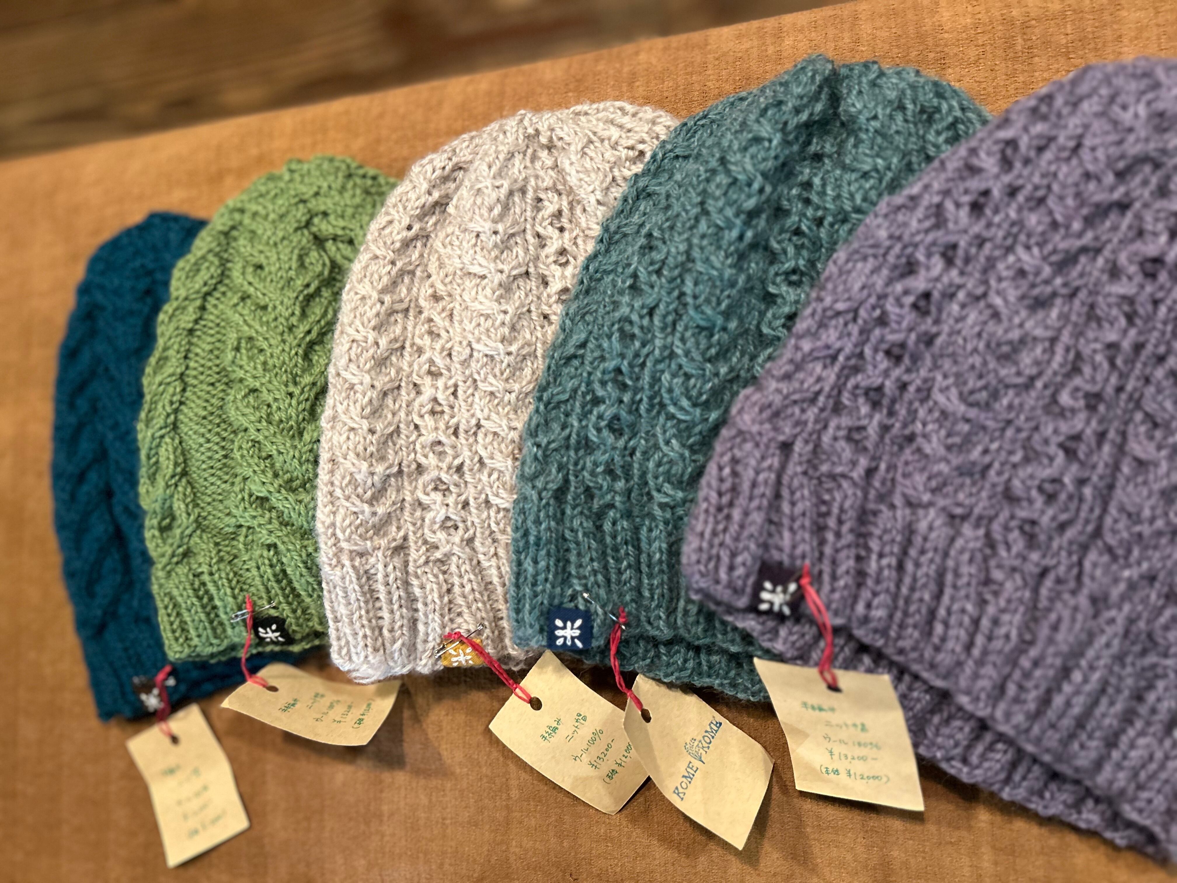 SUEMI 作品。手編みのニット帽。ウール100%。サイズフリー。