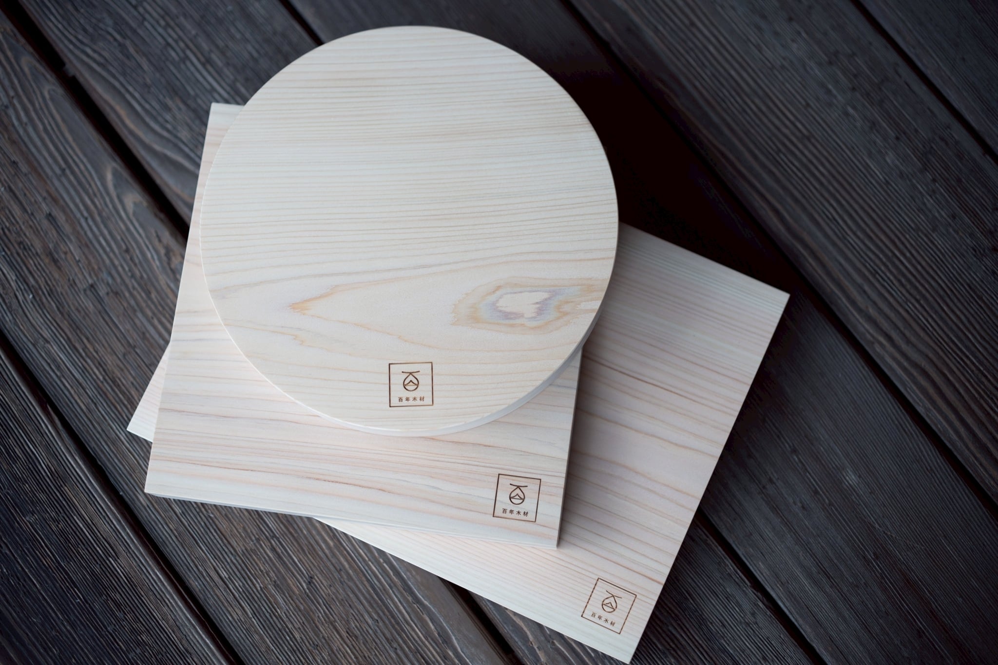 地元日向市の百年木材さんのこだわりのまな板。樹齢百年越えの国産ヒノキが材料です。また板はそれぞれ日本的な柄をイメージさせるカタチで、価格もそれぞれちがいます。巴(丸型)サイズ直径24、厚み3cm。