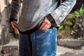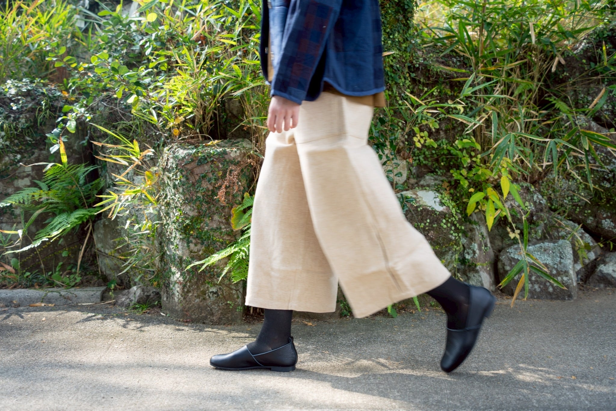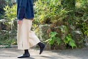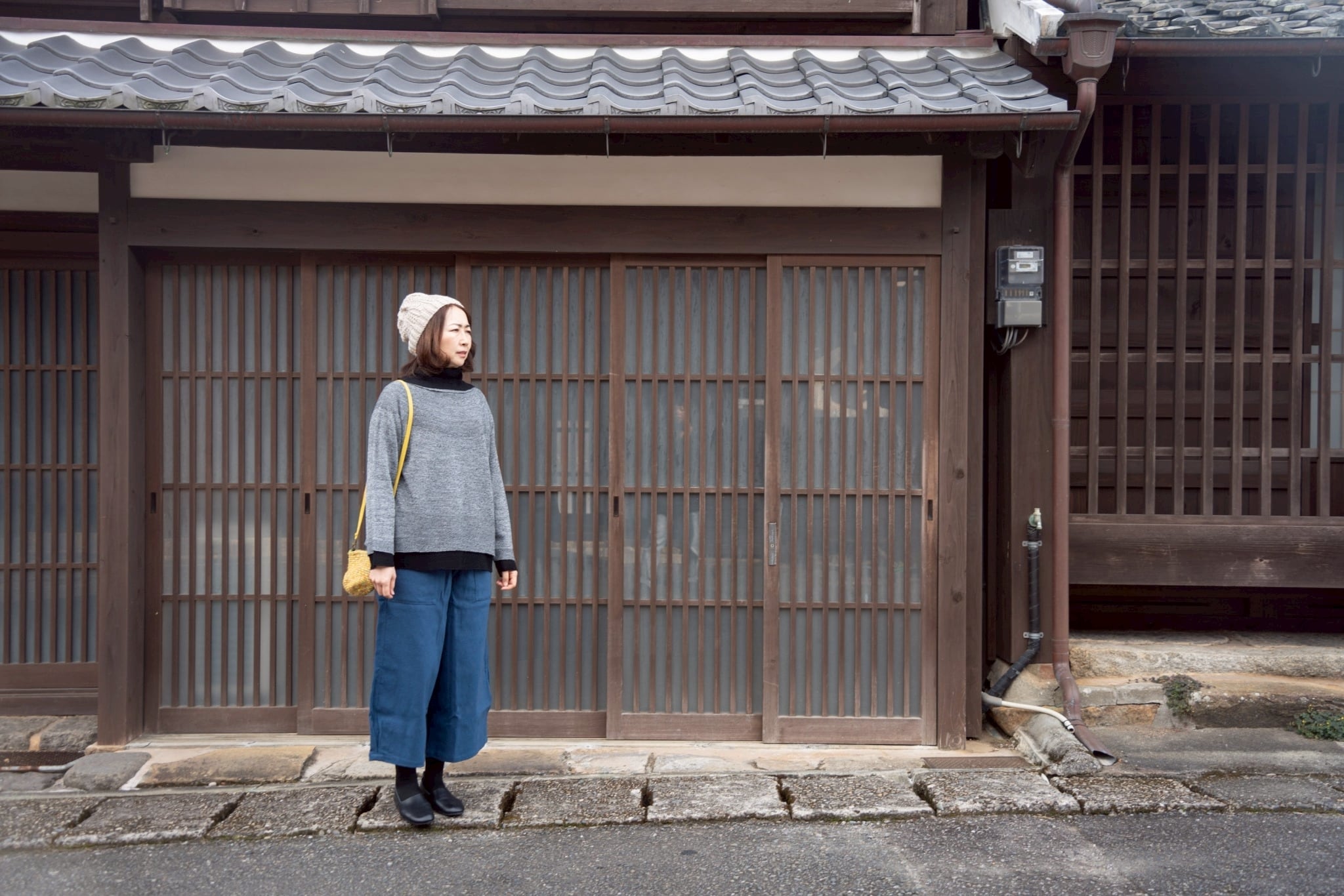 大きなポケットが前後にふたつずつ。手織りの厚地の生地と、ポケット、コクーンシルエットがポイントの短めパンツ。モデル身長160cm。着丈85cm。ウエスト64-77cm。綿100%。
