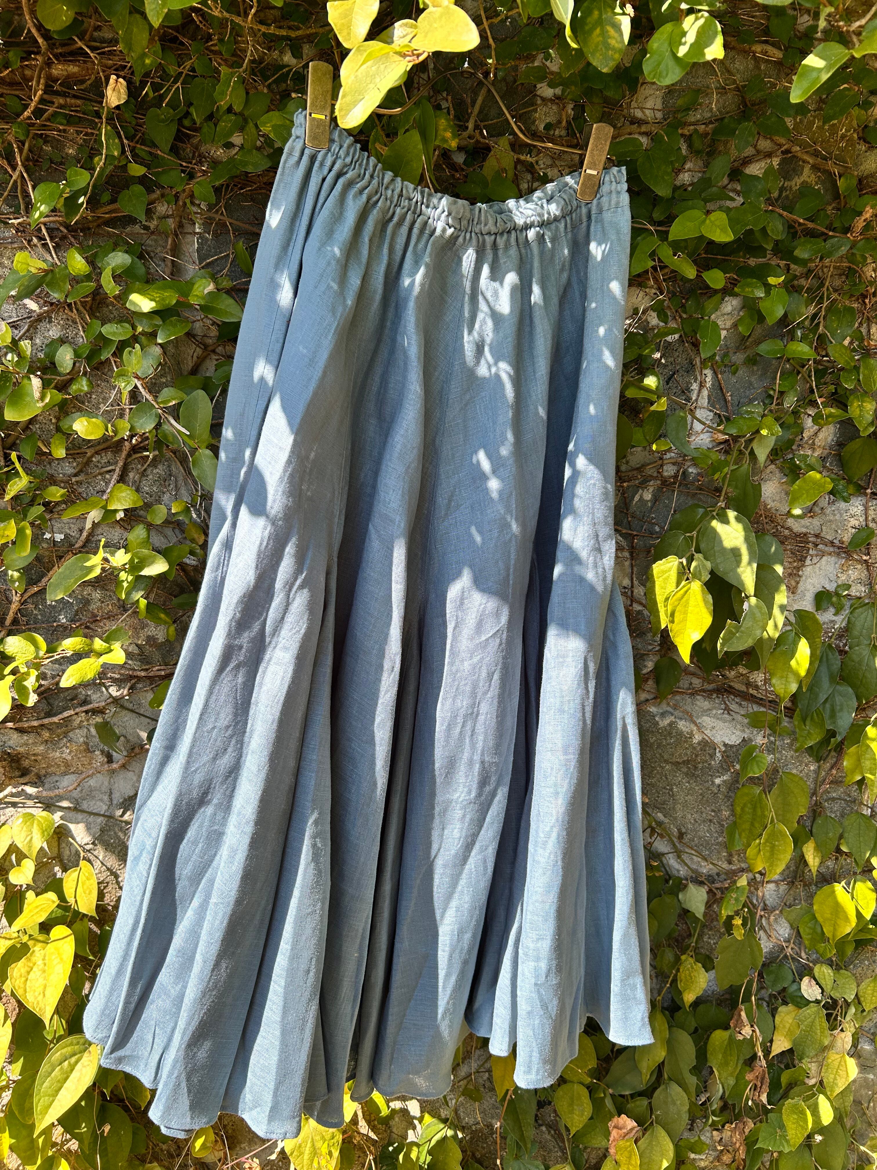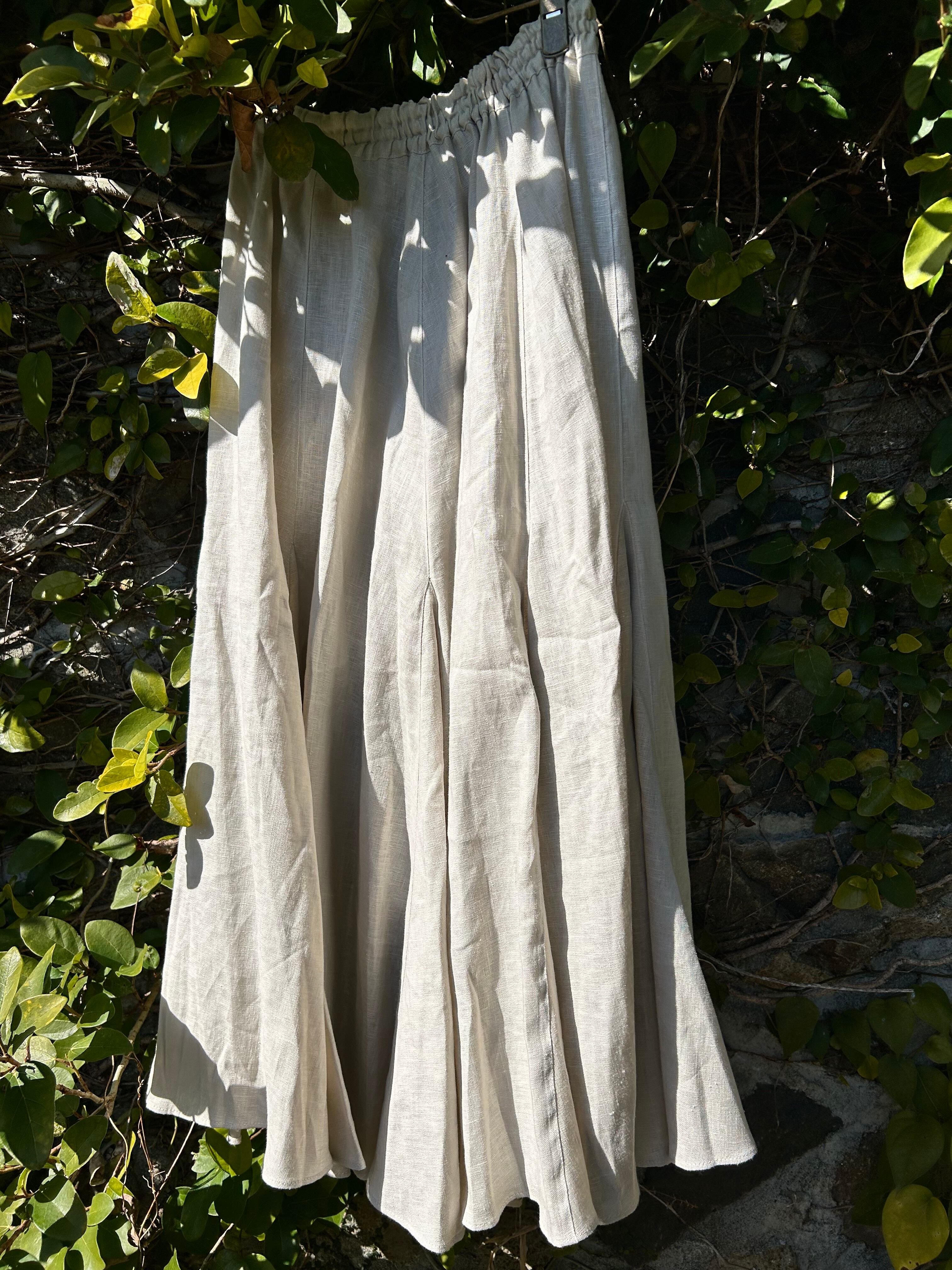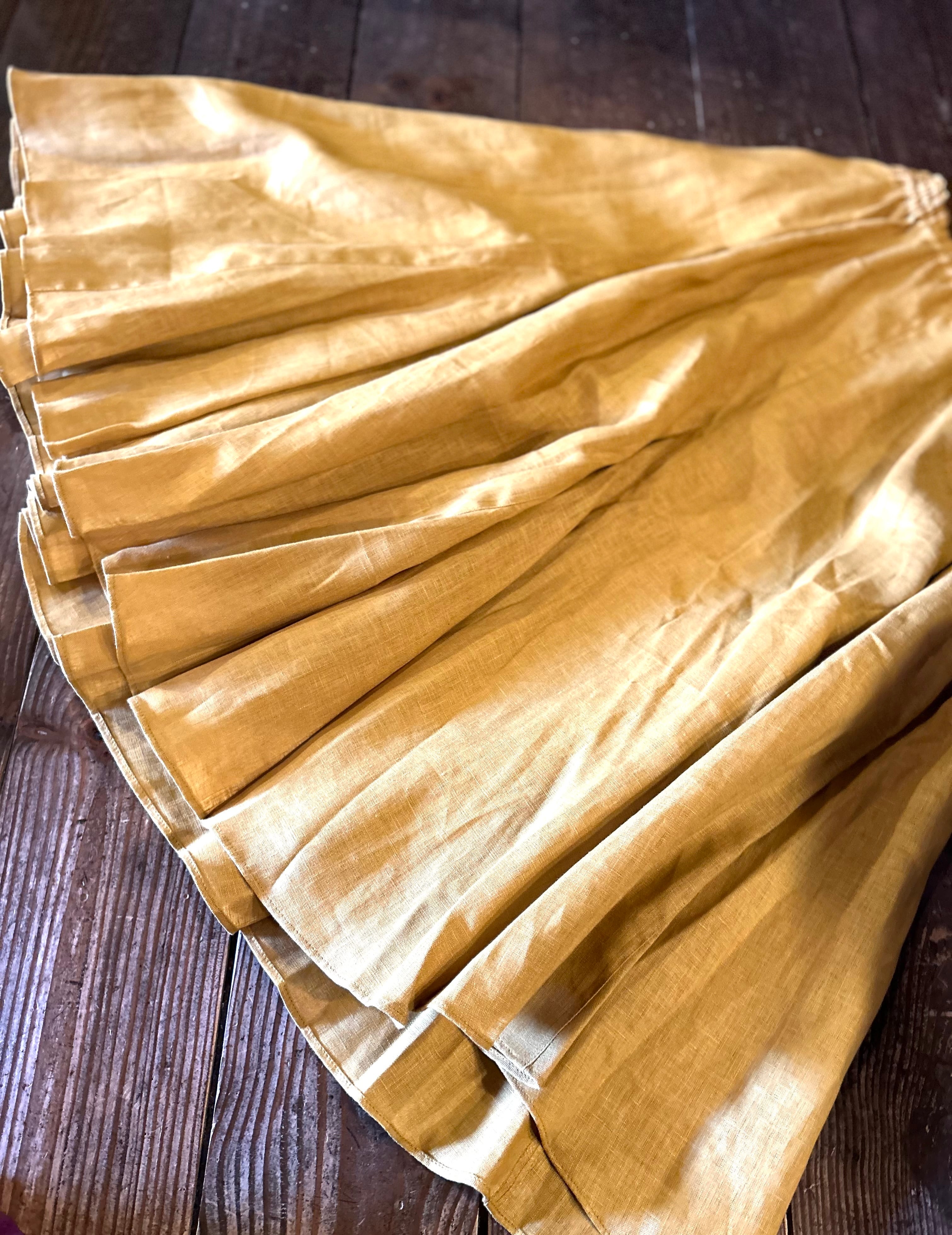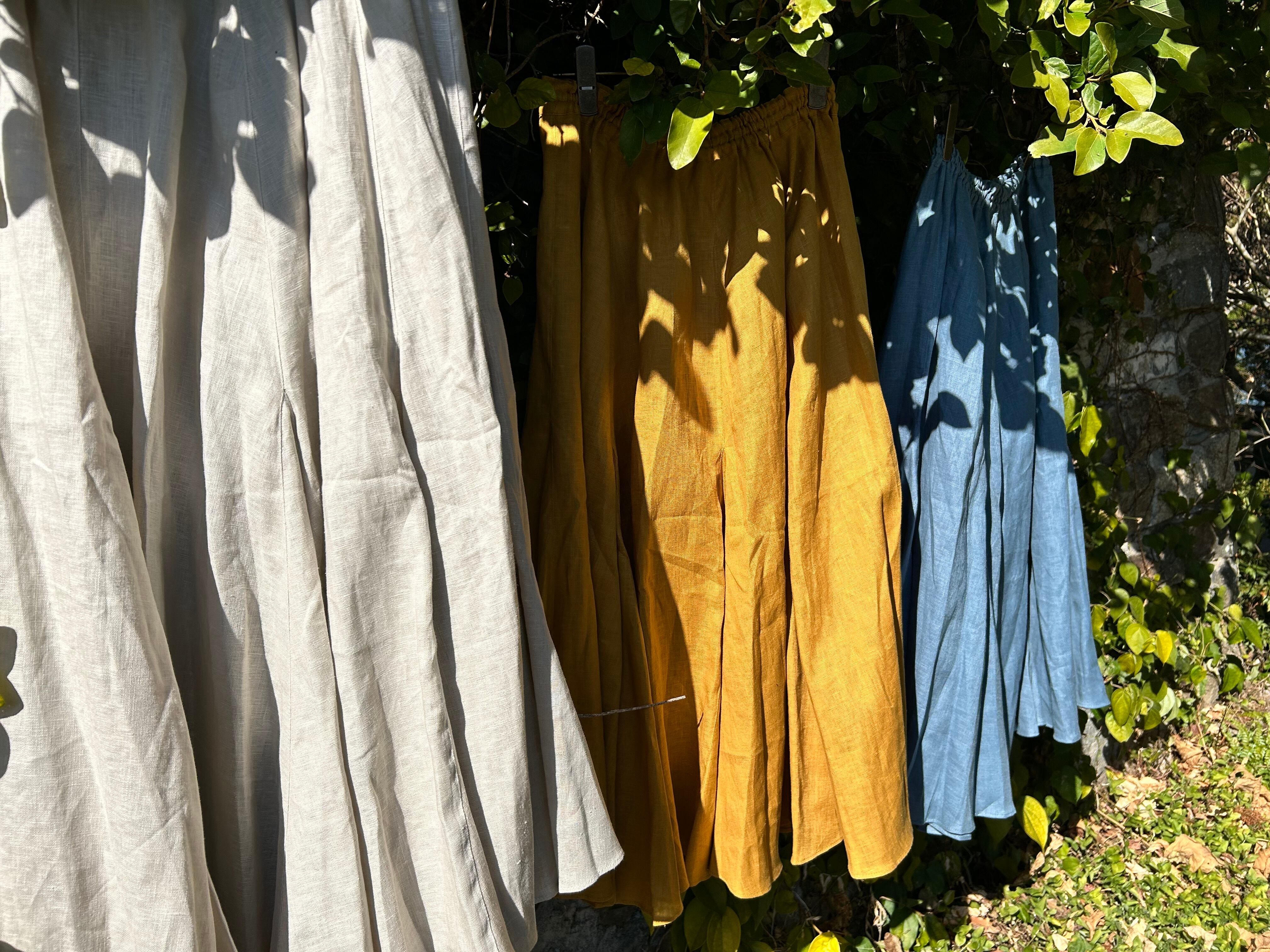 SUEMI 作品。リネン素材のフレアが贅沢なスカート。ウエスト総ゴム。着丈85cm。夏には、Tシャツやカットソー1枚と合わせれば、もうシンプルにおしゃれにまとまるリネンをふんだんに使ったスカートです。丈の長さなど調整いたします。