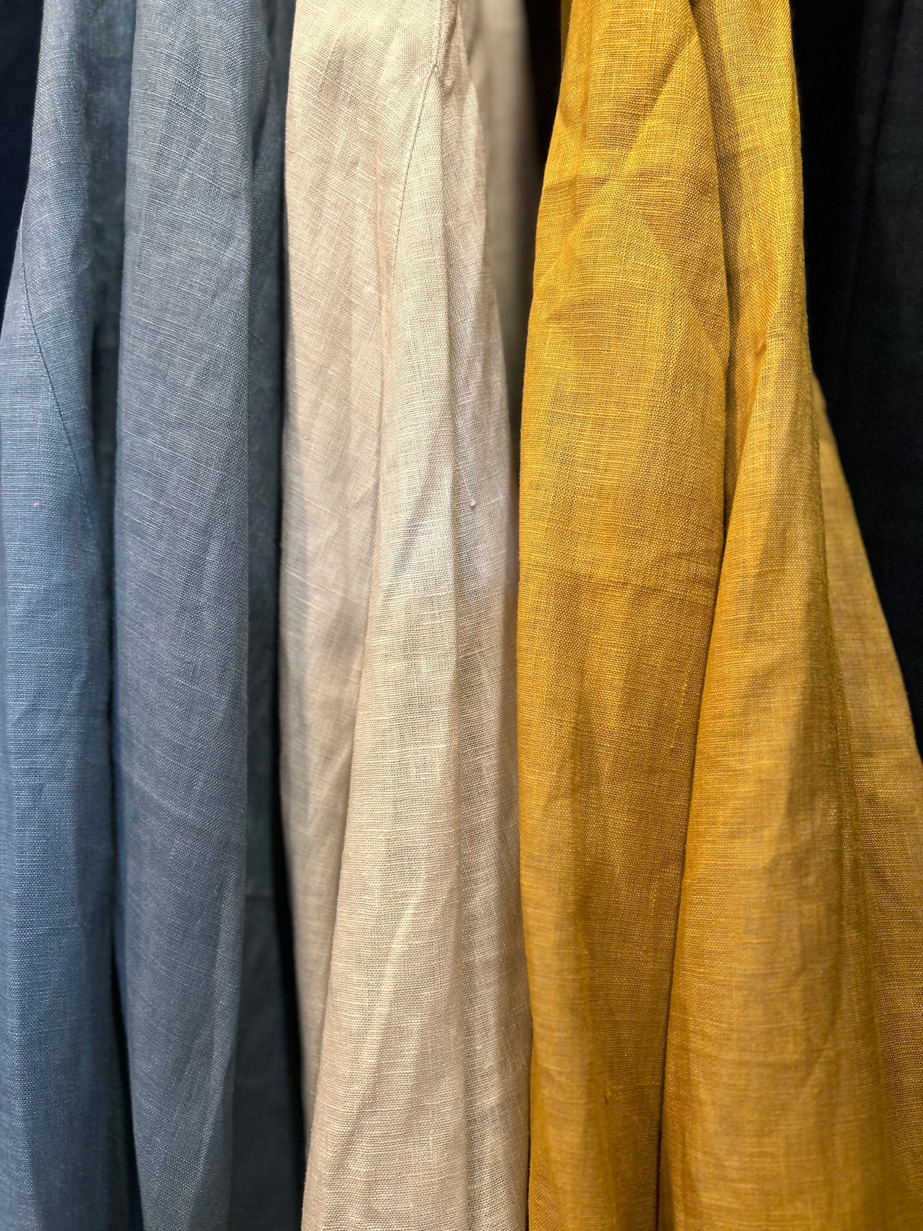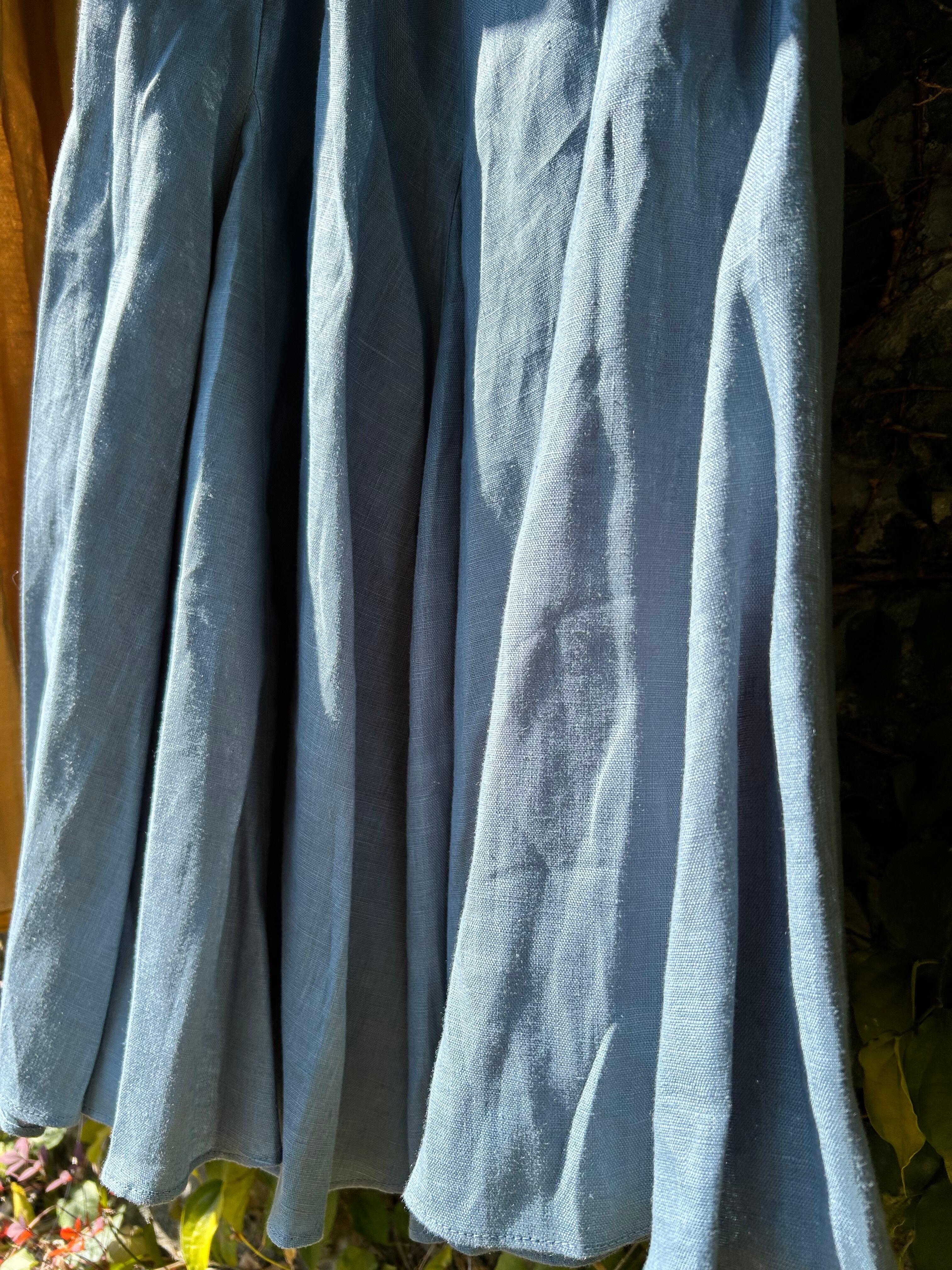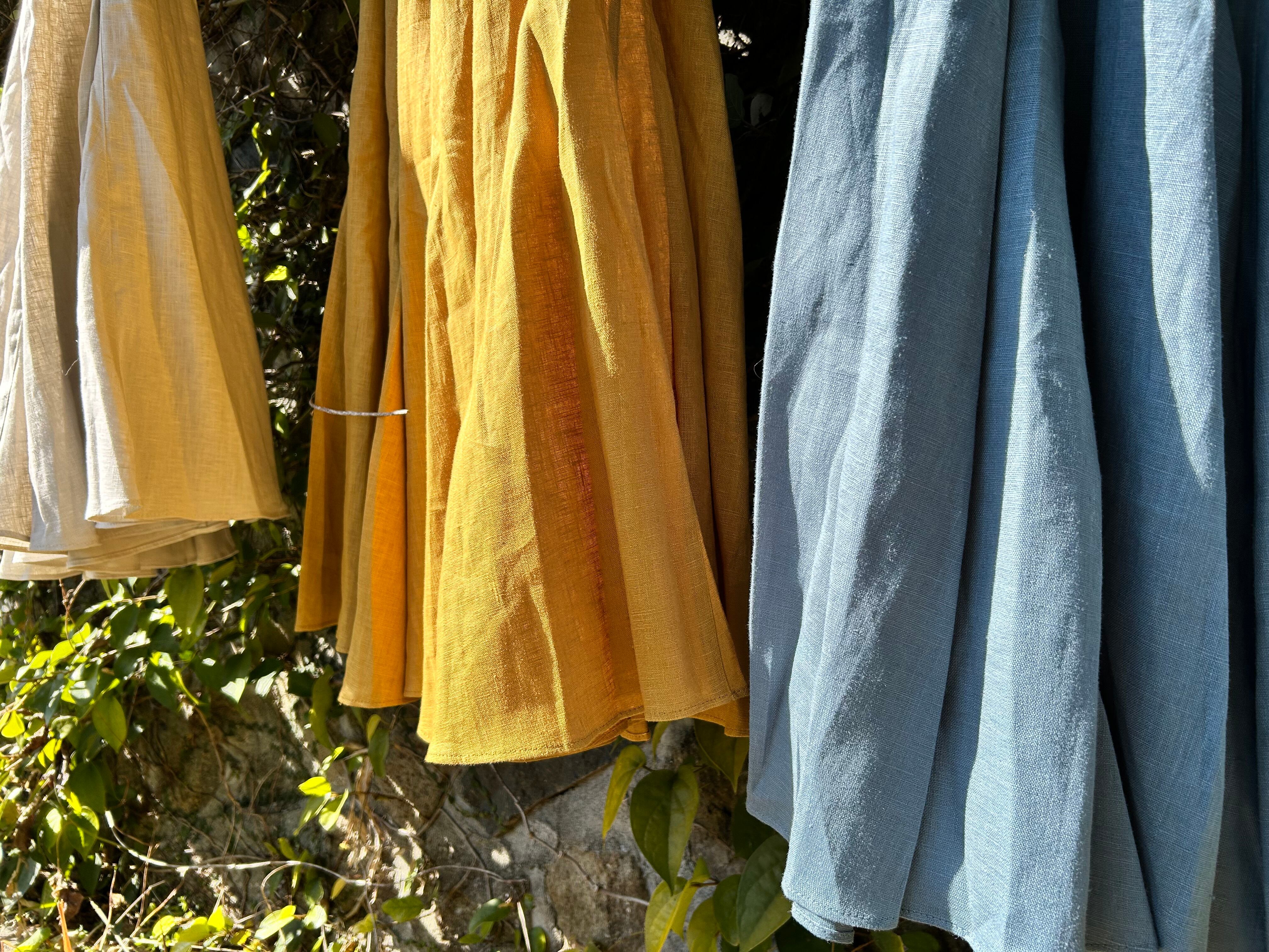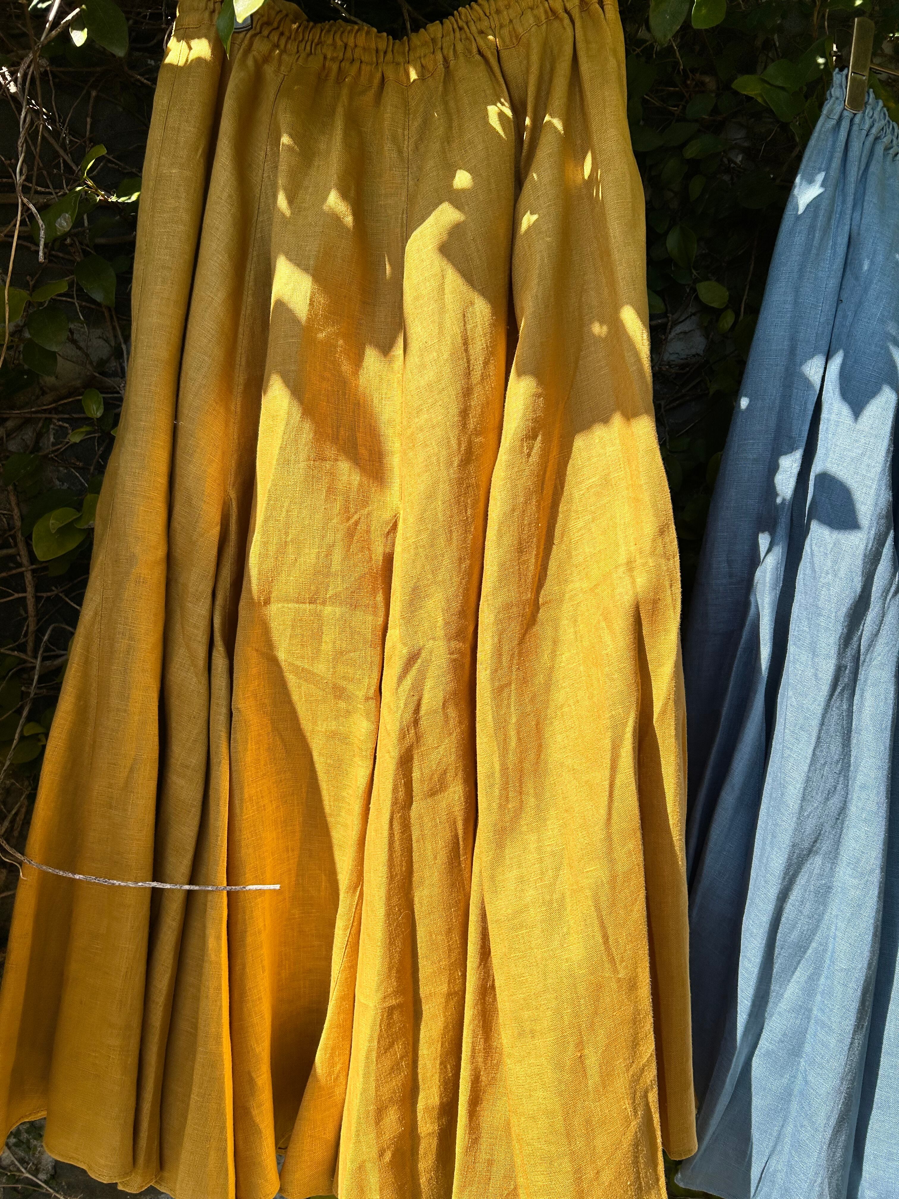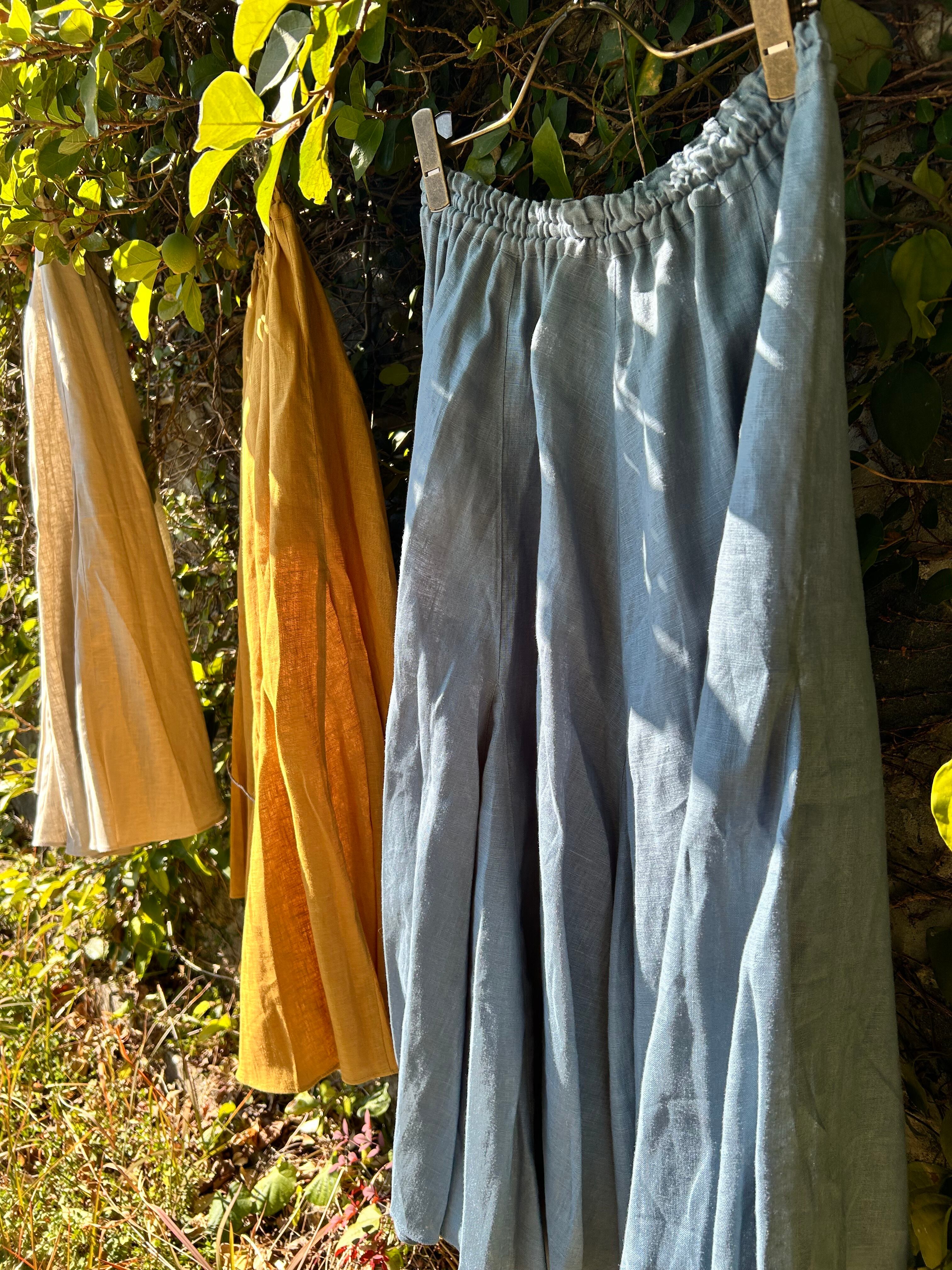 SUEMI 作品。リネン素材のフレアが贅沢なスカート。ウエスト総ゴム。着丈85cm。夏には、Tシャツやカットソー1枚と合わせれば、もうシンプルにおしゃれにまとまるリネンをふんだんに使ったスカートです。丈の長さなど調整いたします。