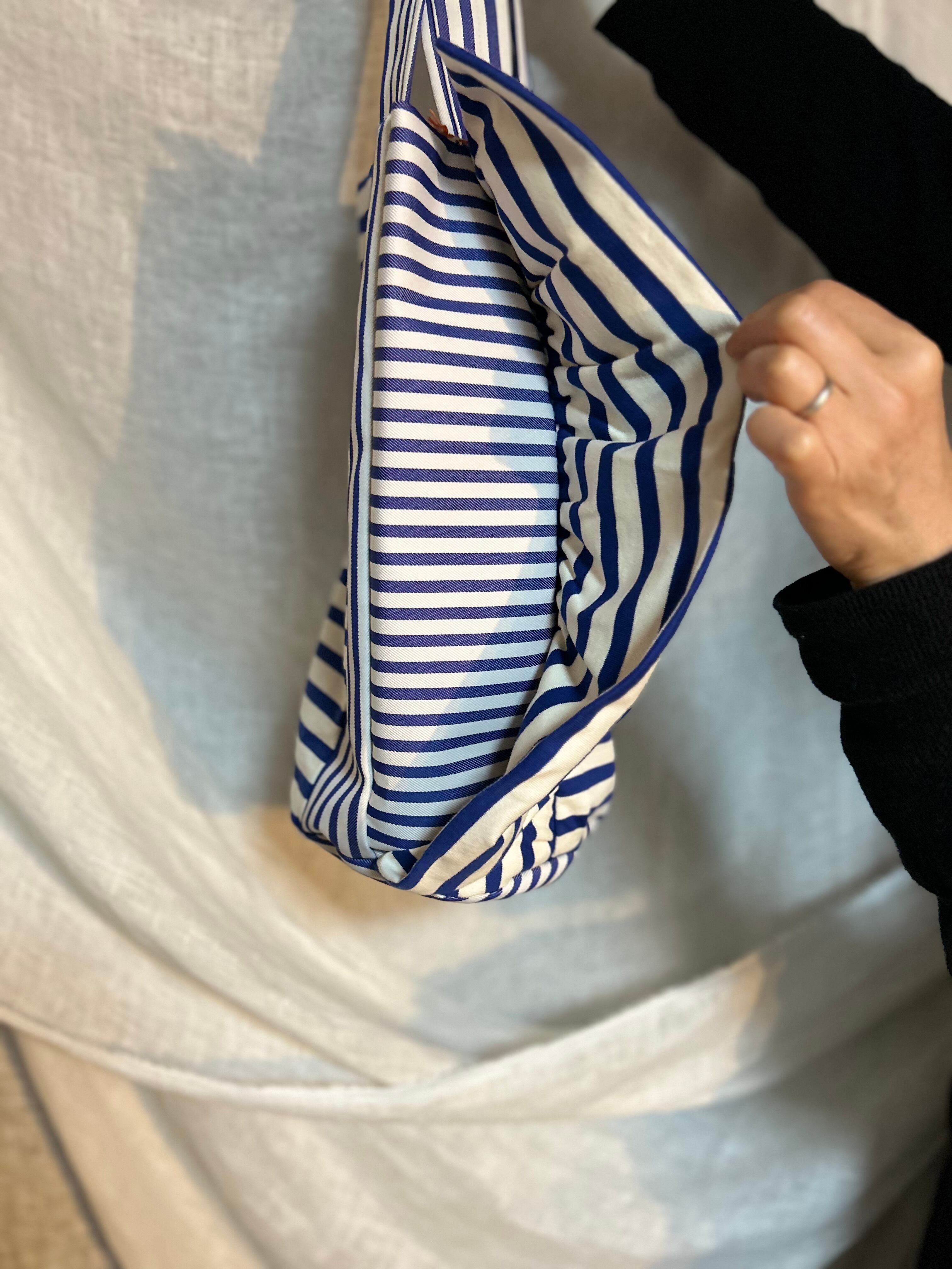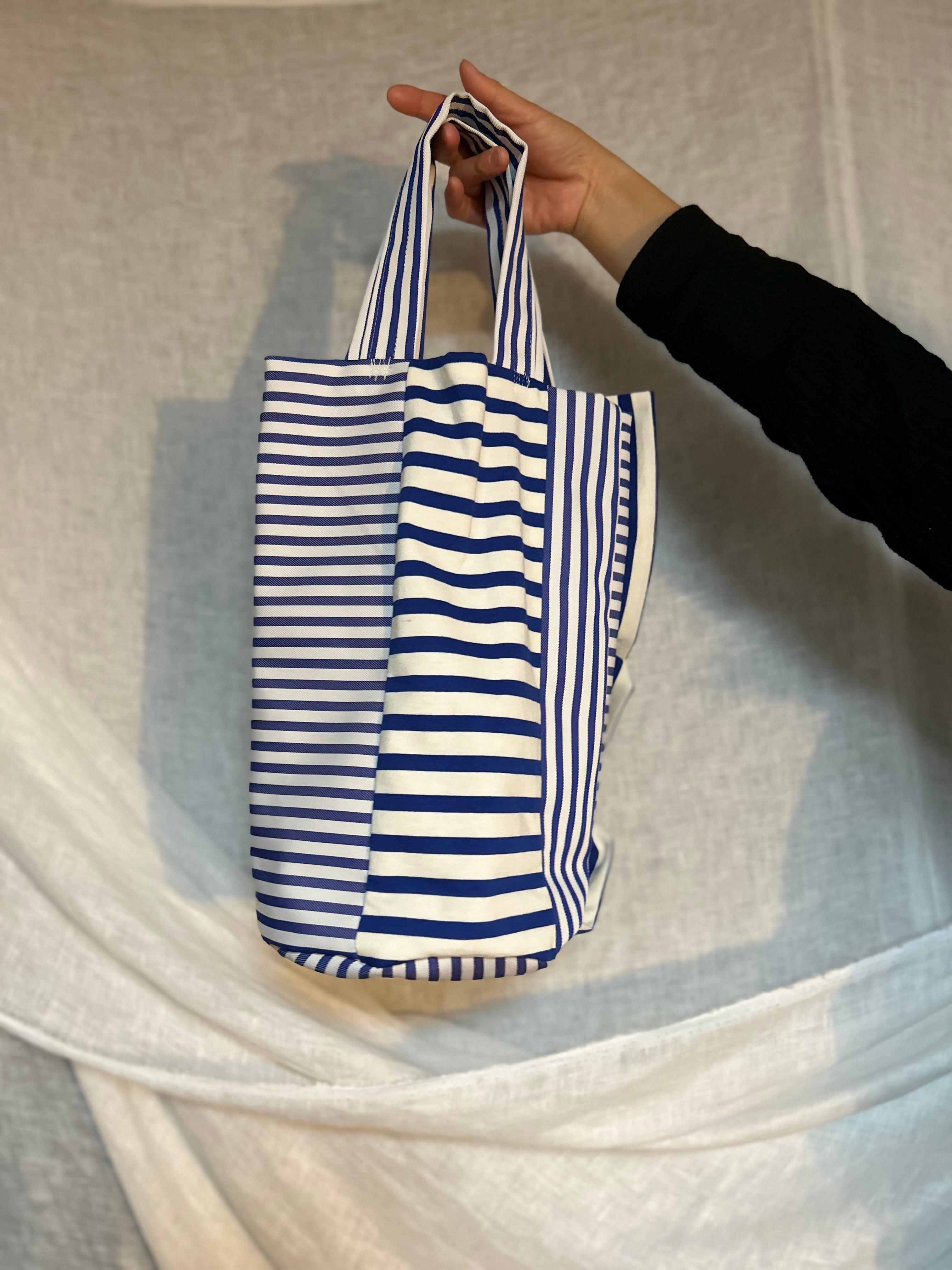 bonbon作品。ブルーのラインの組み合わせが爽やか。さりげないフリルがワンポイントのこれからの季節に使いやすいバッグ。