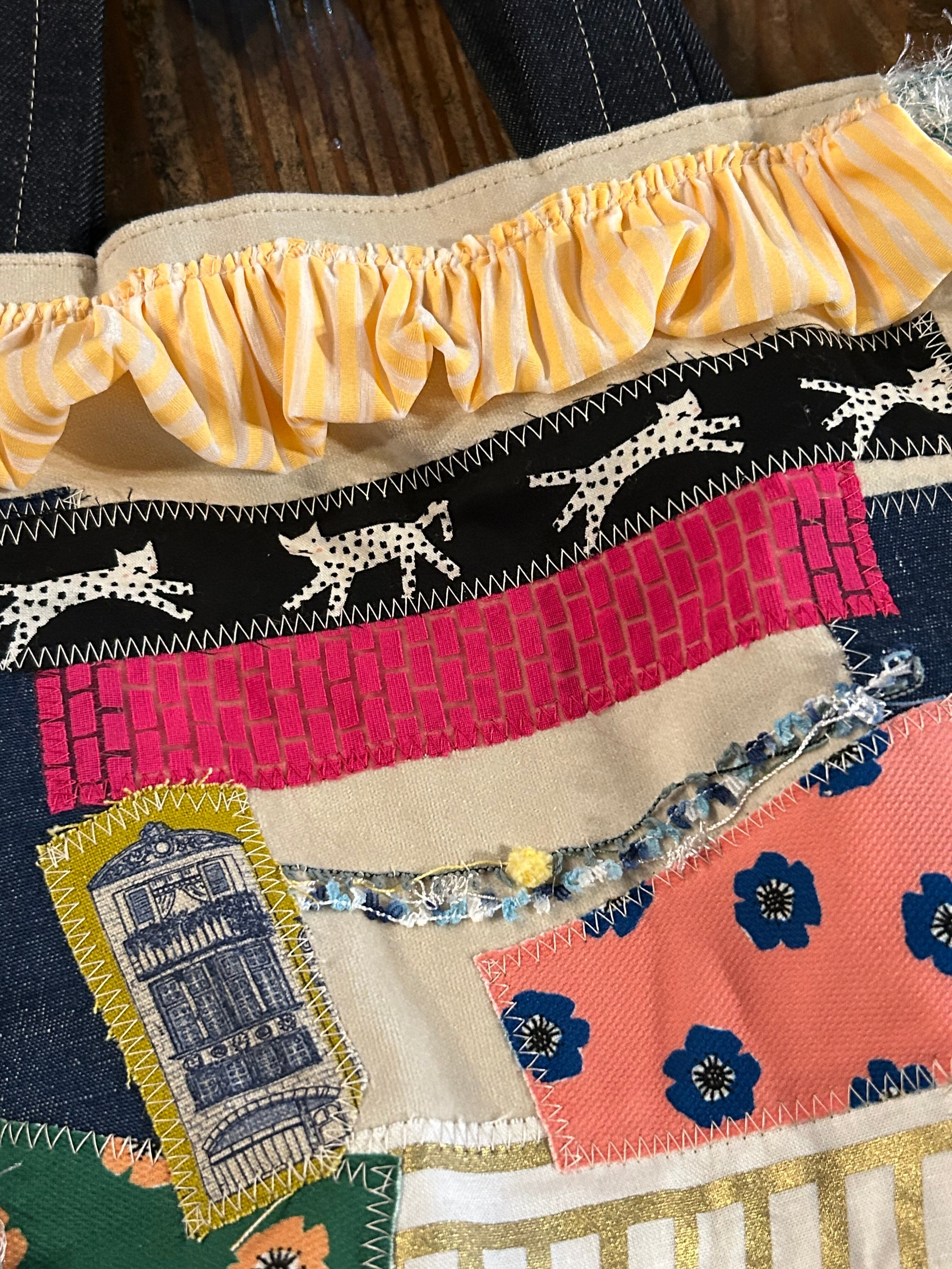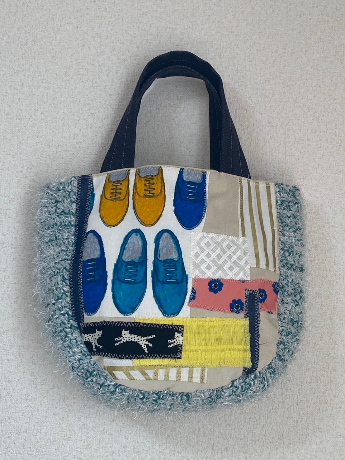 bonbon作品。春の足音バッグと名付けられたこのバッグはなんと言っても、シューズ柄の生地がポイント。サイドと底面の編み生地もbonbonさんらしい春色バッグです。