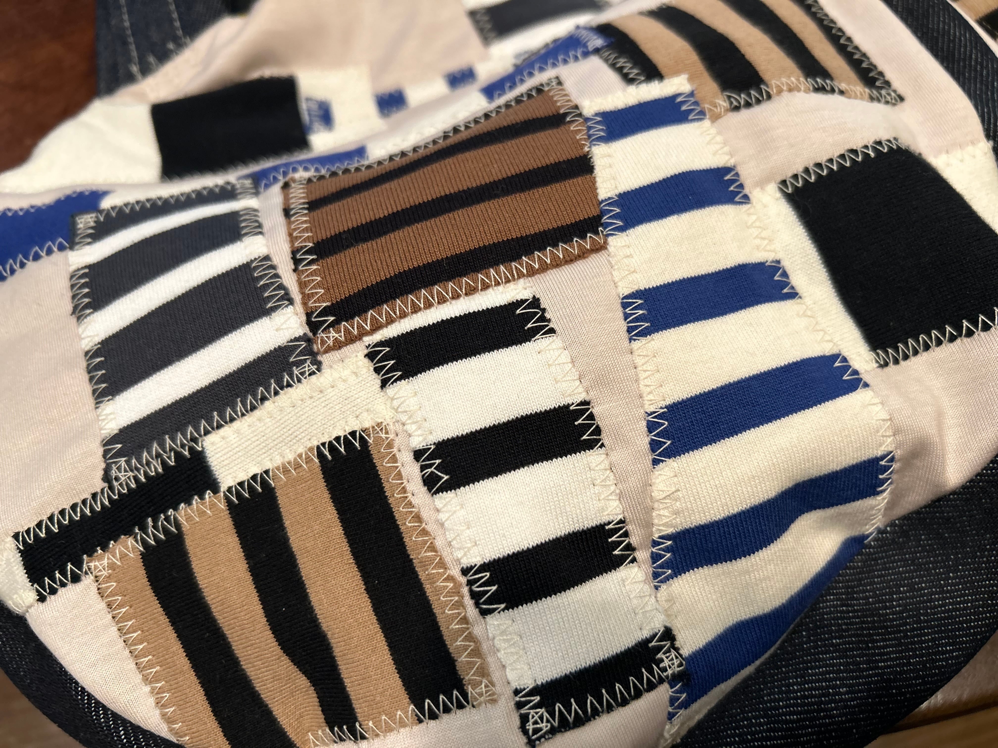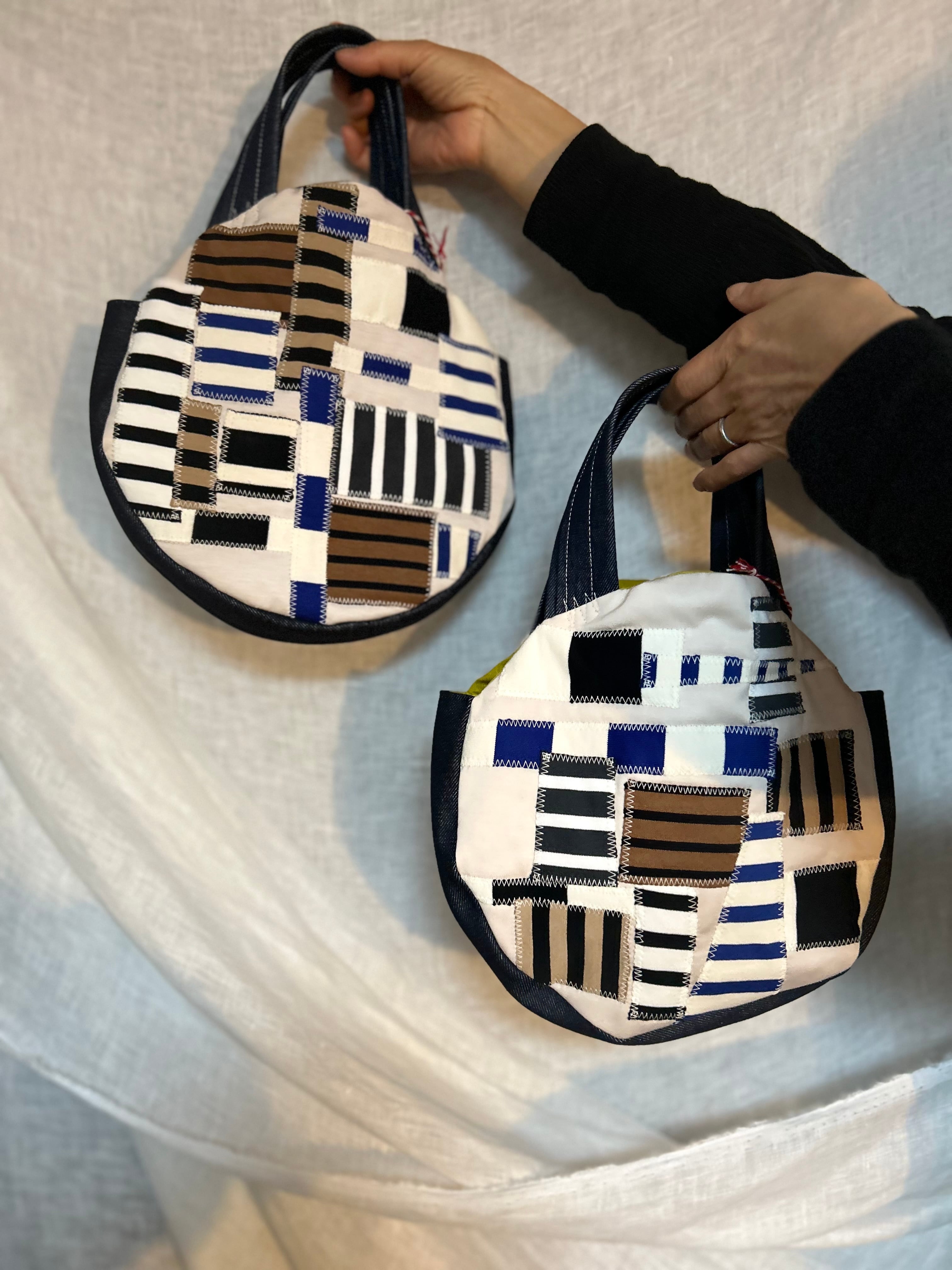 bonbon作品。丸いカタチは人気のデザイン。小さめタイプの白黒のストライプの生地のバッグが2つです。ちょっとしたお出かけやセカンドバッグに活躍しそうな大きさです。