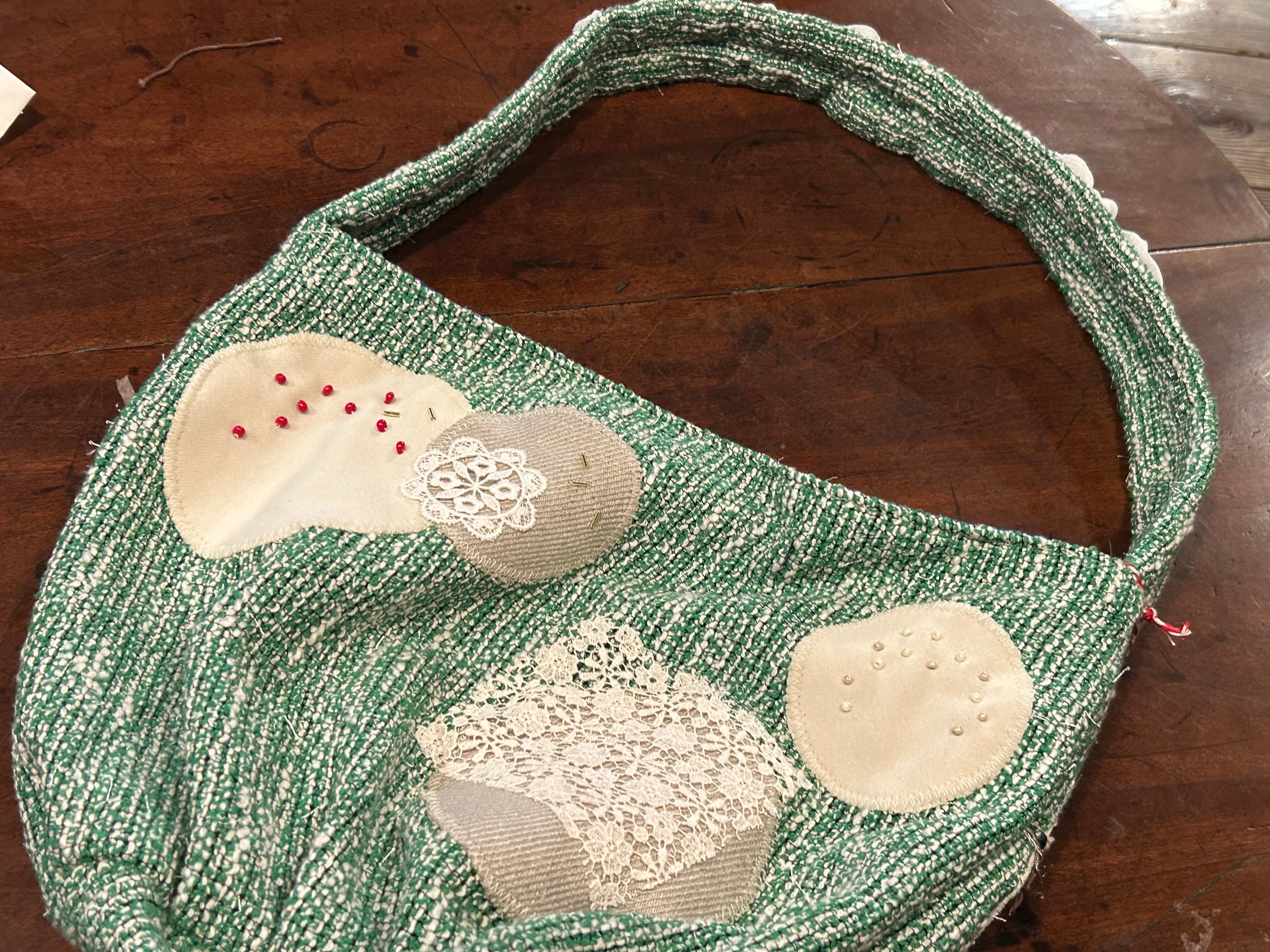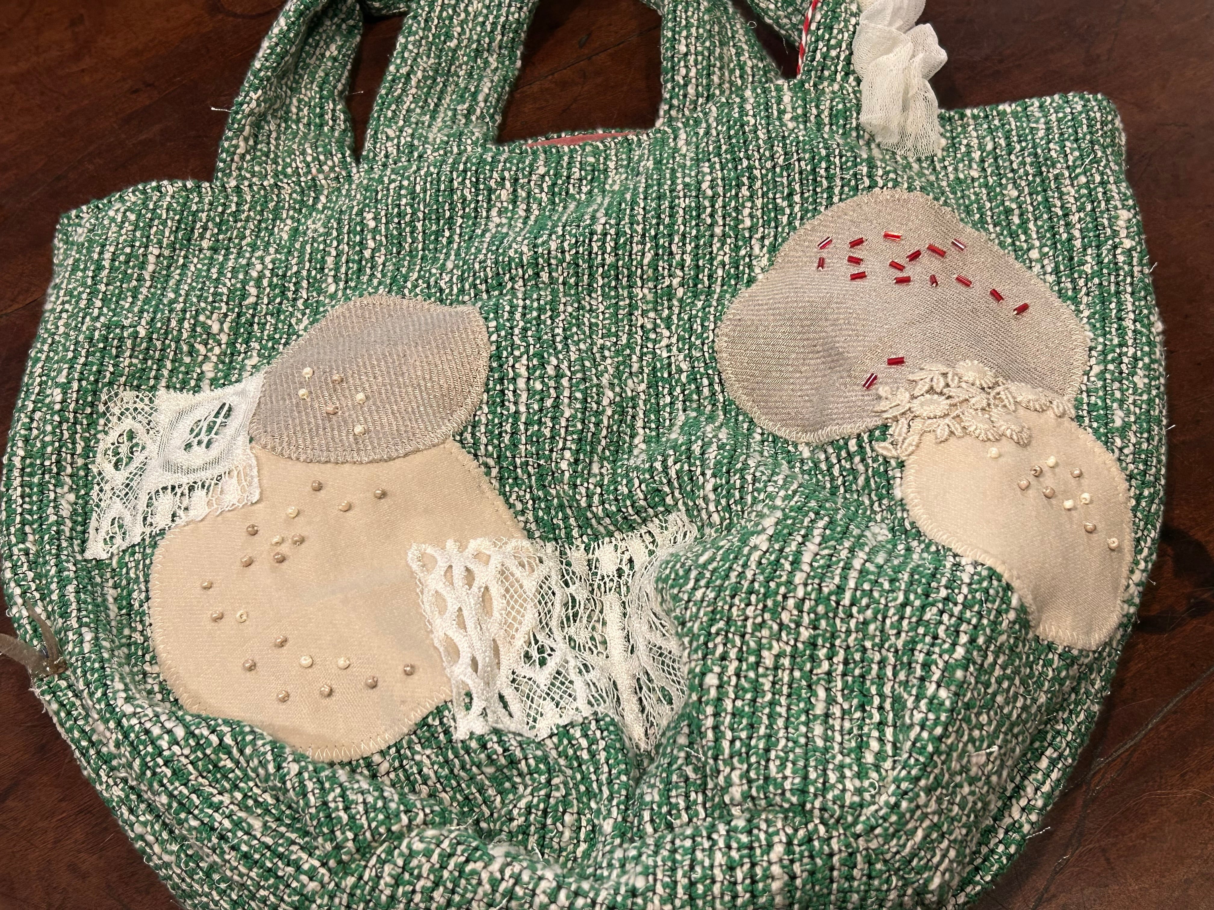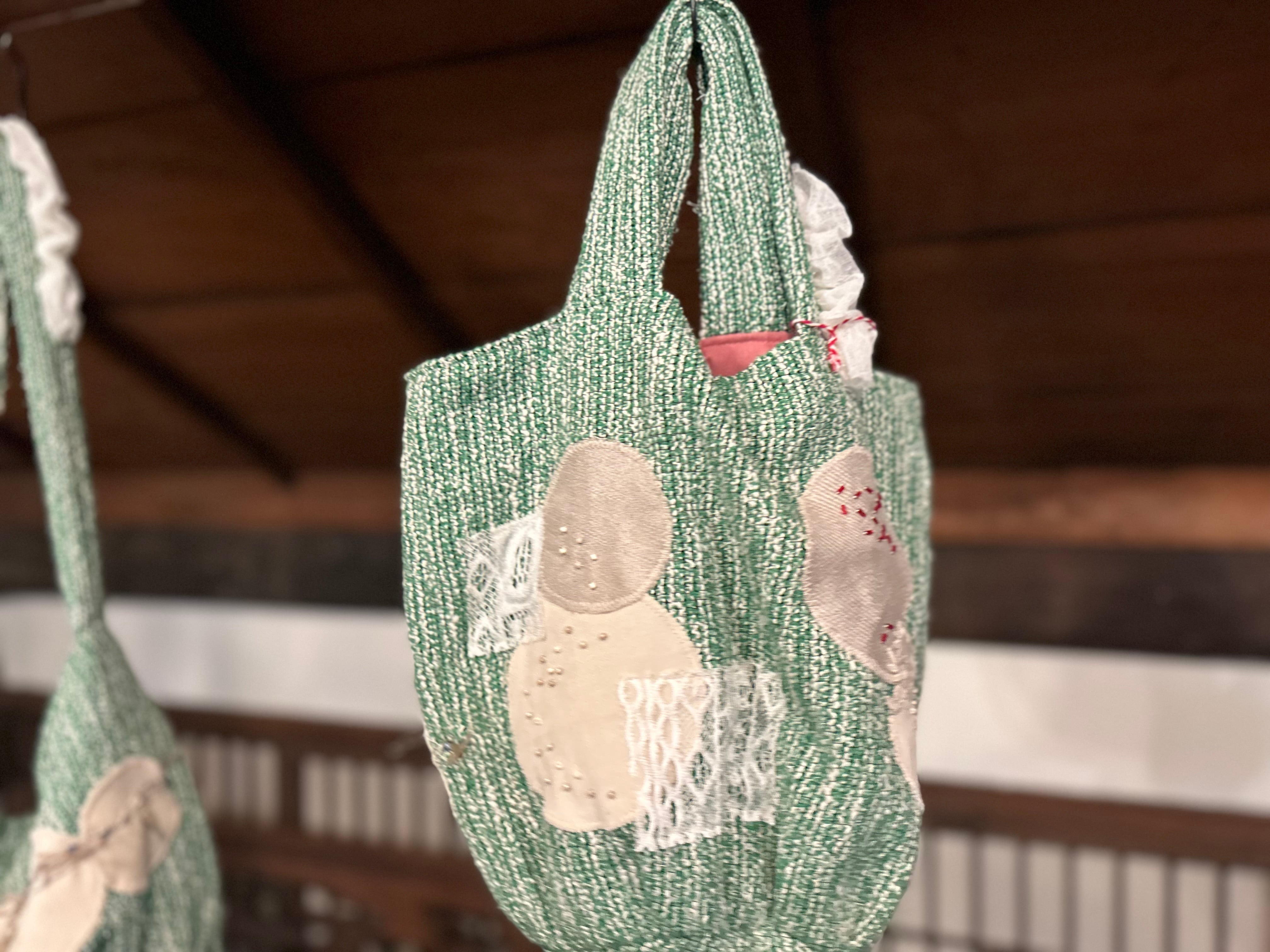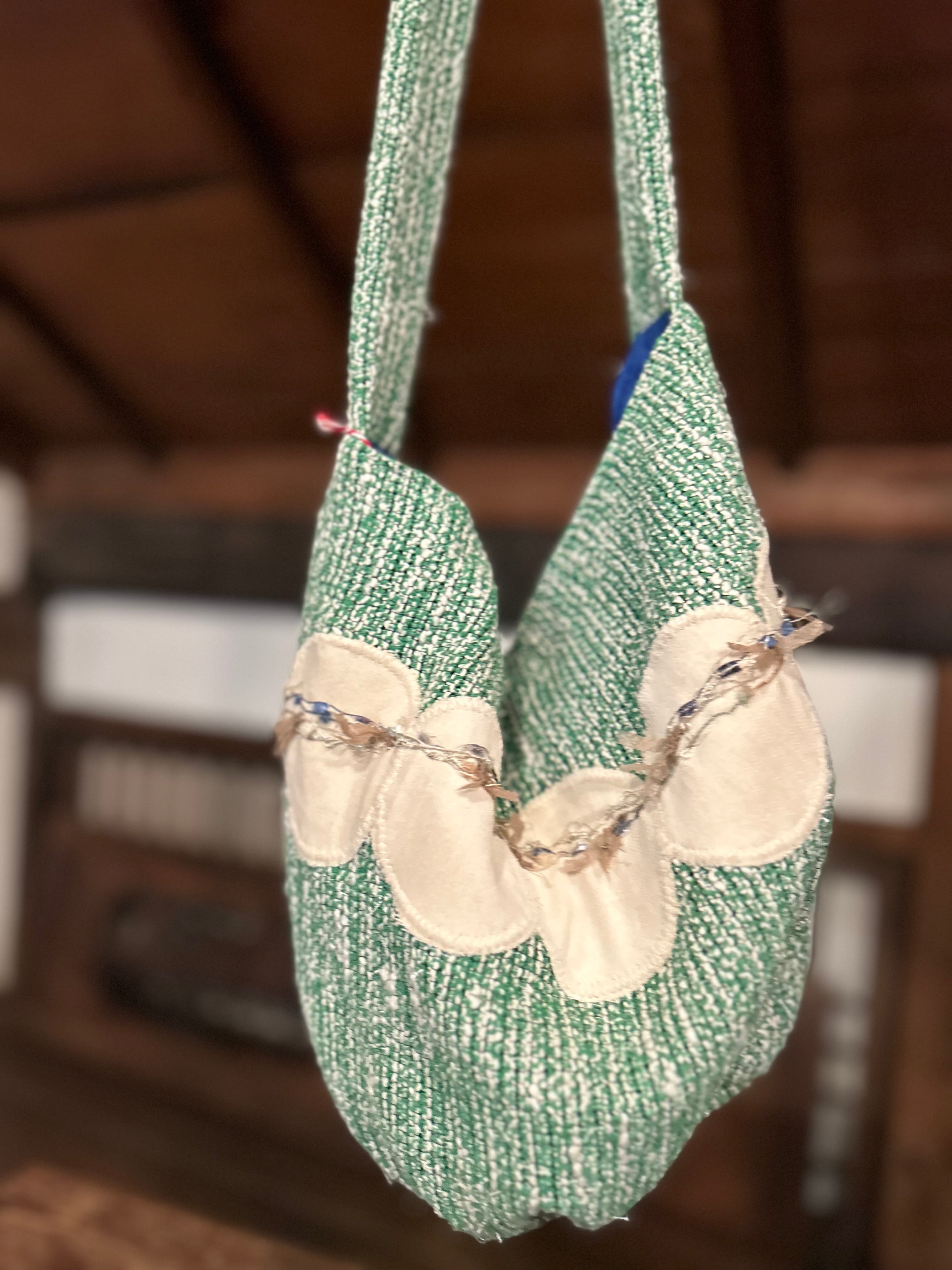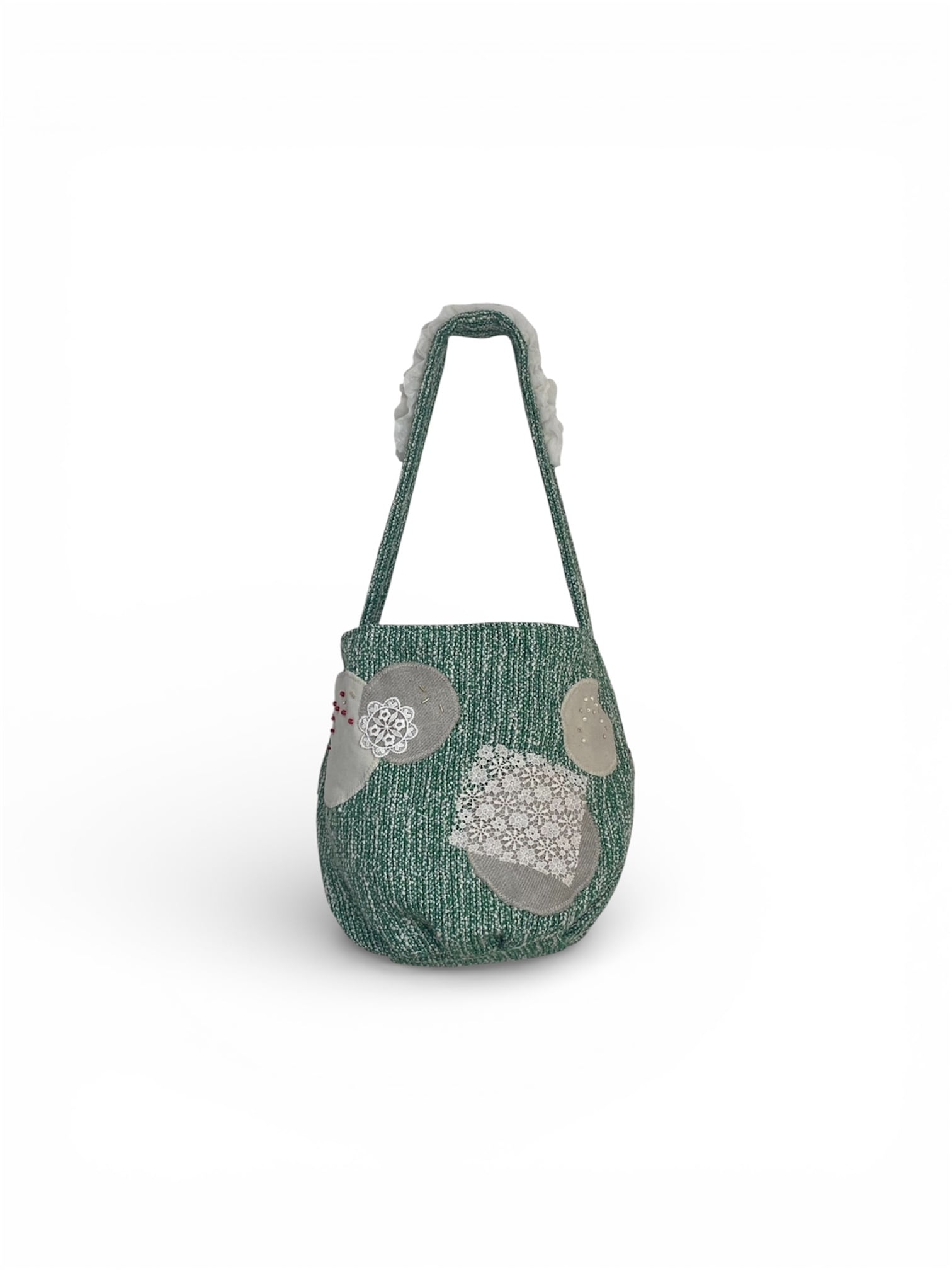 bonbon作品。全体的なグリーンの生地に白い丸いパッチ、シルバーの糸飾り、赤いビーズなどがとっても素敵なお出かけしたくなるバッグ。丸っこいカタチや内側の生地の色も全体的にかわいくて、テンション上がります。