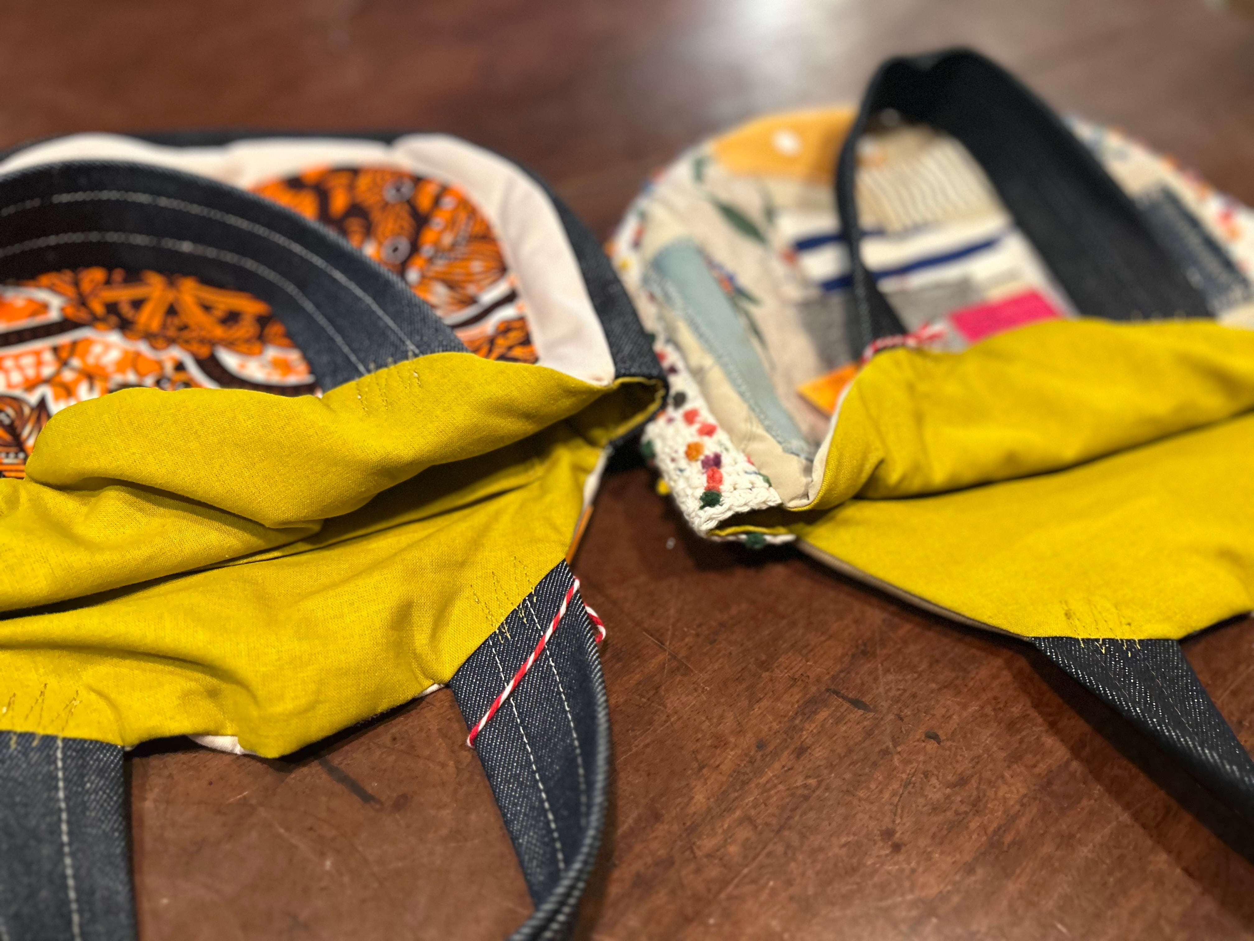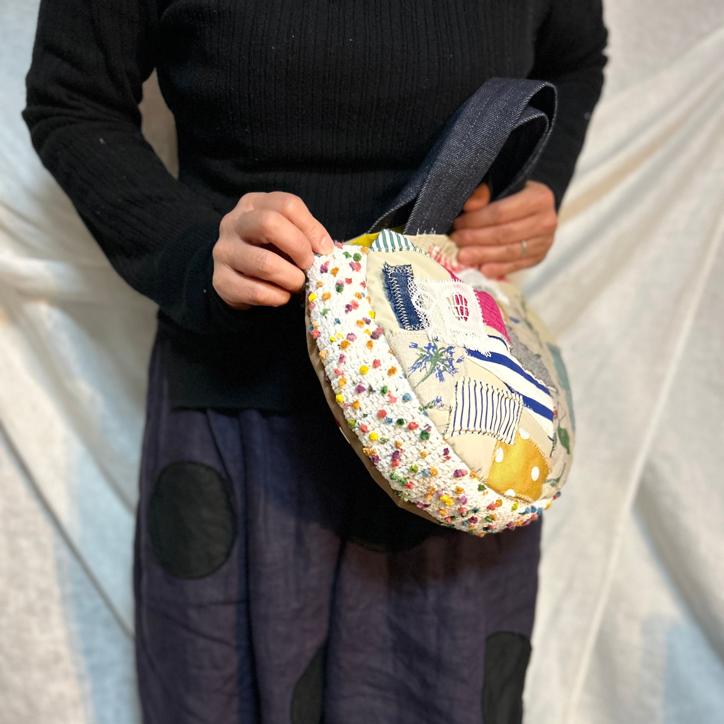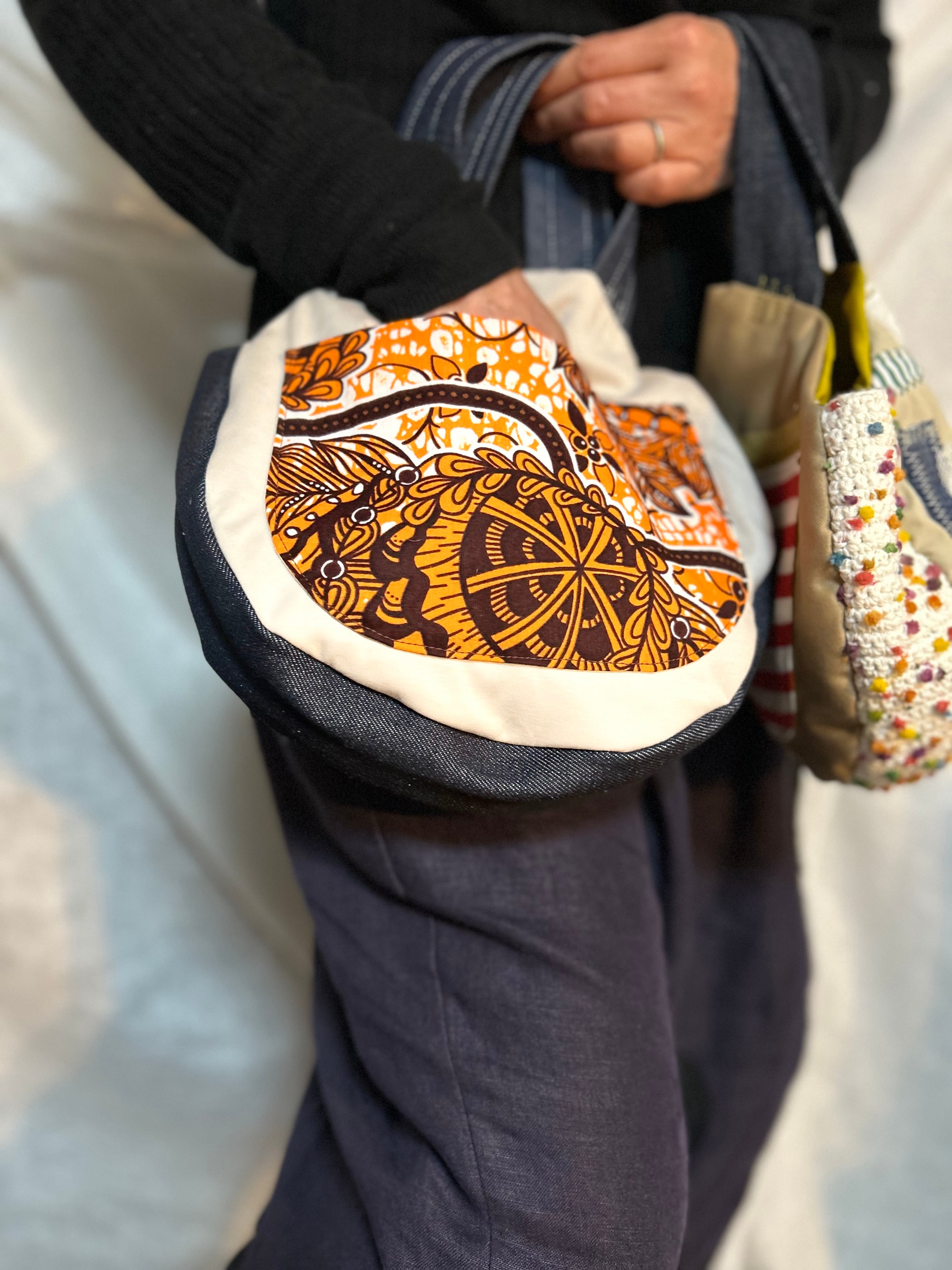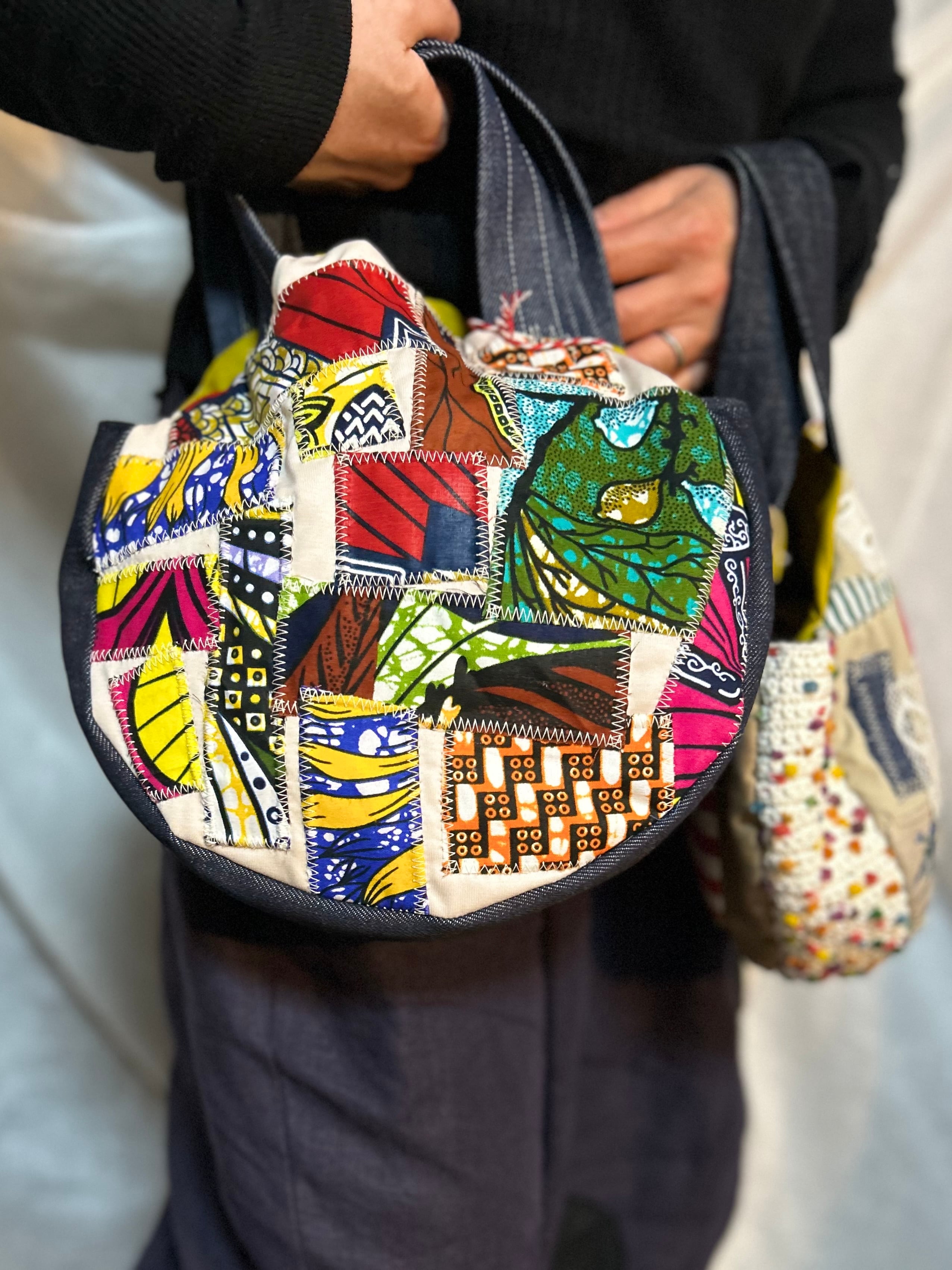 bonbon作品。丸いカタチは人気のデザイン。小さめタイプが2つです。アフリカンプリントと、いろんな生地のパッチワーク。ちょっとしたお出かけやセカンドバッグに活躍しそうな大きさです。