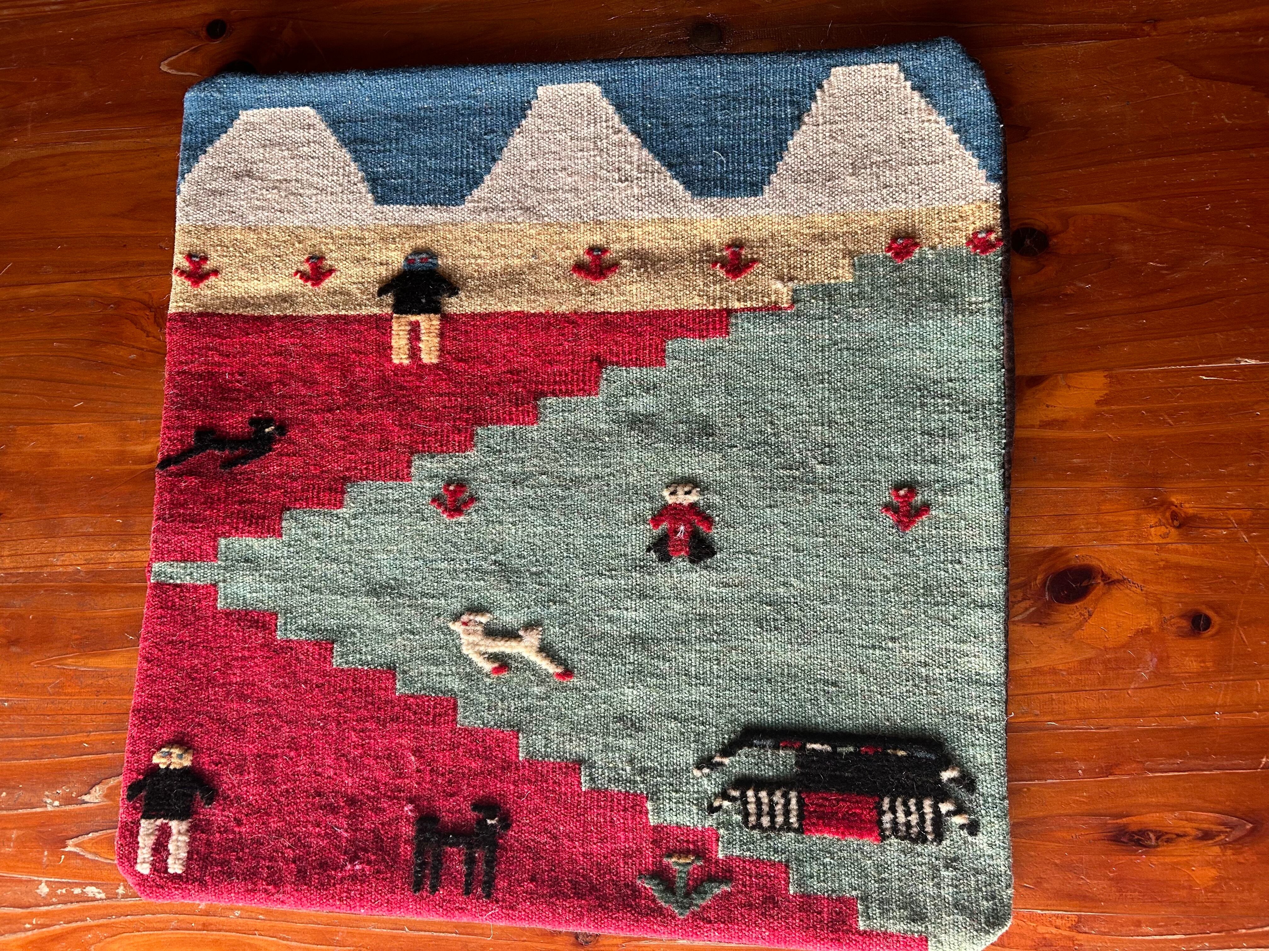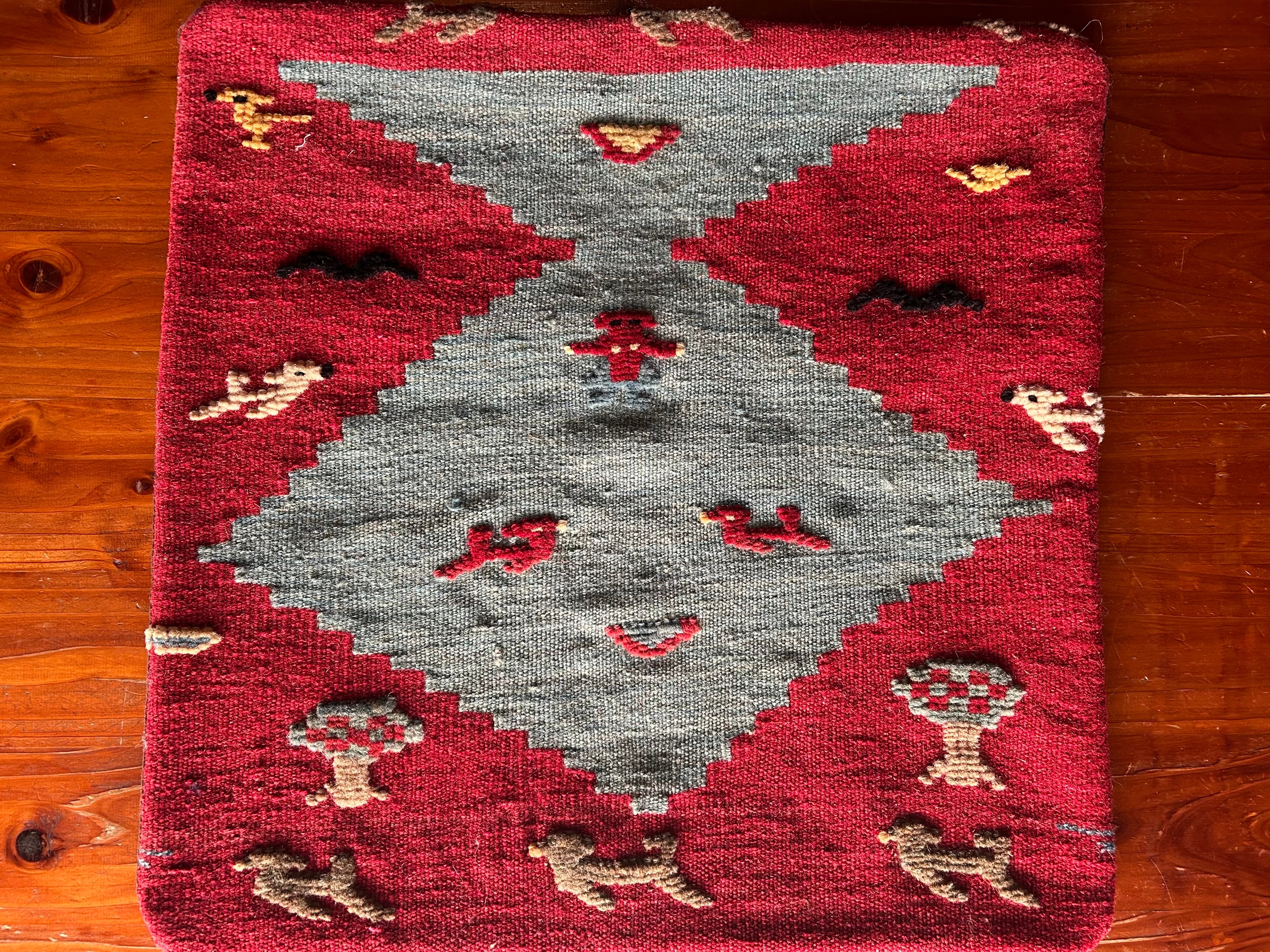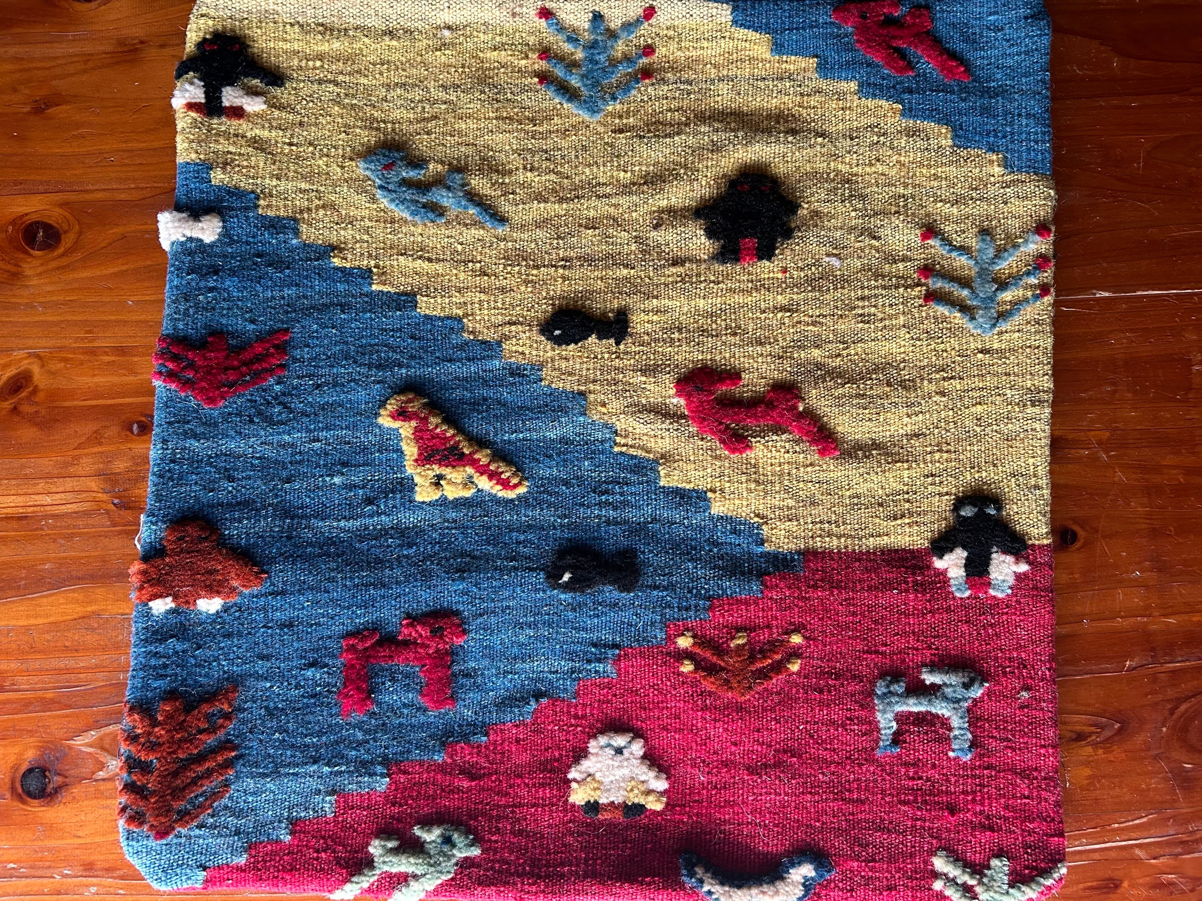 サイズ45✖️45cm。シラーズとは産地のこと。ギャベの産地として有名な産地イランのシラーズで作られたクッションカバー。全て一点もの。ウール100%。洗う時は、お湯は使わずに、水洗いでお願いします。フィラーはついてません。